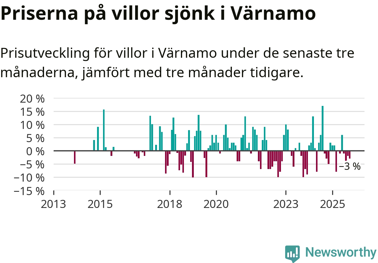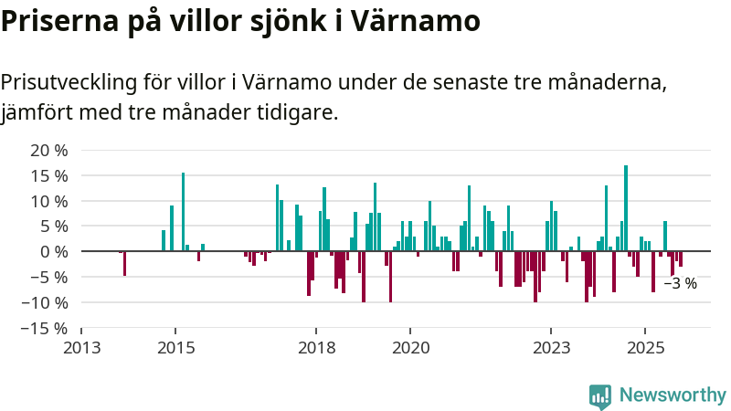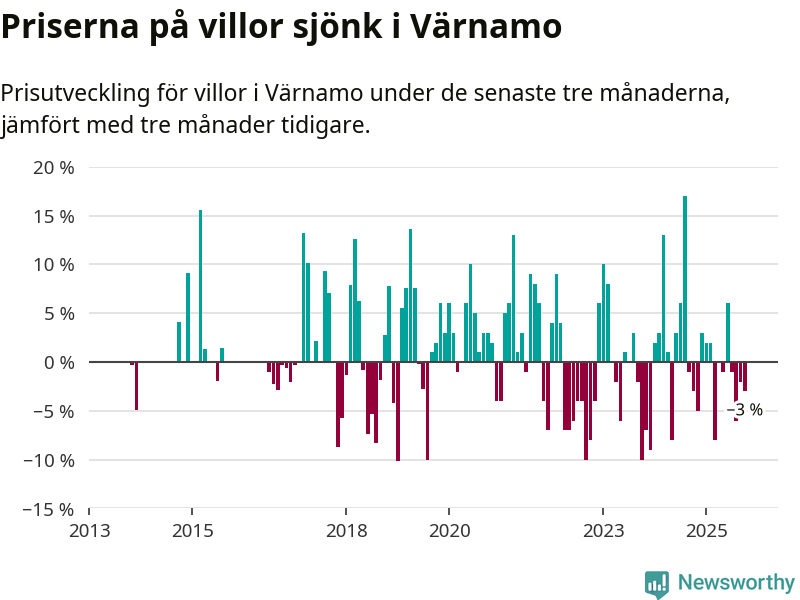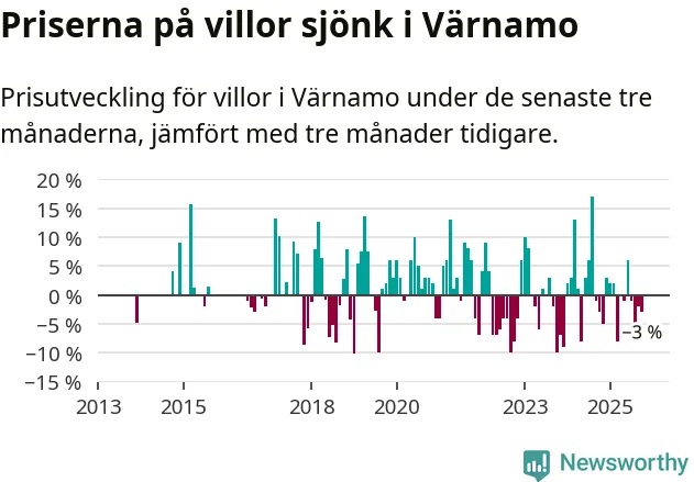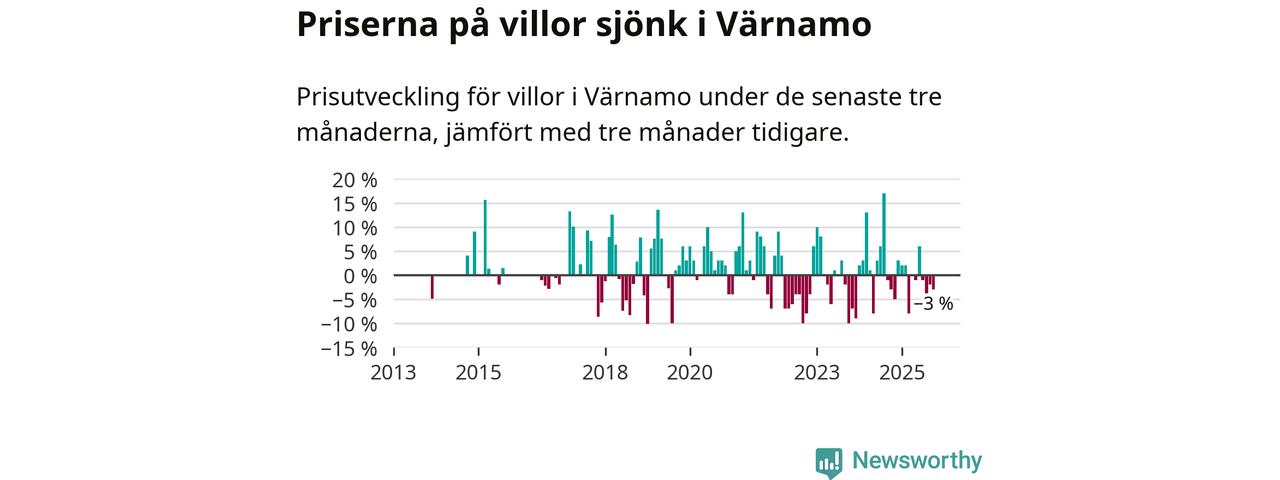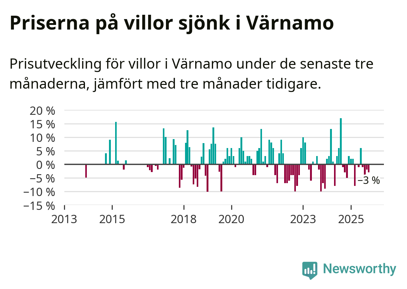 Villapriserna har gått ner i Värnamo kommun. Medelpriset på försäljningarna under de senaste tre månaderna visar på en nedgång med 3 procent.