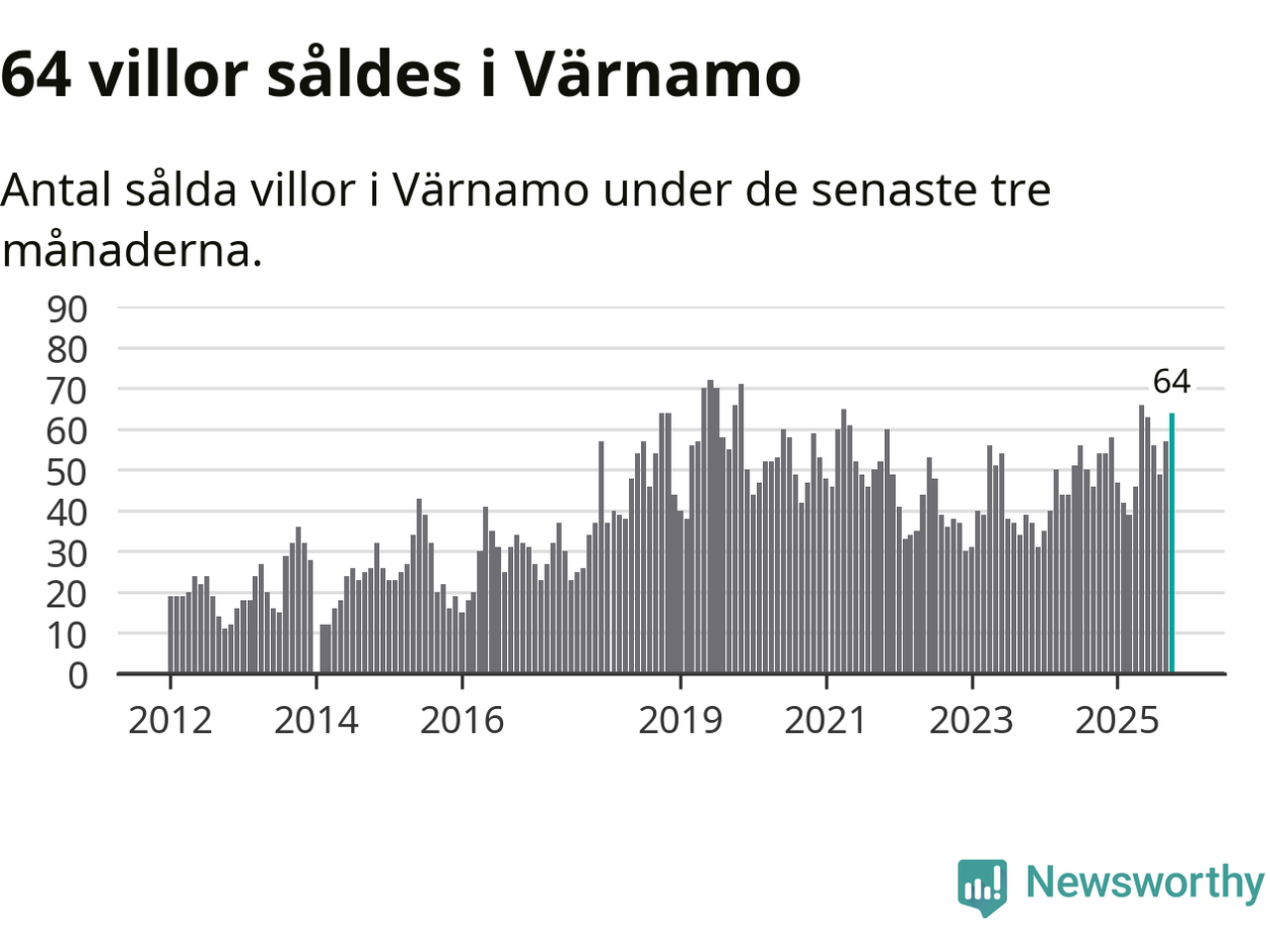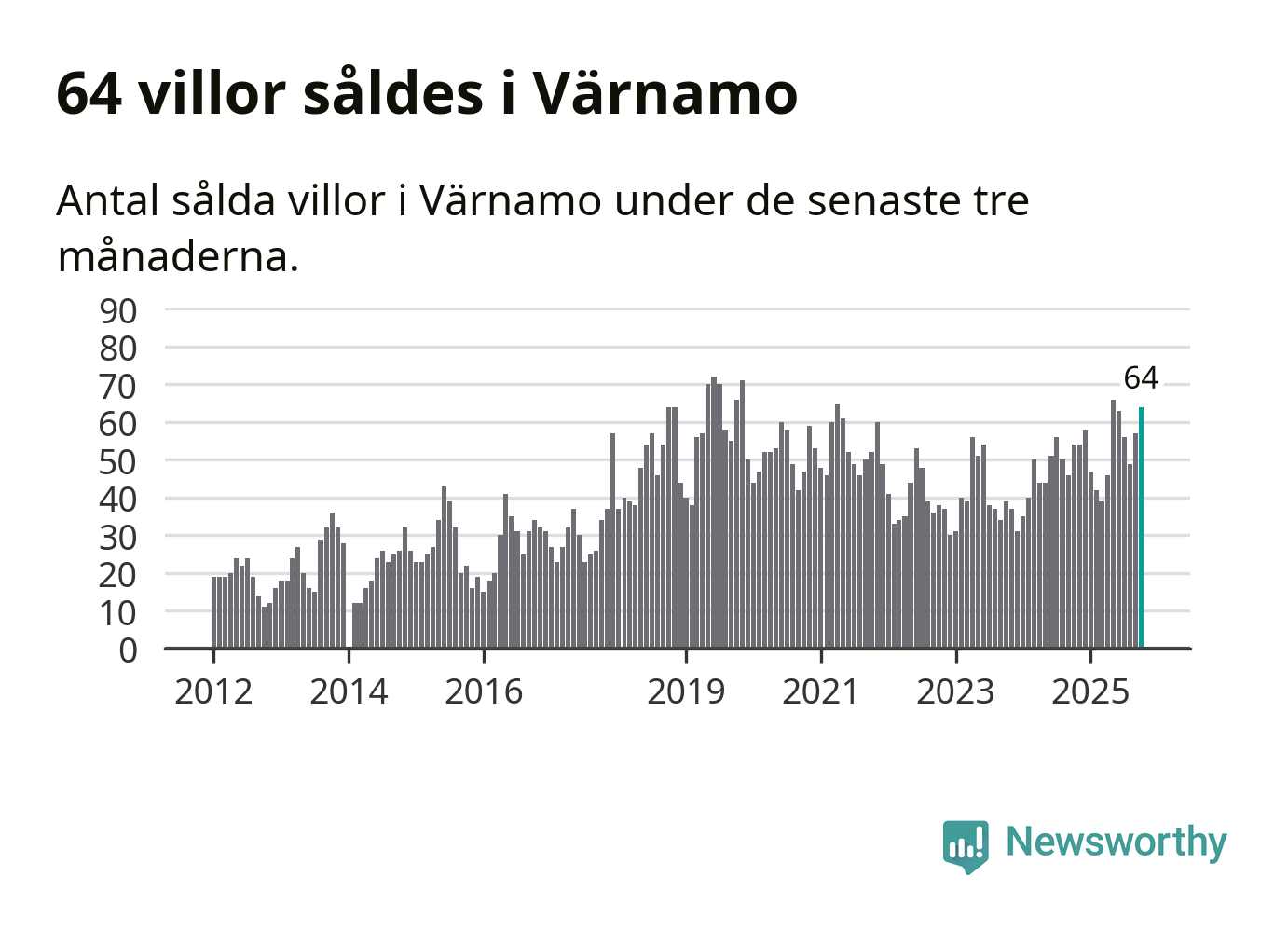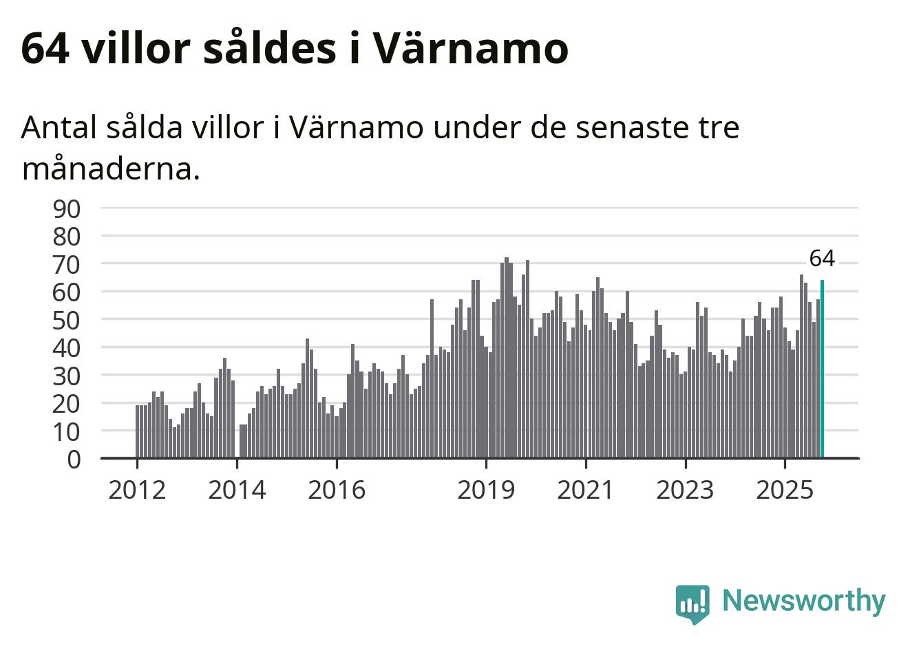 Sammanlagt såldes 64 villor i Värnamo kommun mellan augusti och oktober till ett genomsnittligt pris på 2,6 miljoner kronor. I fjol gjordes 54 affärer vid den här tiden på året.