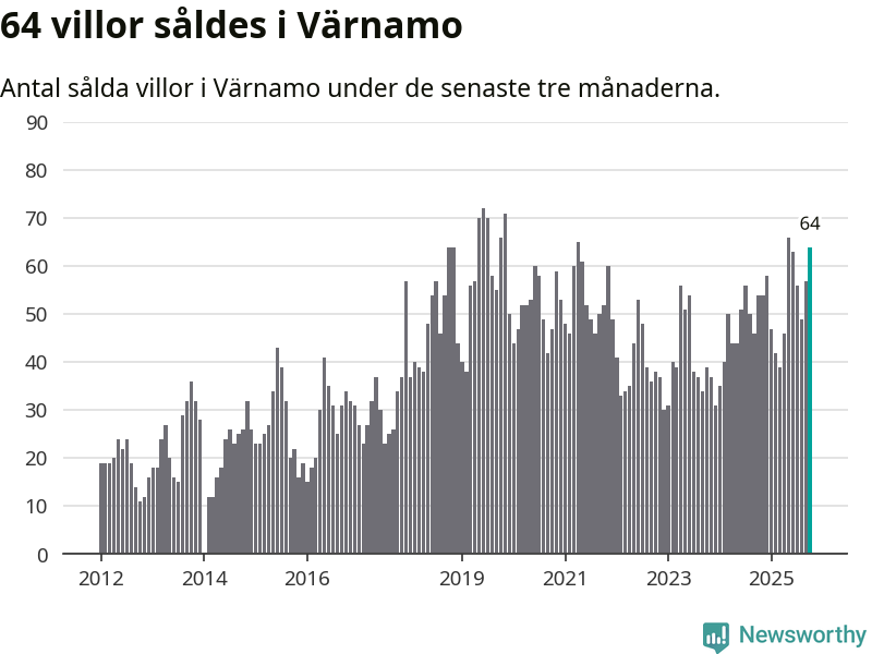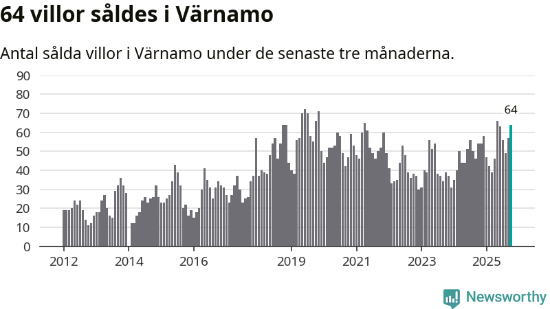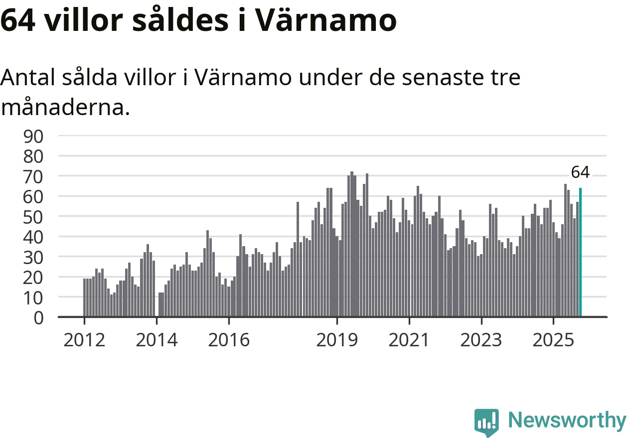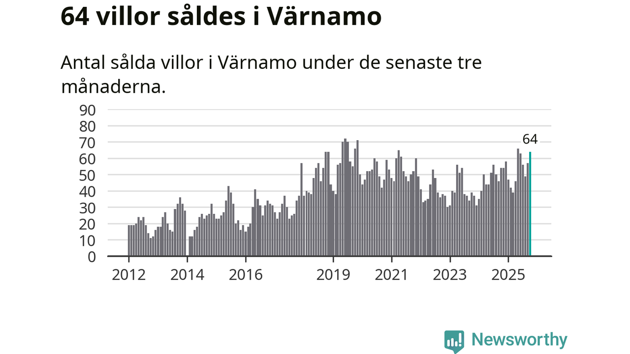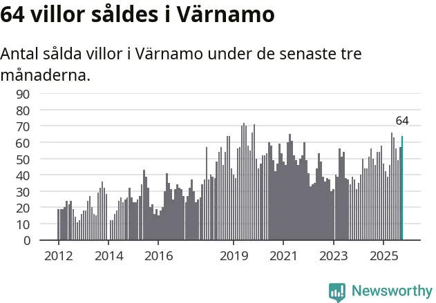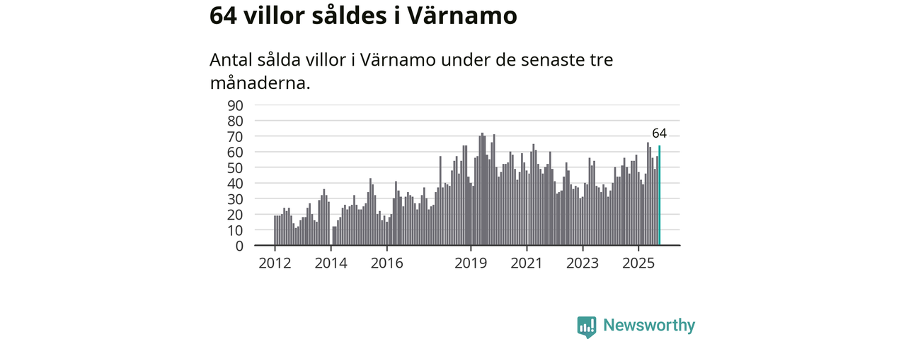 Sammanlagt såldes 64 villor i Värnamo kommun mellan augusti och oktober till ett genomsnittligt pris på 2,6 miljoner kronor. I fjol gjordes 54 affärer vid den här tiden på året.