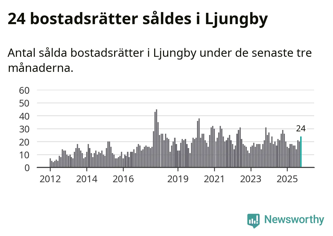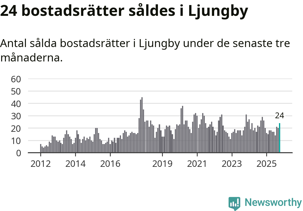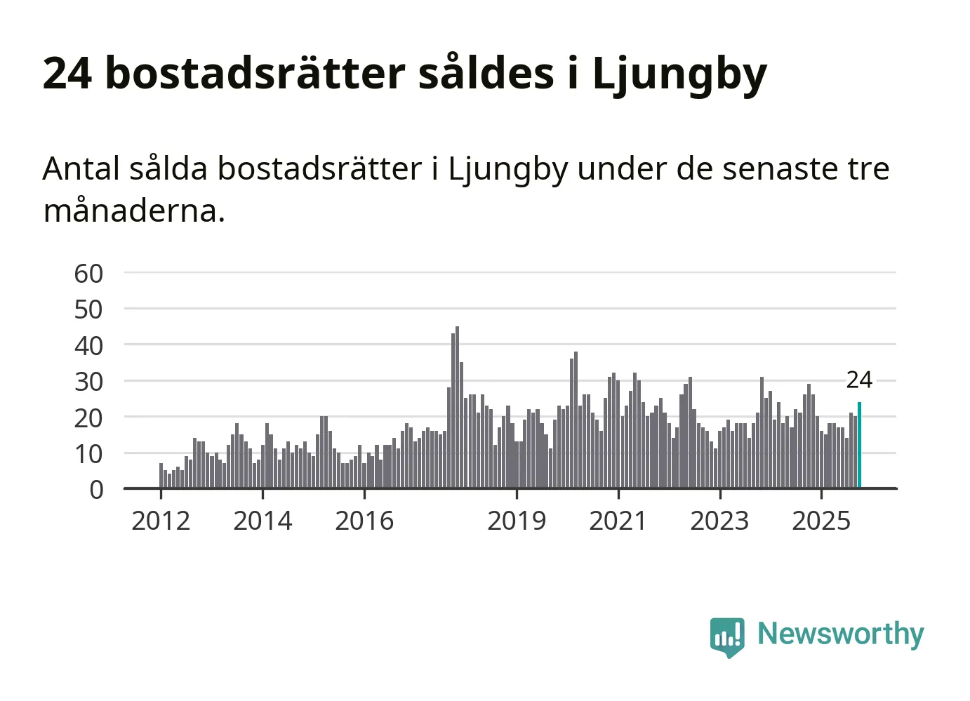 Mellan augusti och oktober gjordes sammanlagt 24 affärer med bostadsrätter i Ljungby kommun. Det kan jämföras med 29 vid motsvarande tid i fjol.