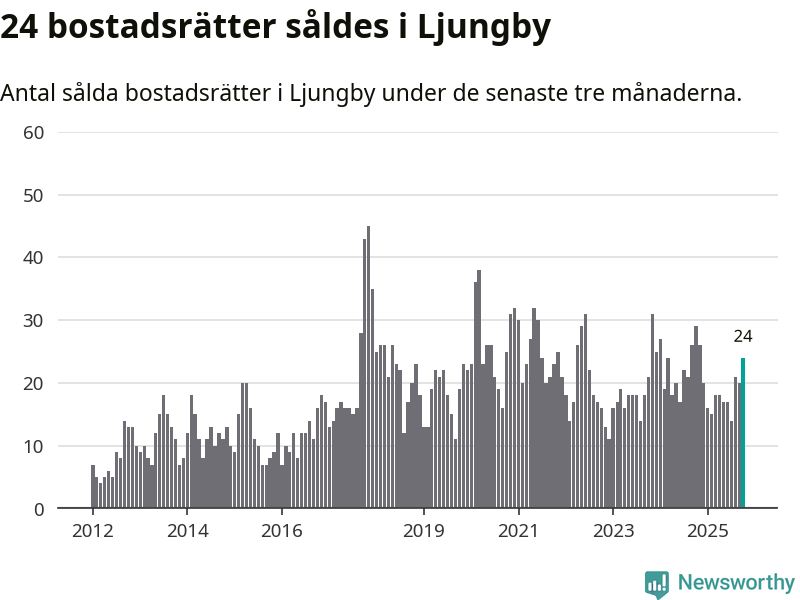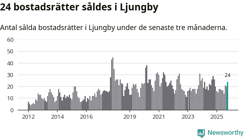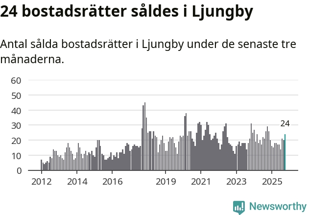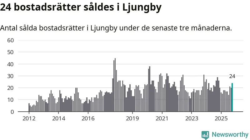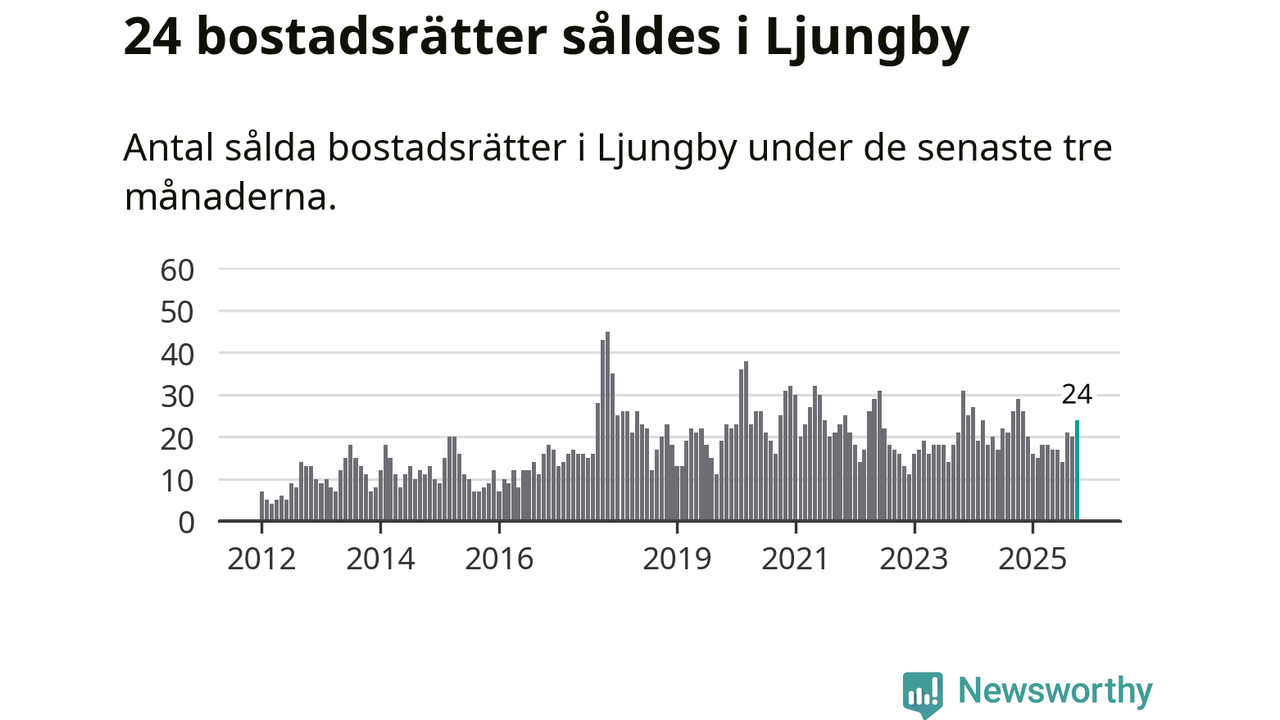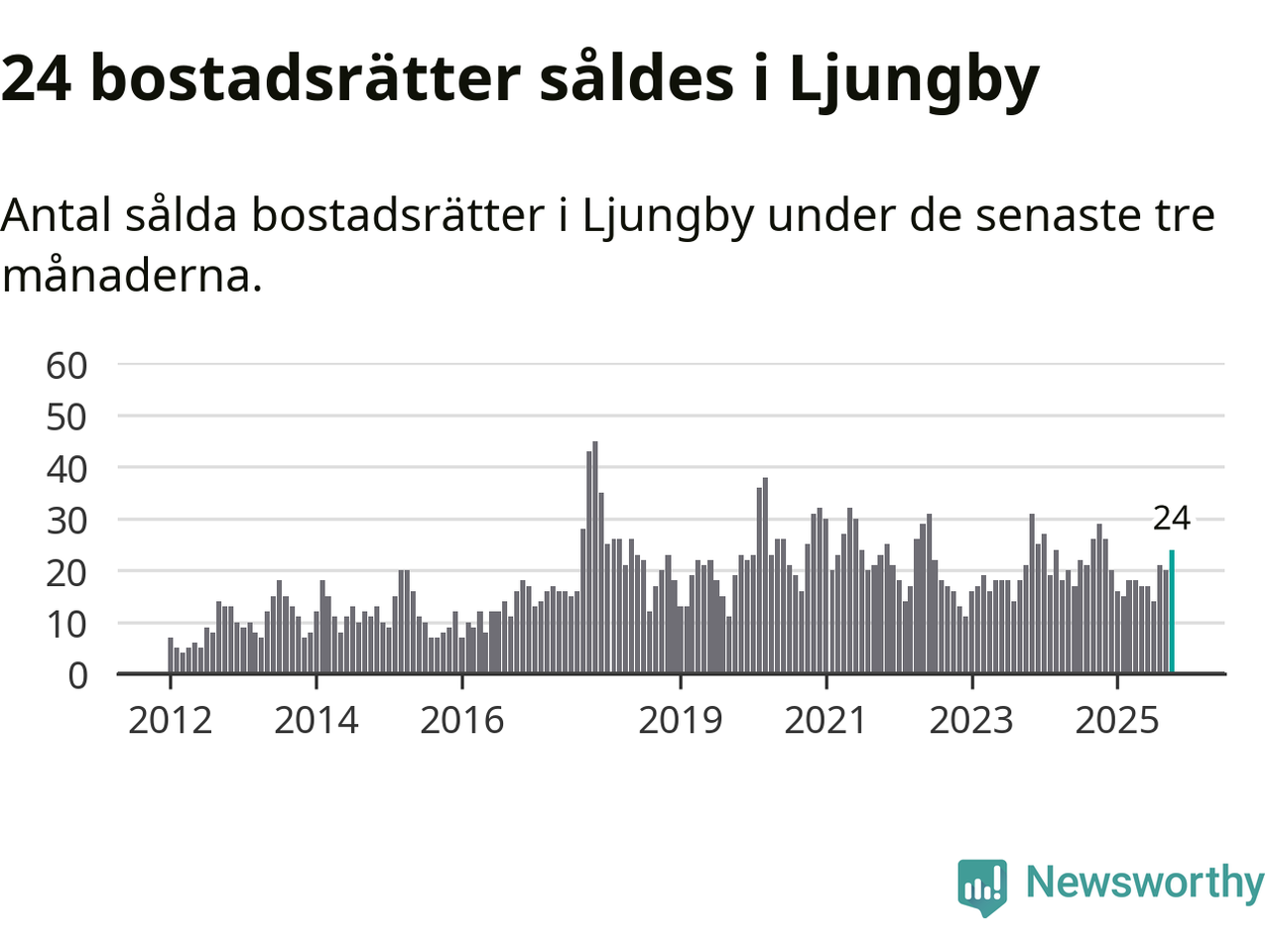 Mellan augusti och oktober gjordes sammanlagt 24 affärer med bostadsrätter i Ljungby kommun. Det kan jämföras med 29 vid motsvarande tid i fjol.