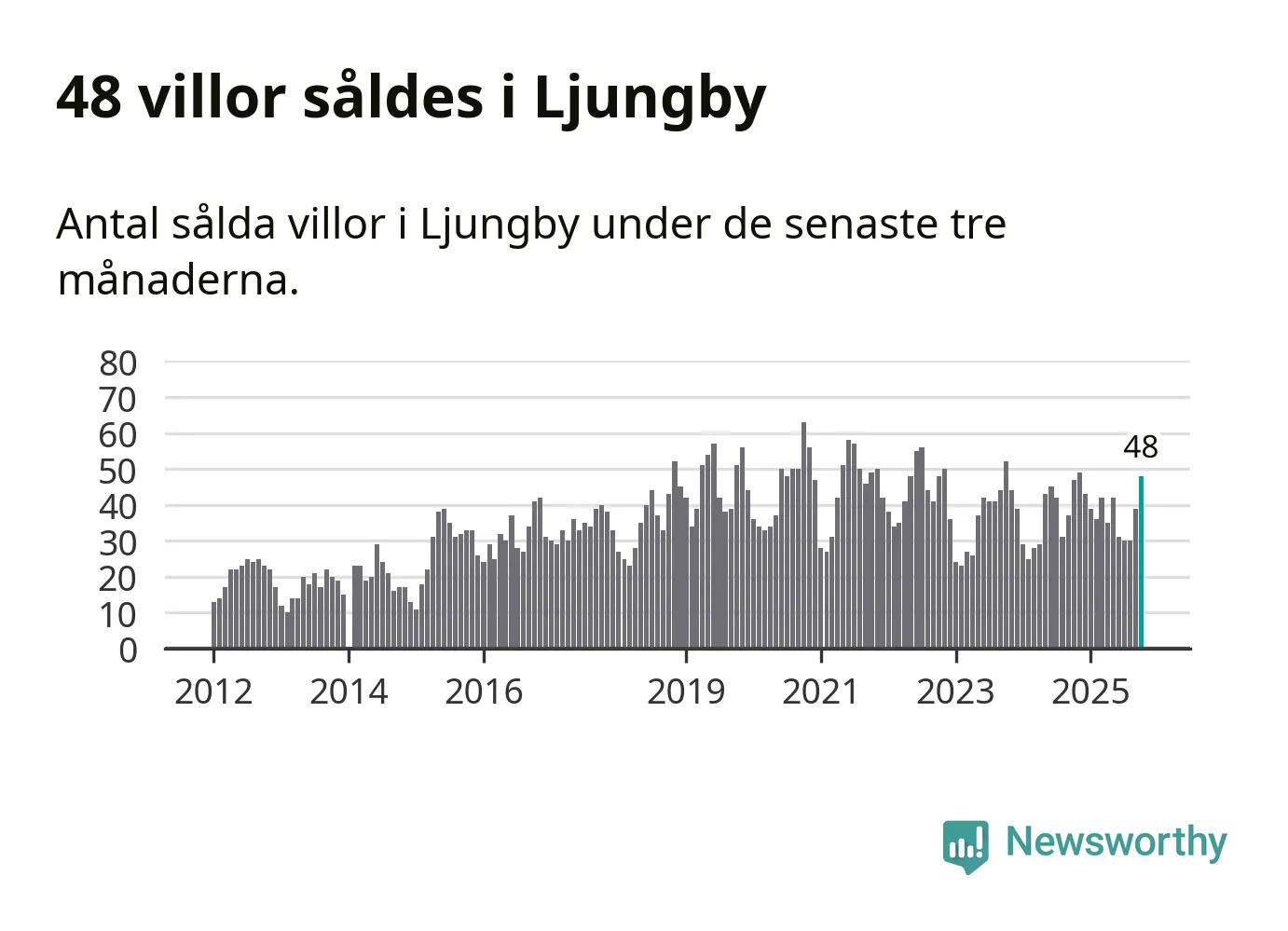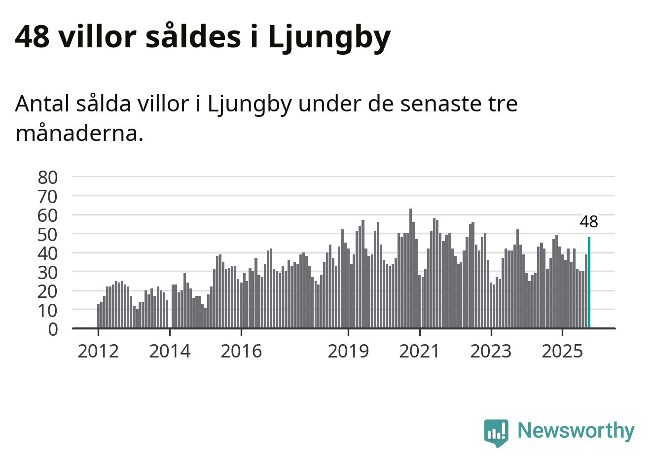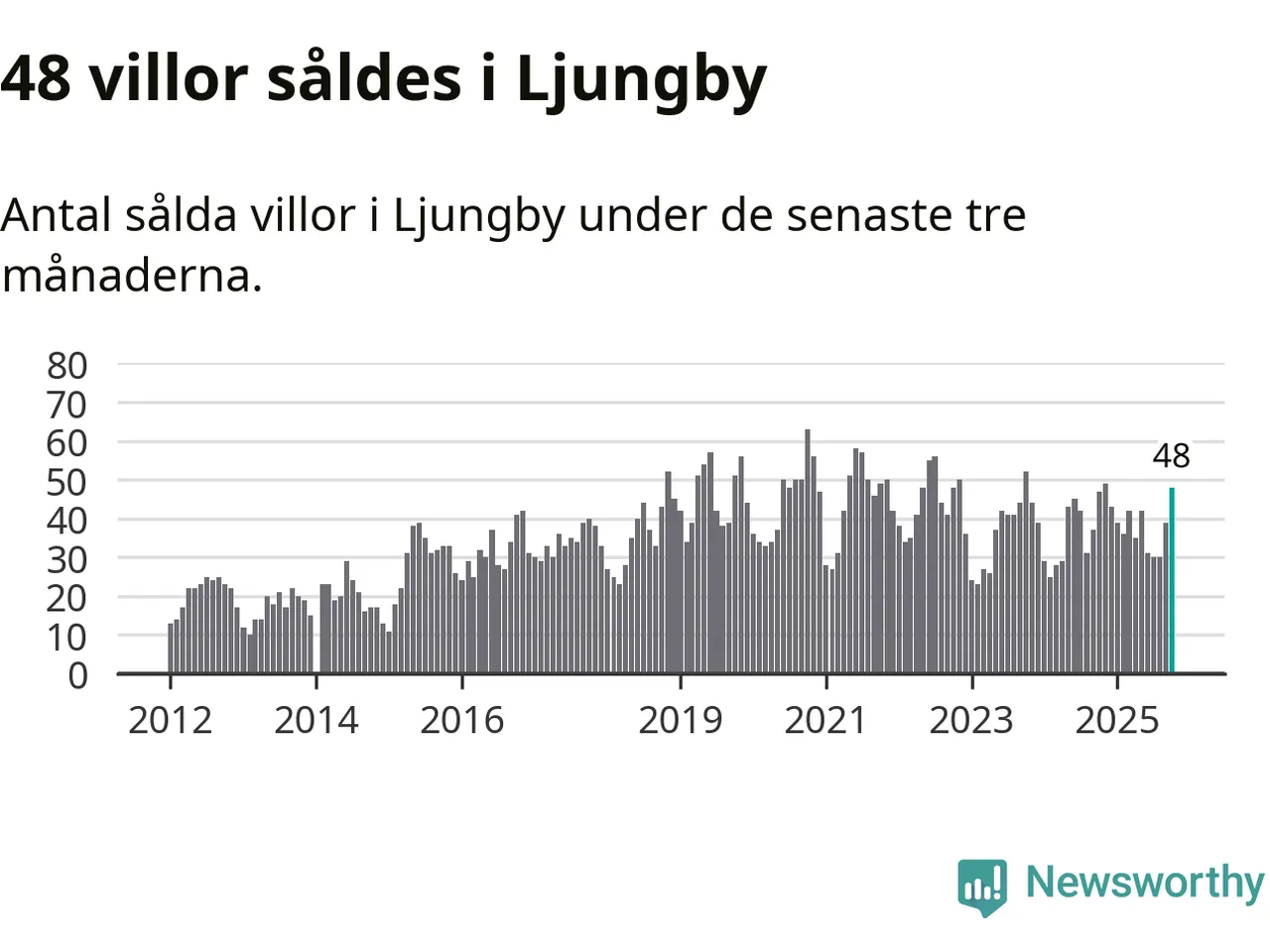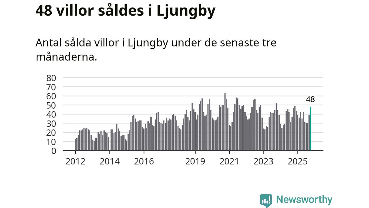 Sammanlagt såldes 48 villor i Ljungby kommun mellan augusti och oktober till ett genomsnittligt pris på 2,0 miljoner kronor. I fjol gjordes 47 affärer vid den här tiden på året.