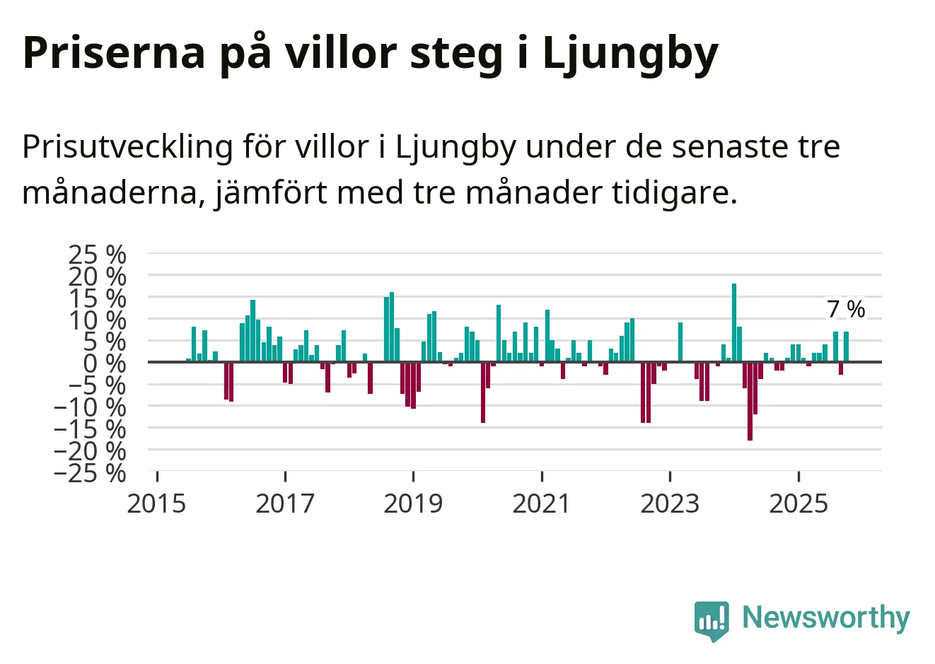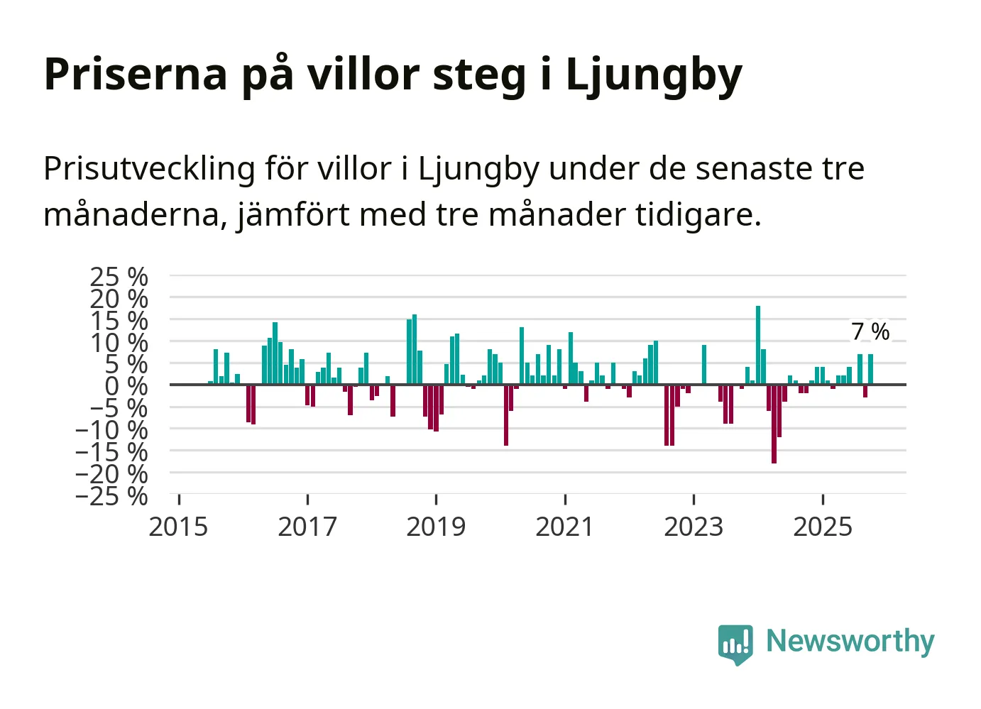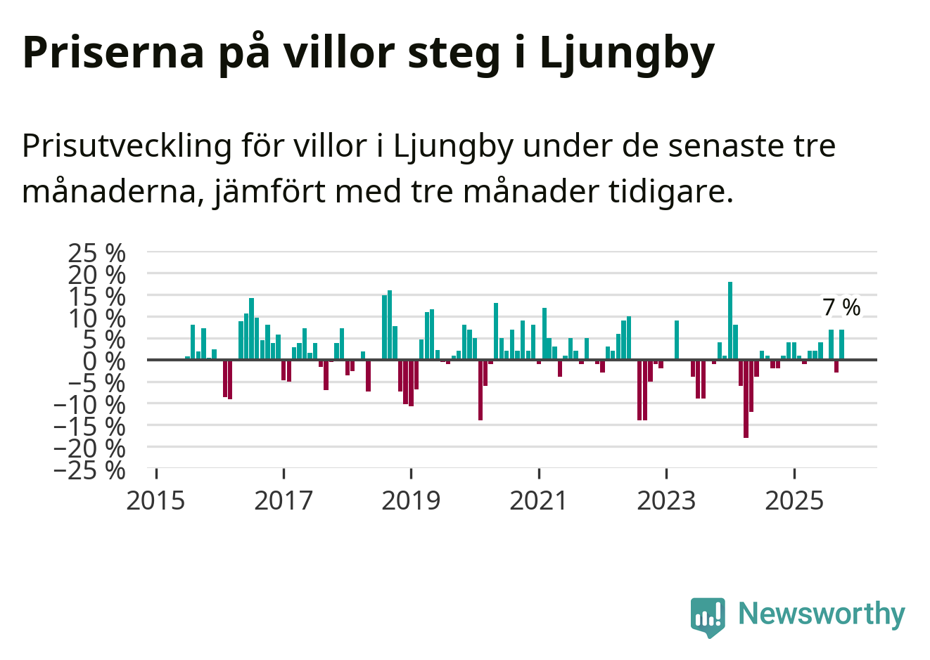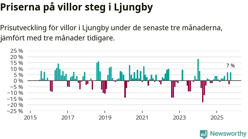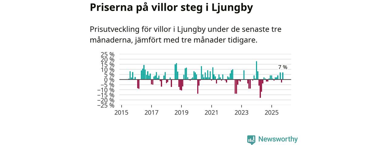 Villapriserna har gått upp i Ljungby kommun. Medelpriset på försäljningarna under de senaste tre månaderna visar på en uppgång med 7 procent.