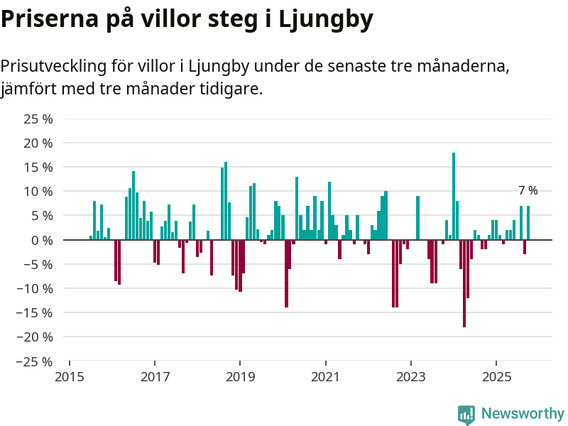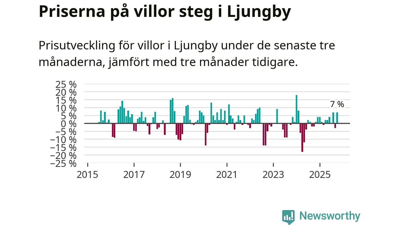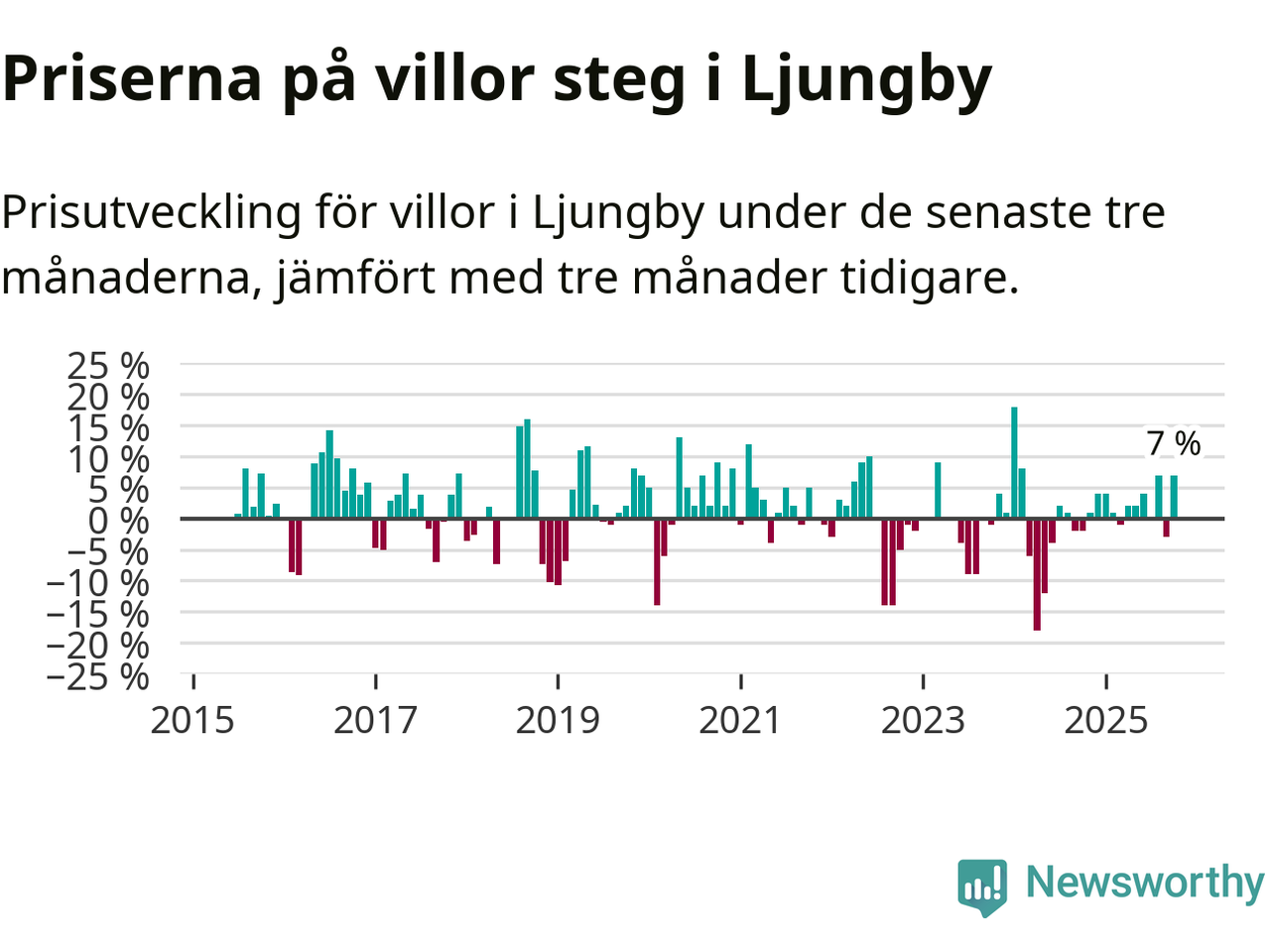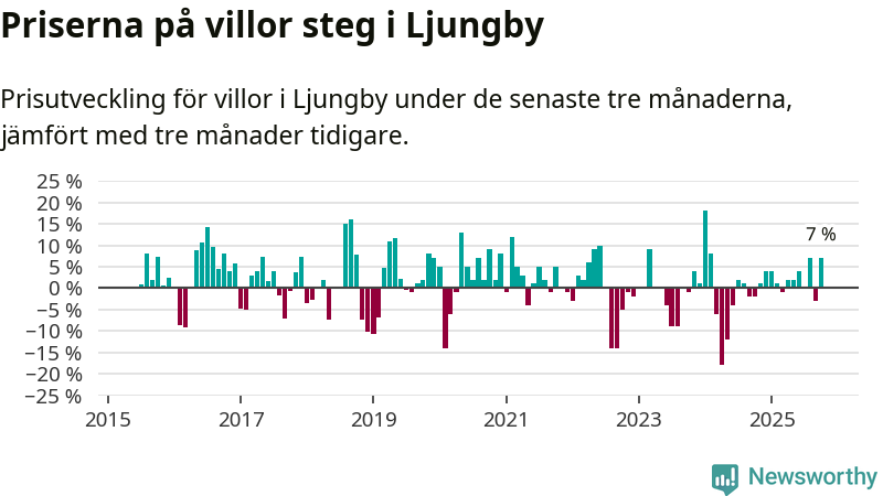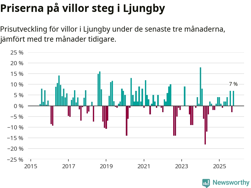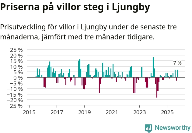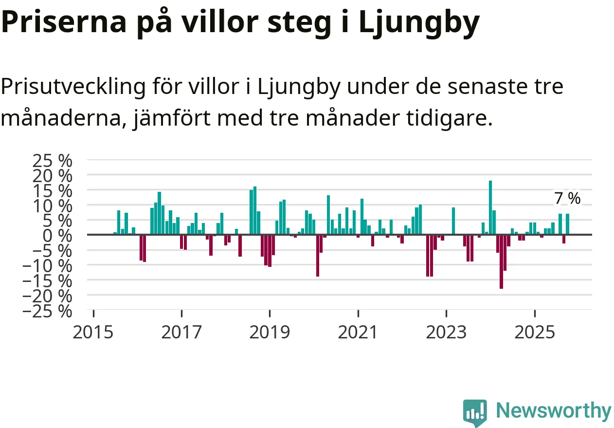 Villapriserna har gått upp i Ljungby kommun. Medelpriset på försäljningarna under de senaste tre månaderna visar på en uppgång med 7 procent.