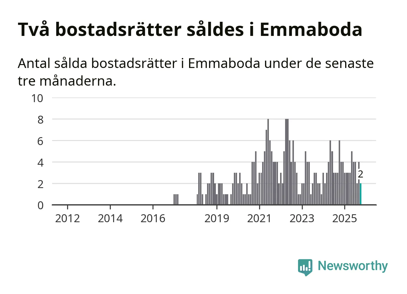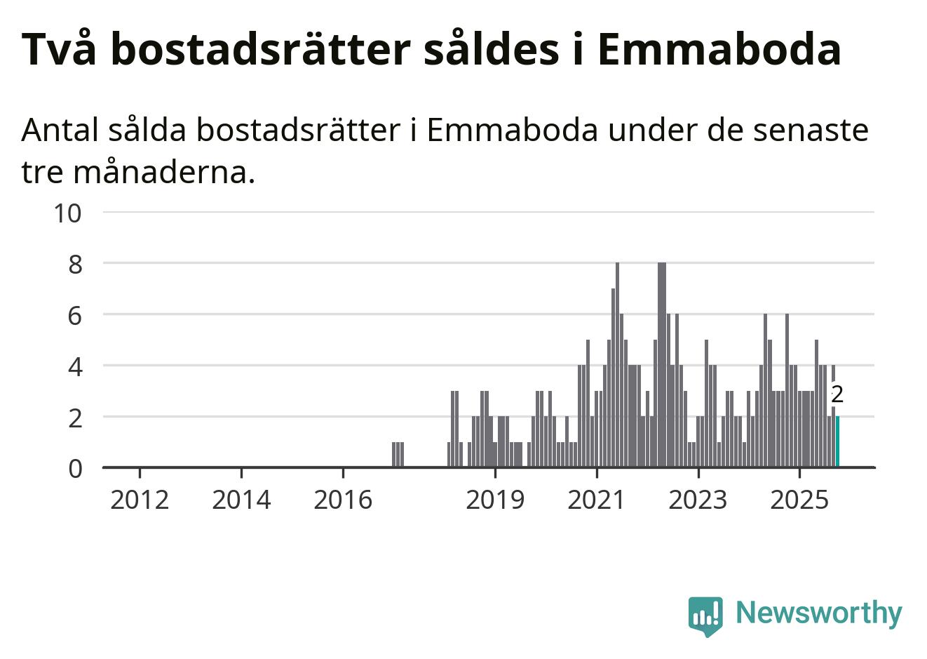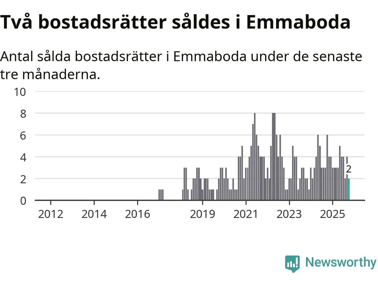 Mellan augusti och oktober gjordes sammanlagt två affärer med bostadsrätter i Emmaboda kommun. Det kan jämföras med sex vid motsvarande tid i fjol.