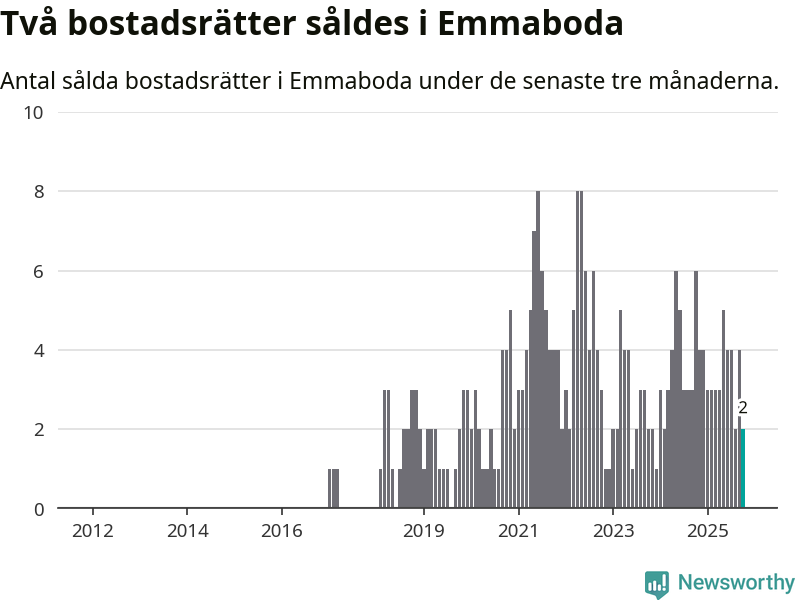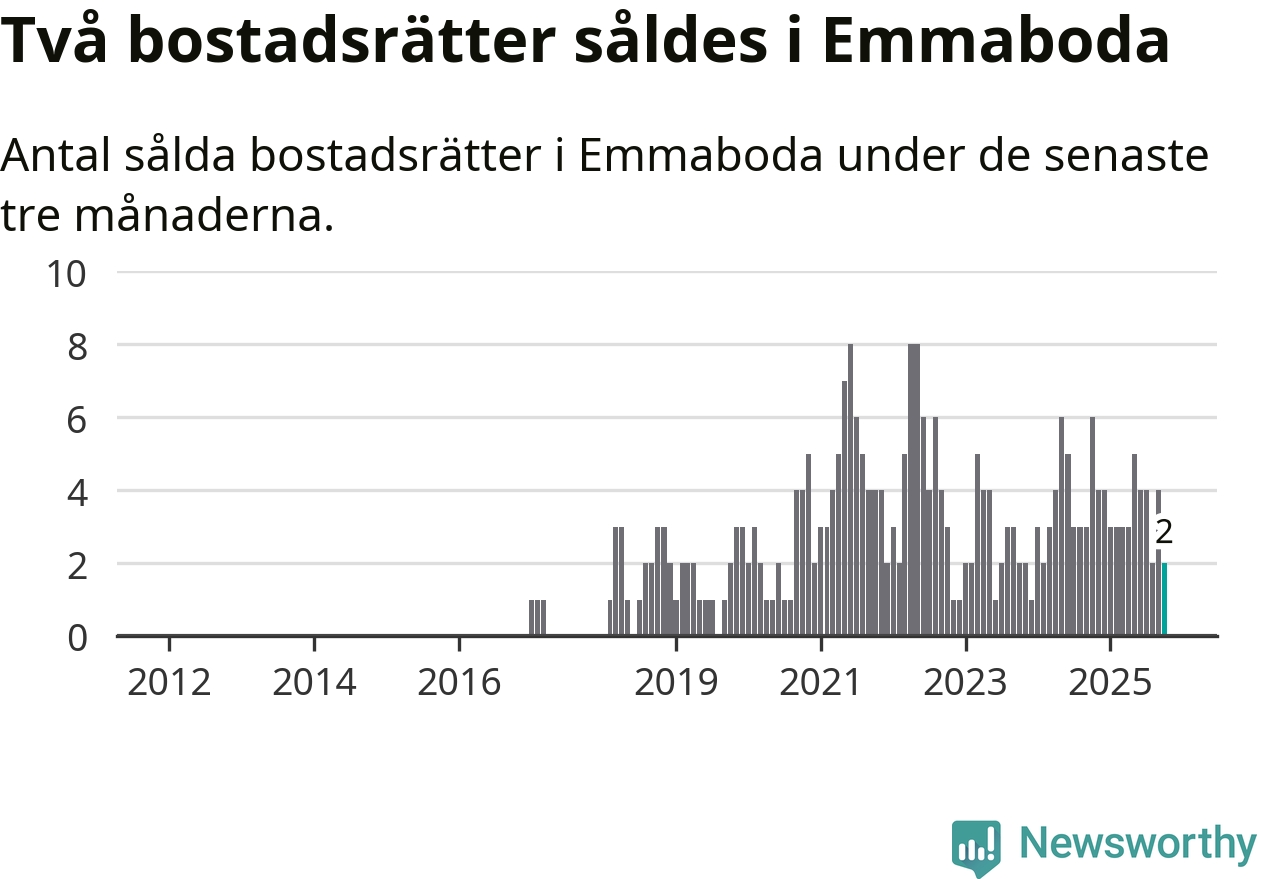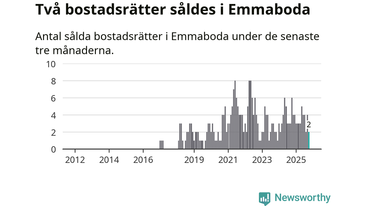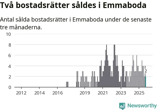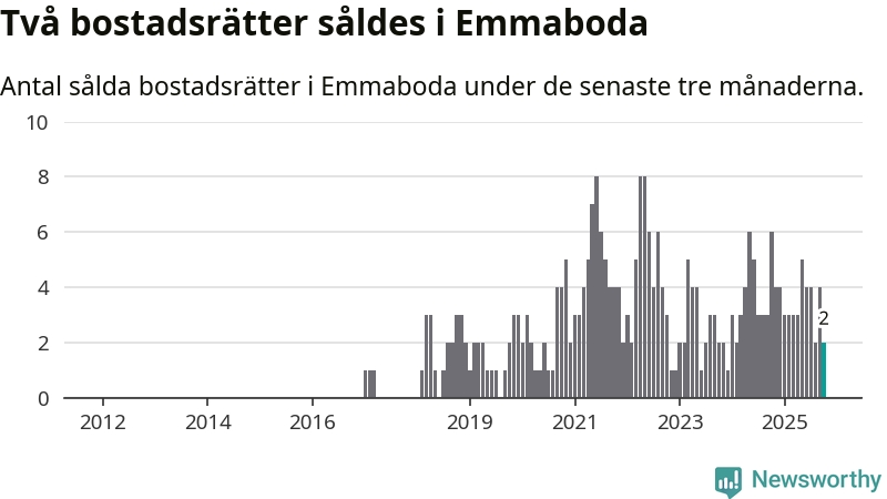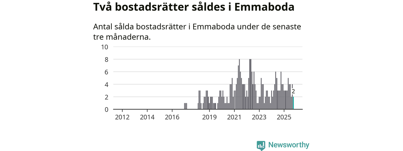Mellan augusti och oktober gjordes sammanlagt två affärer med bostadsrätter i Emmaboda kommun. Det kan jämföras med sex vid motsvarande tid i fjol.