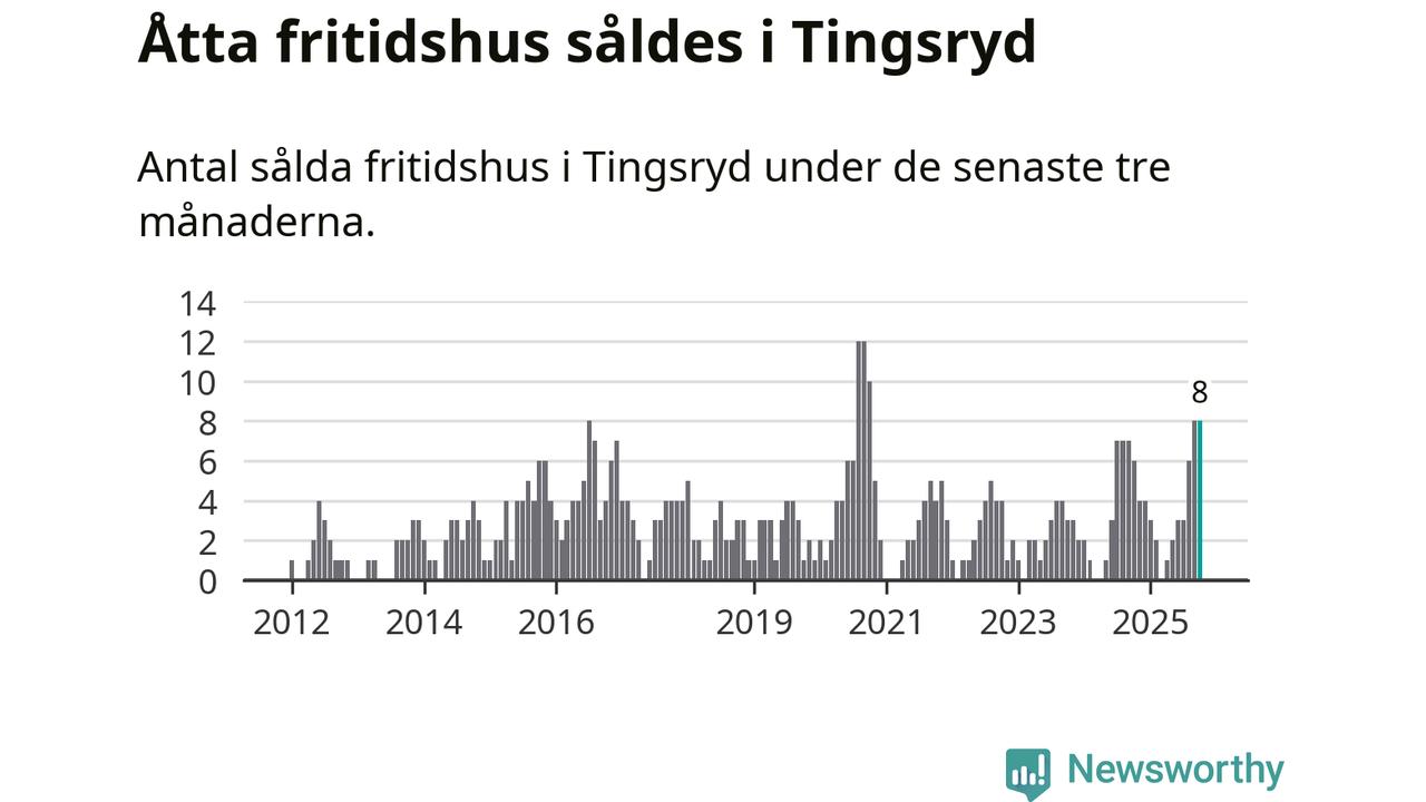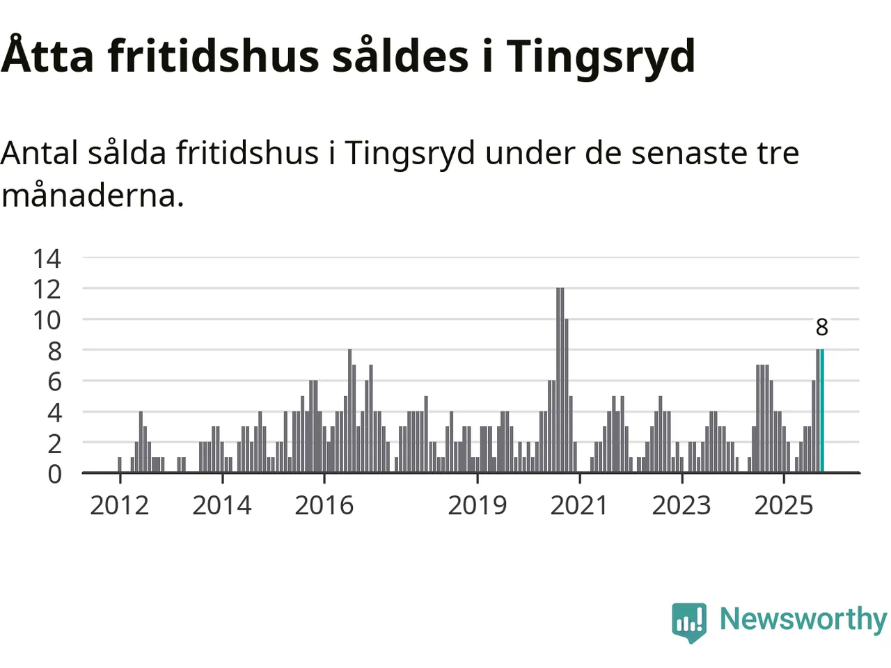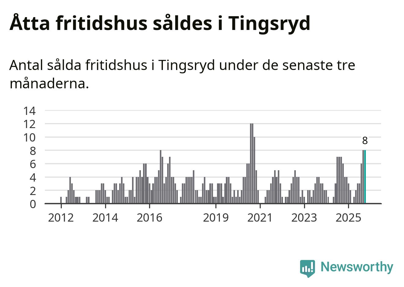 Mellan augusti och oktober gjordes sammanlagt åtta affärer med fritidshus i Tingsryds kommun. Det kan jämföras med sex vid motsvarande tid i fjol.
