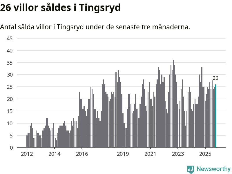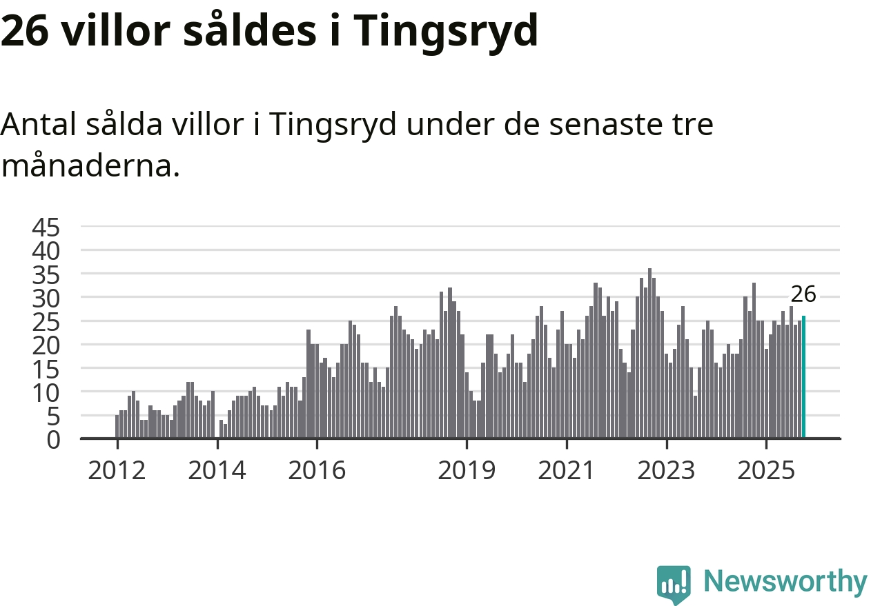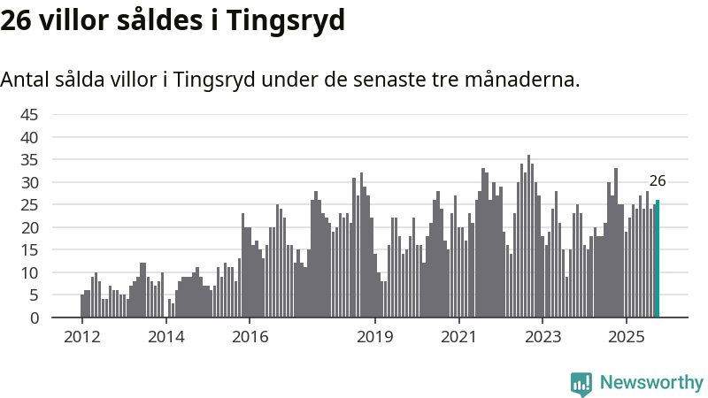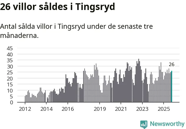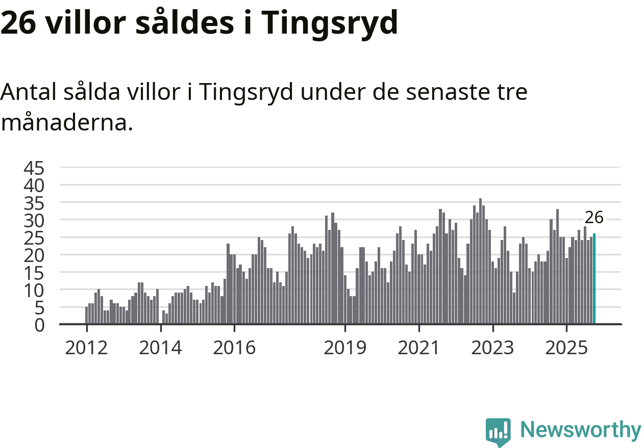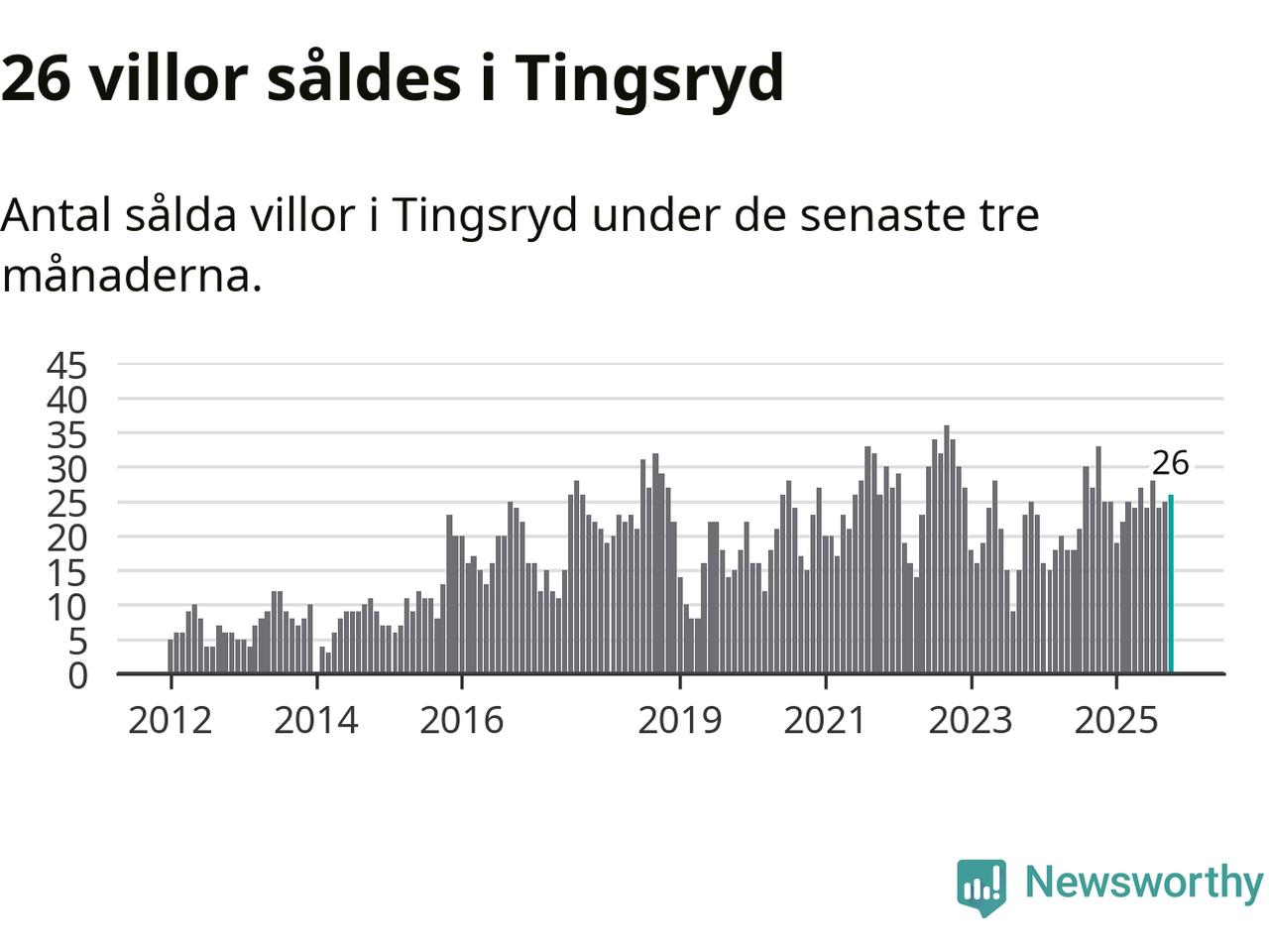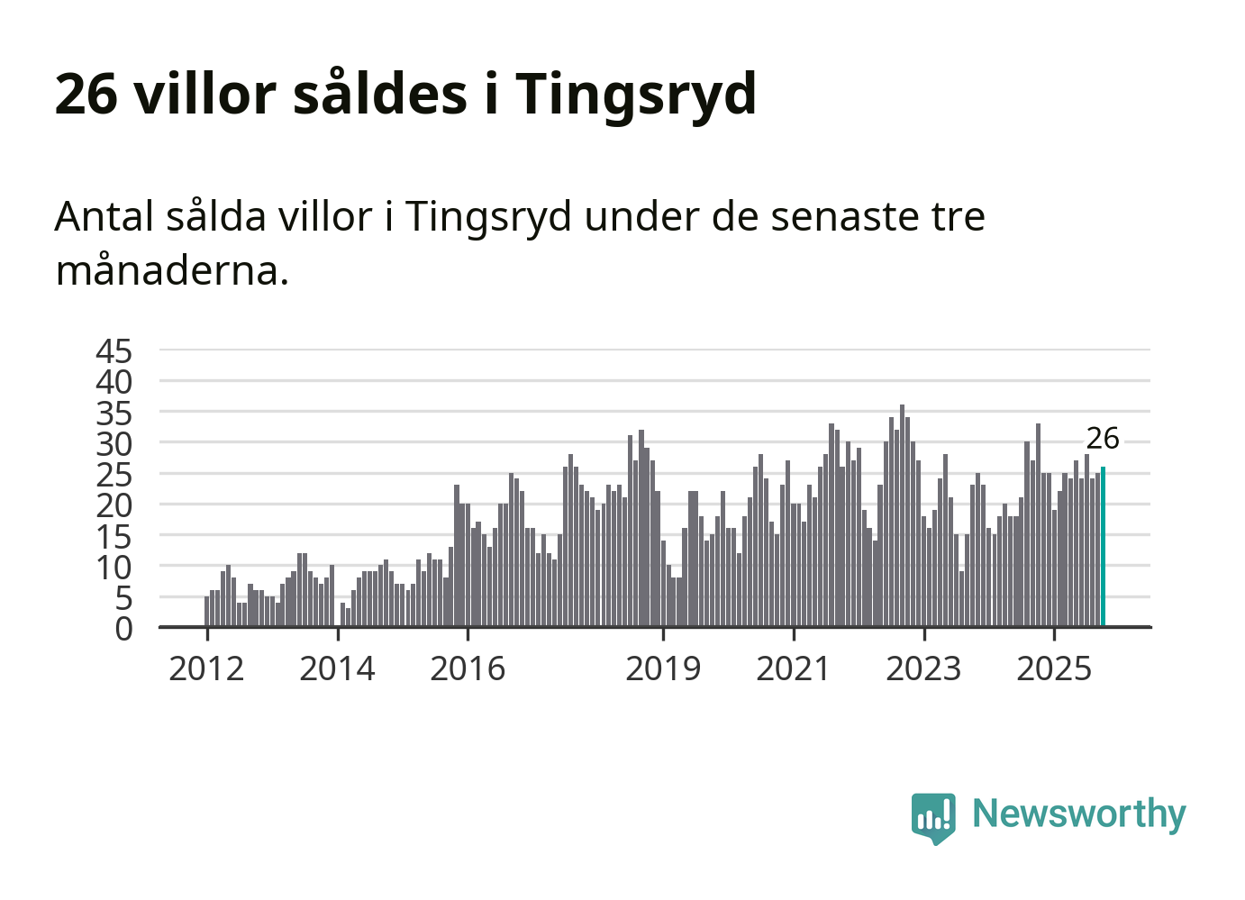 Mellan augusti och oktober gjordes sammanlagt 26 affärer med villor i Tingsryds kommun. Det kan jämföras med 33 vid motsvarande tid i fjol.