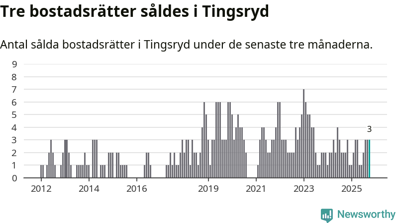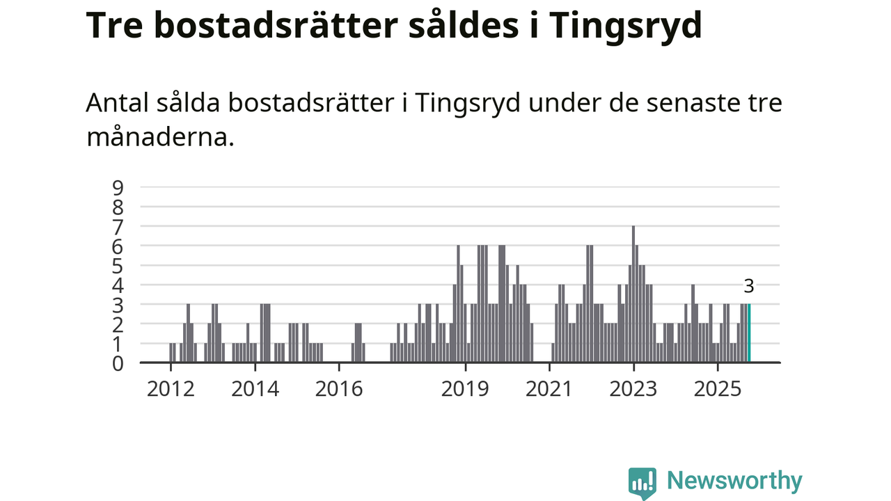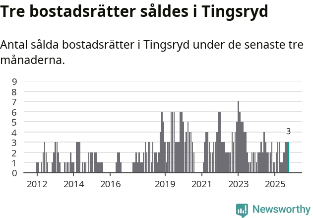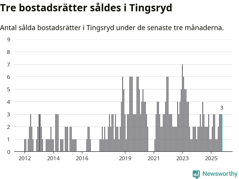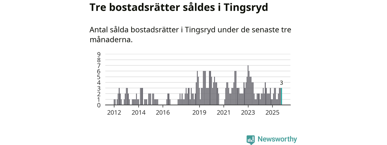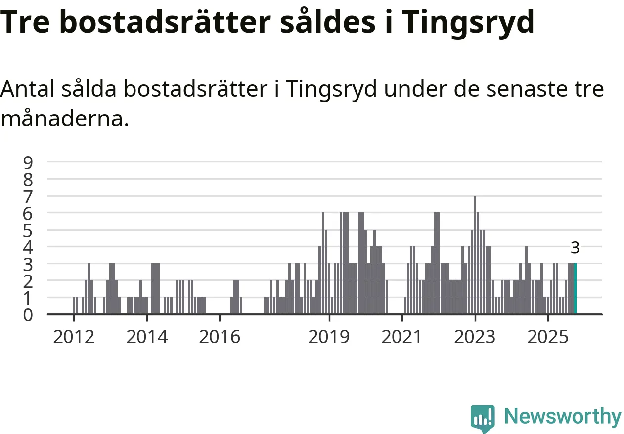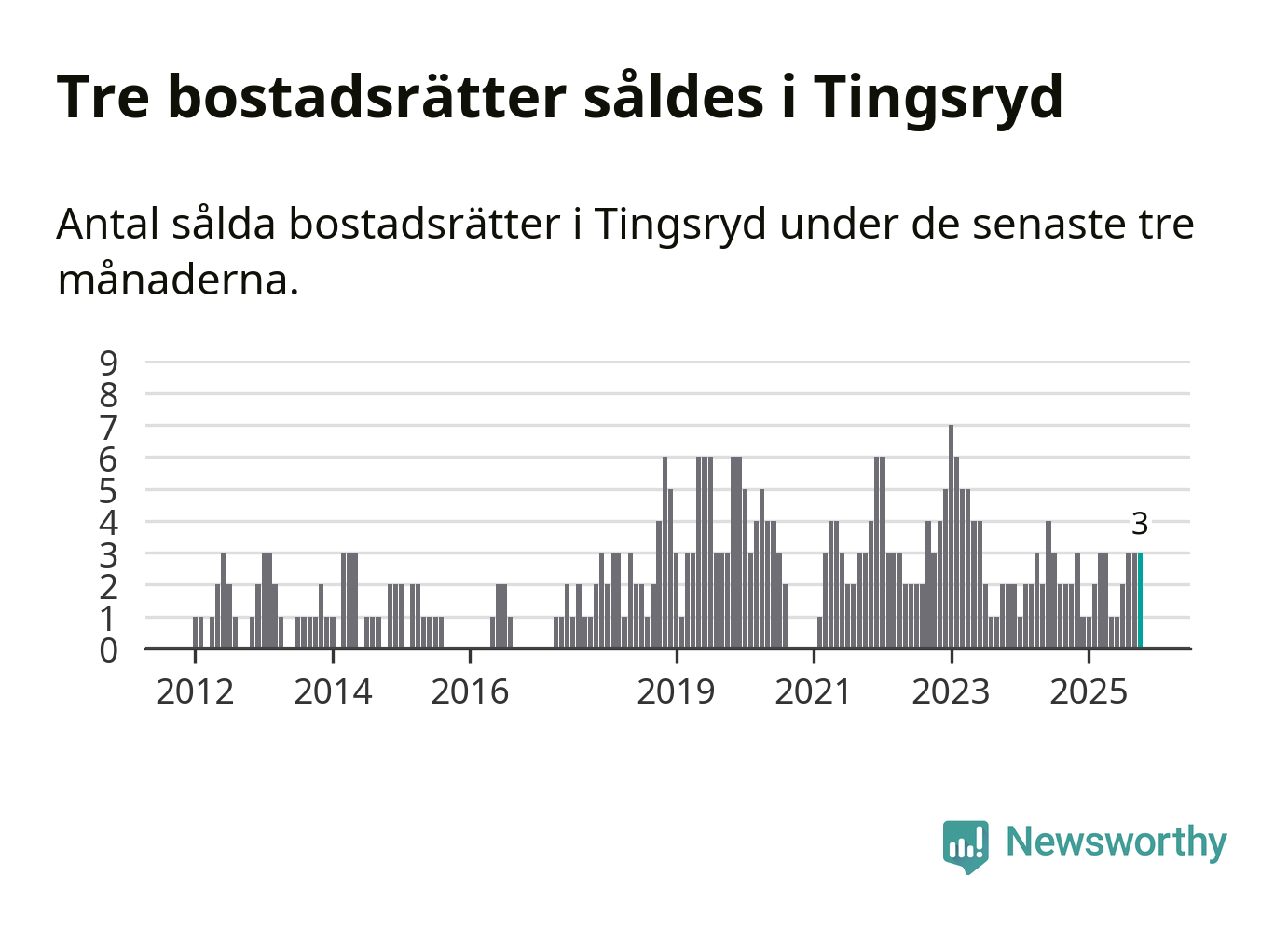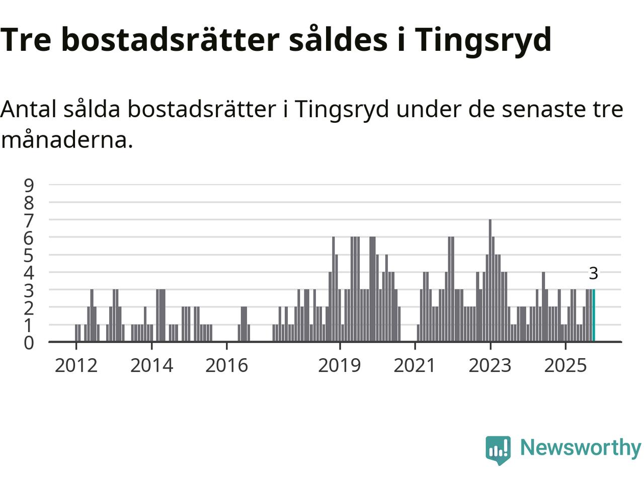 Mellan augusti och oktober gjordes sammanlagt tre affärer med bostadsrätter i Tingsryds kommun. Det kan jämföras med två vid motsvarande tid i fjol.