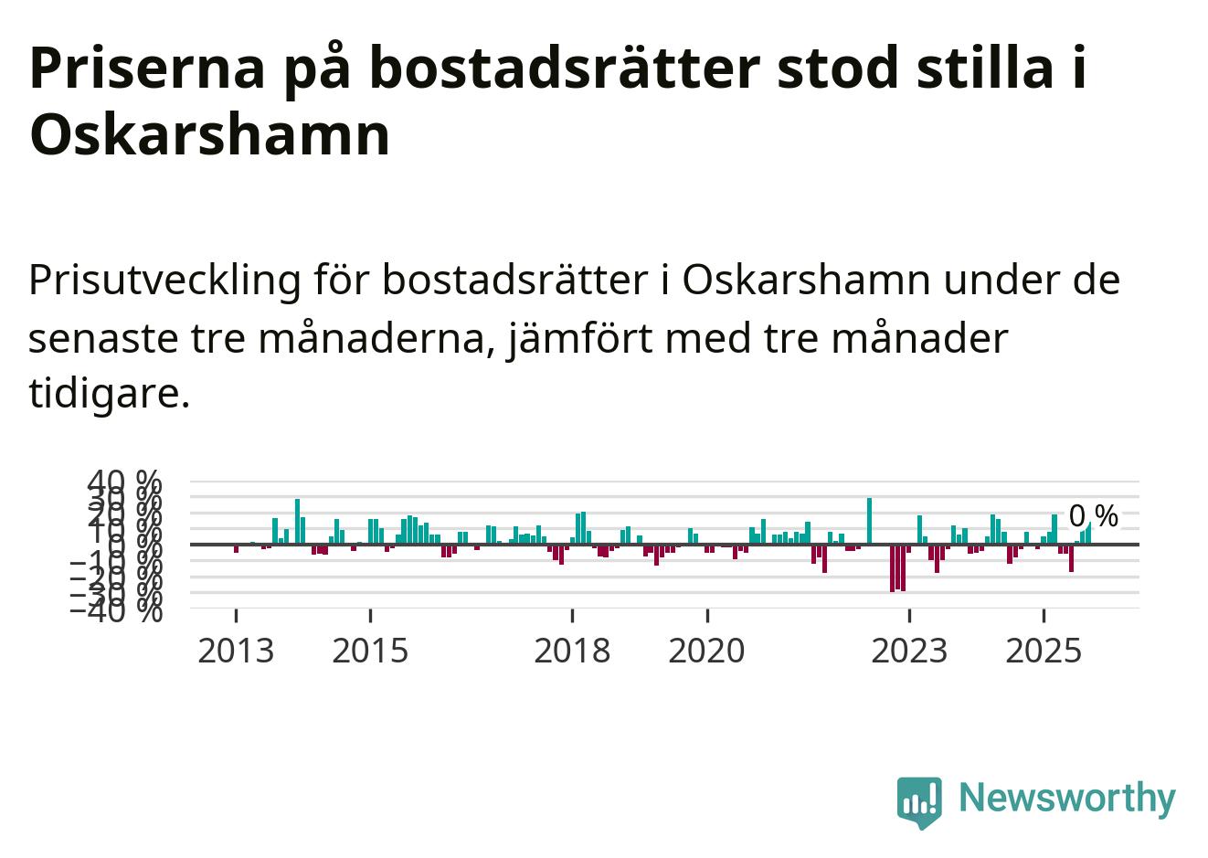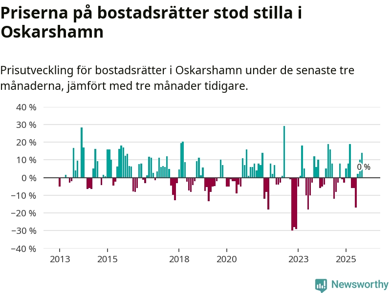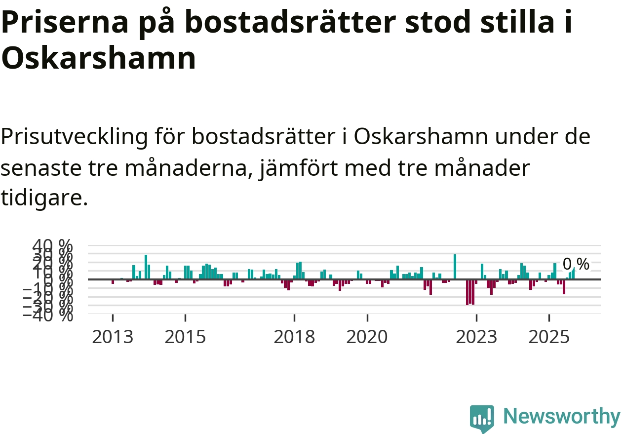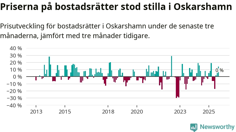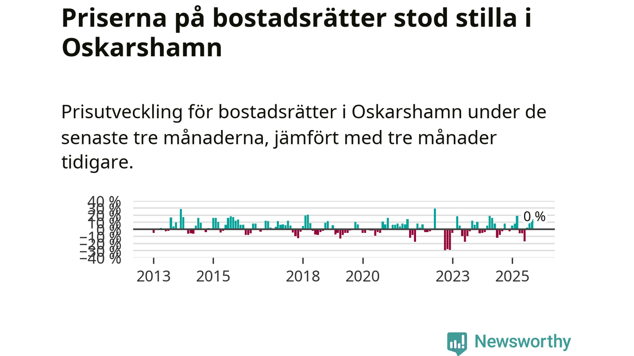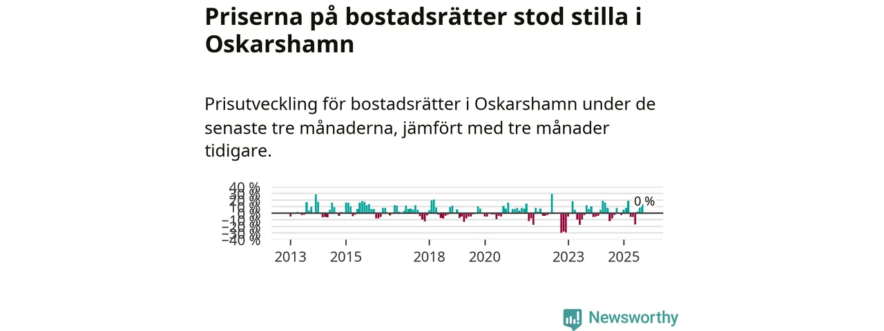 Priserna på bostadsrätter står i stort sett stilla i Oskarshamns kommun. Medelpriset på de på försäljningarna under de senaste tre månaderna låg på samma nivå som för tre månader sedan.