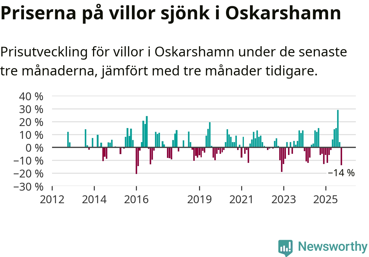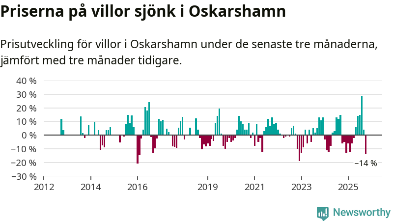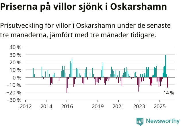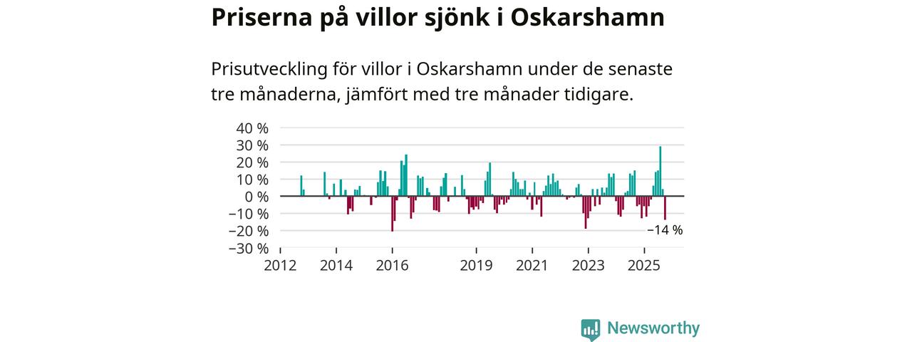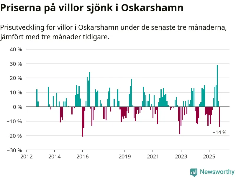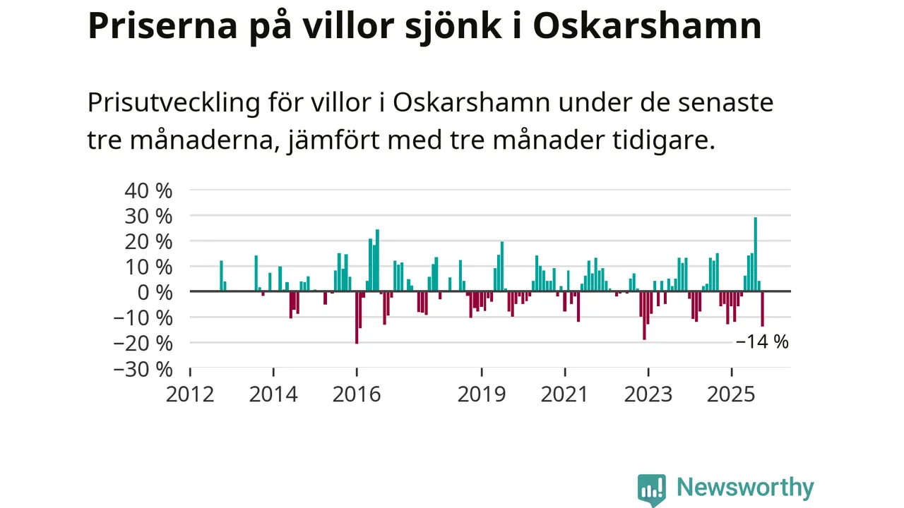 Villapriserna sjönk mellan augusti och oktober med 14 procent i Oskarshamns kommun. Det är en betydande nedgång jämfört med det gångna året då priserna i snitt ökat med 1 procent.