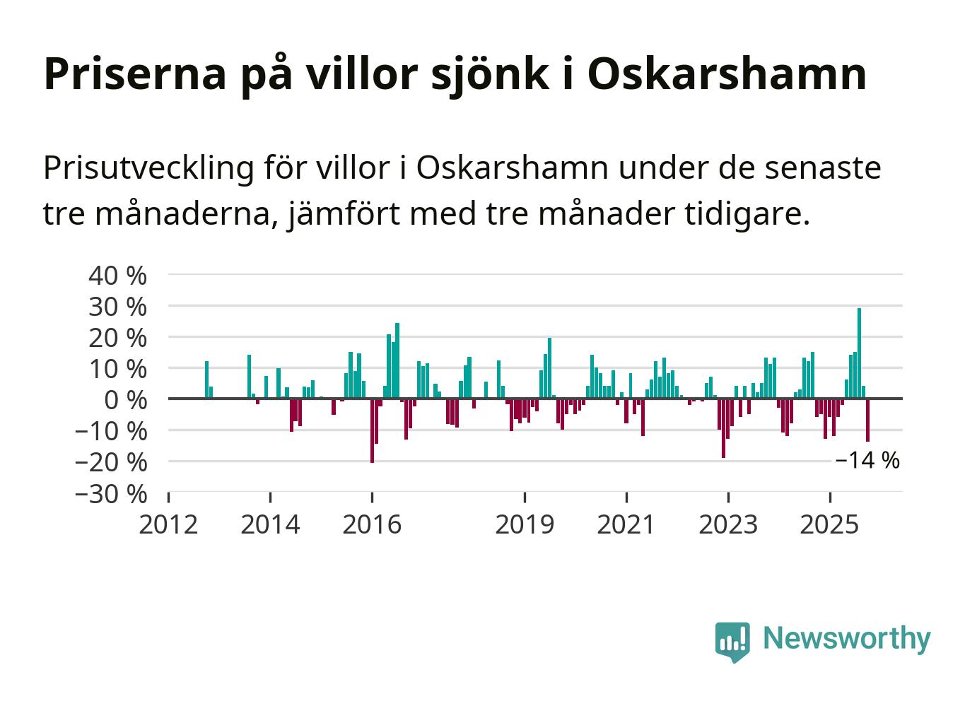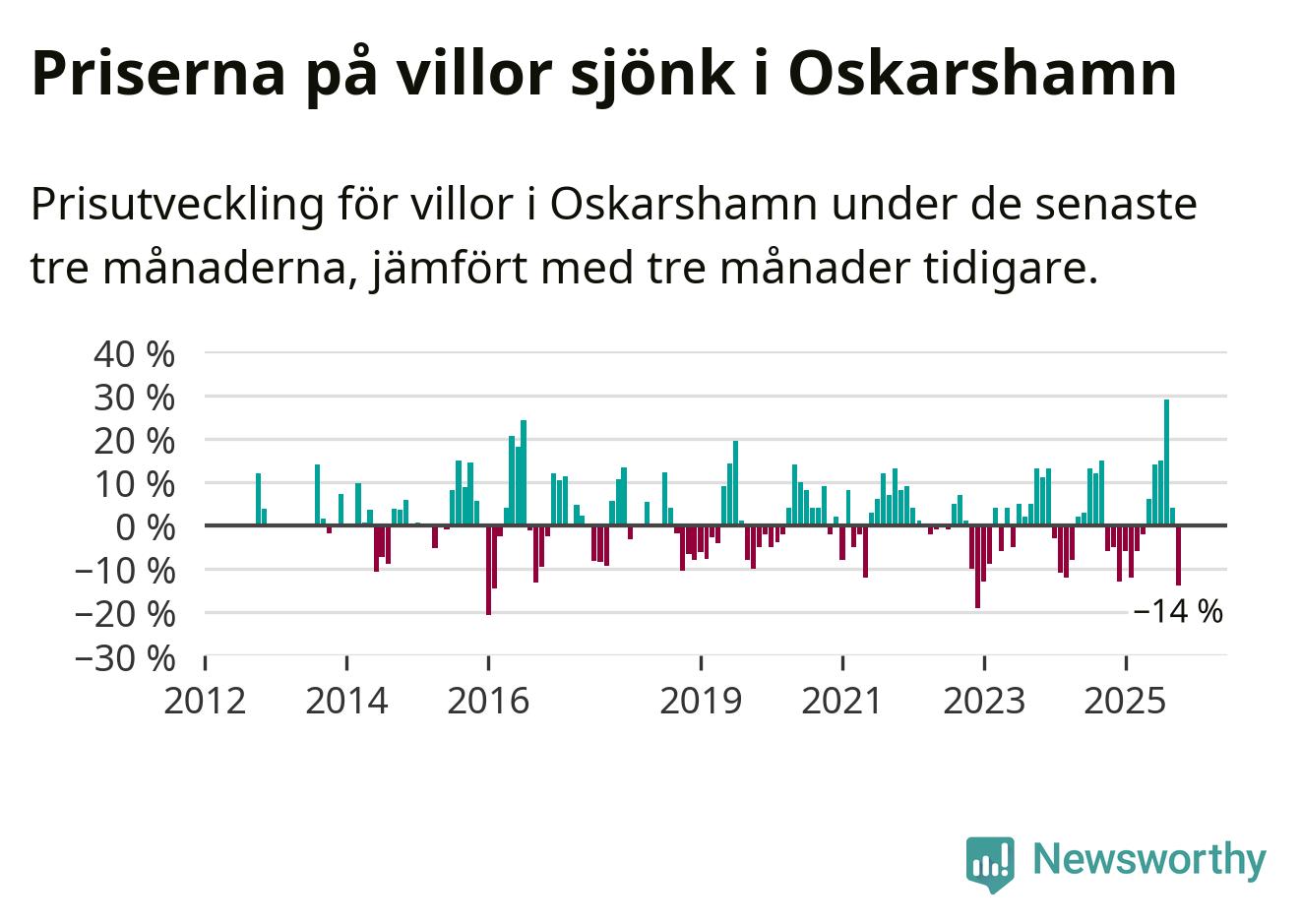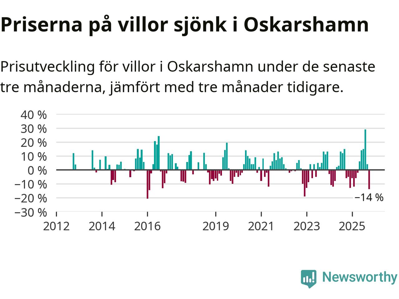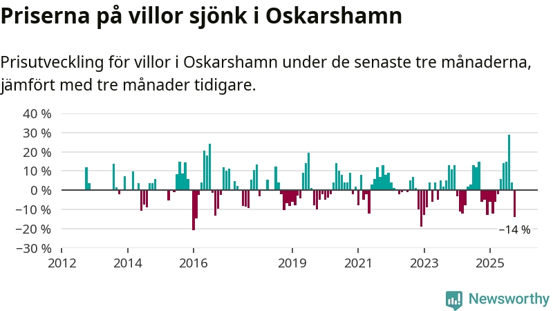Villapriserna sjönk mellan augusti och oktober med 14 procent i Oskarshamns kommun. Det är en betydande nedgång jämfört med det gångna året då priserna i snitt ökat med 1 procent.