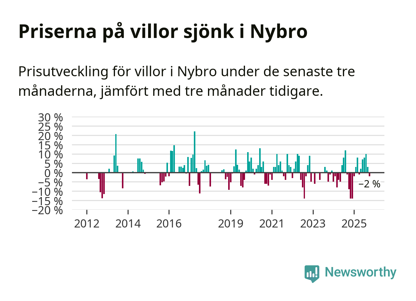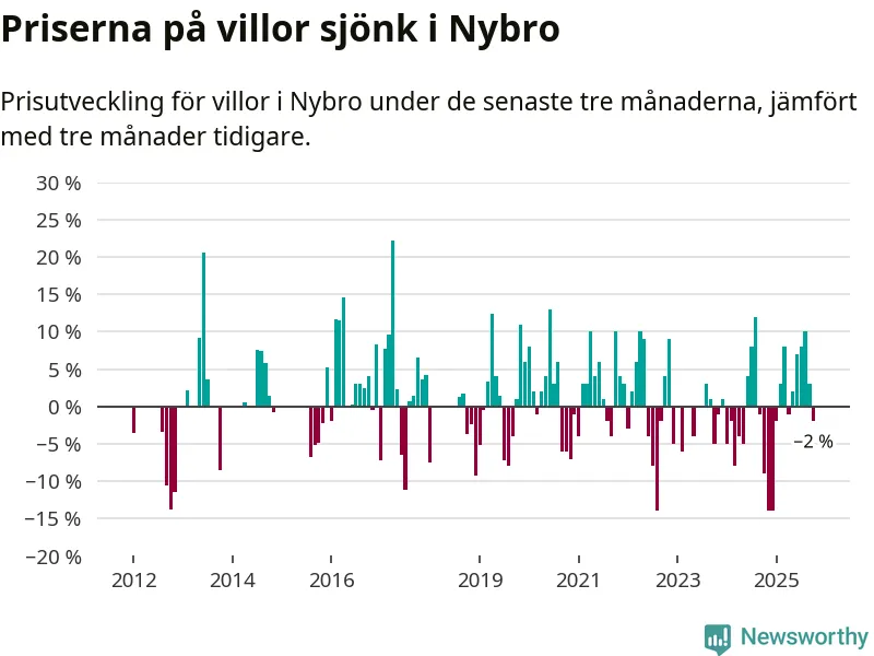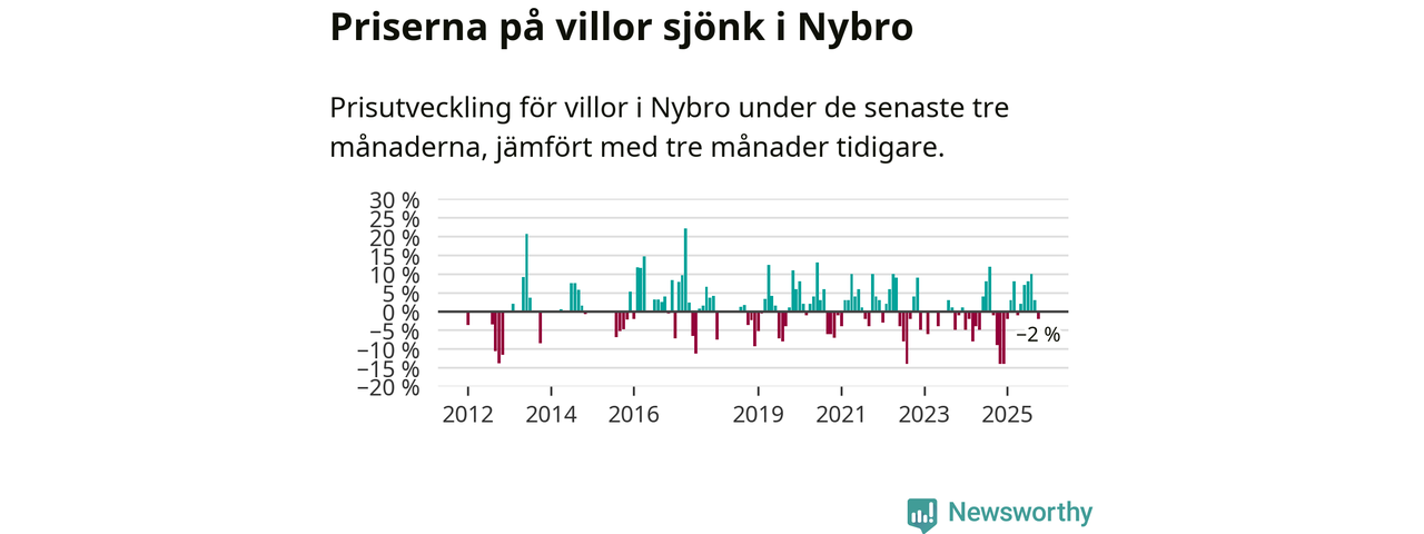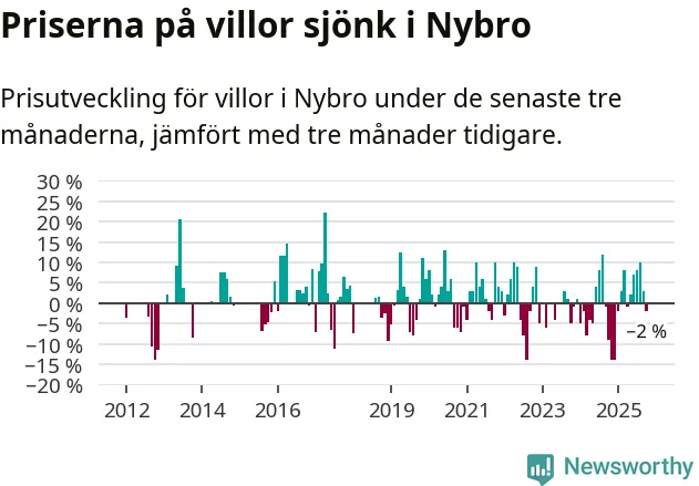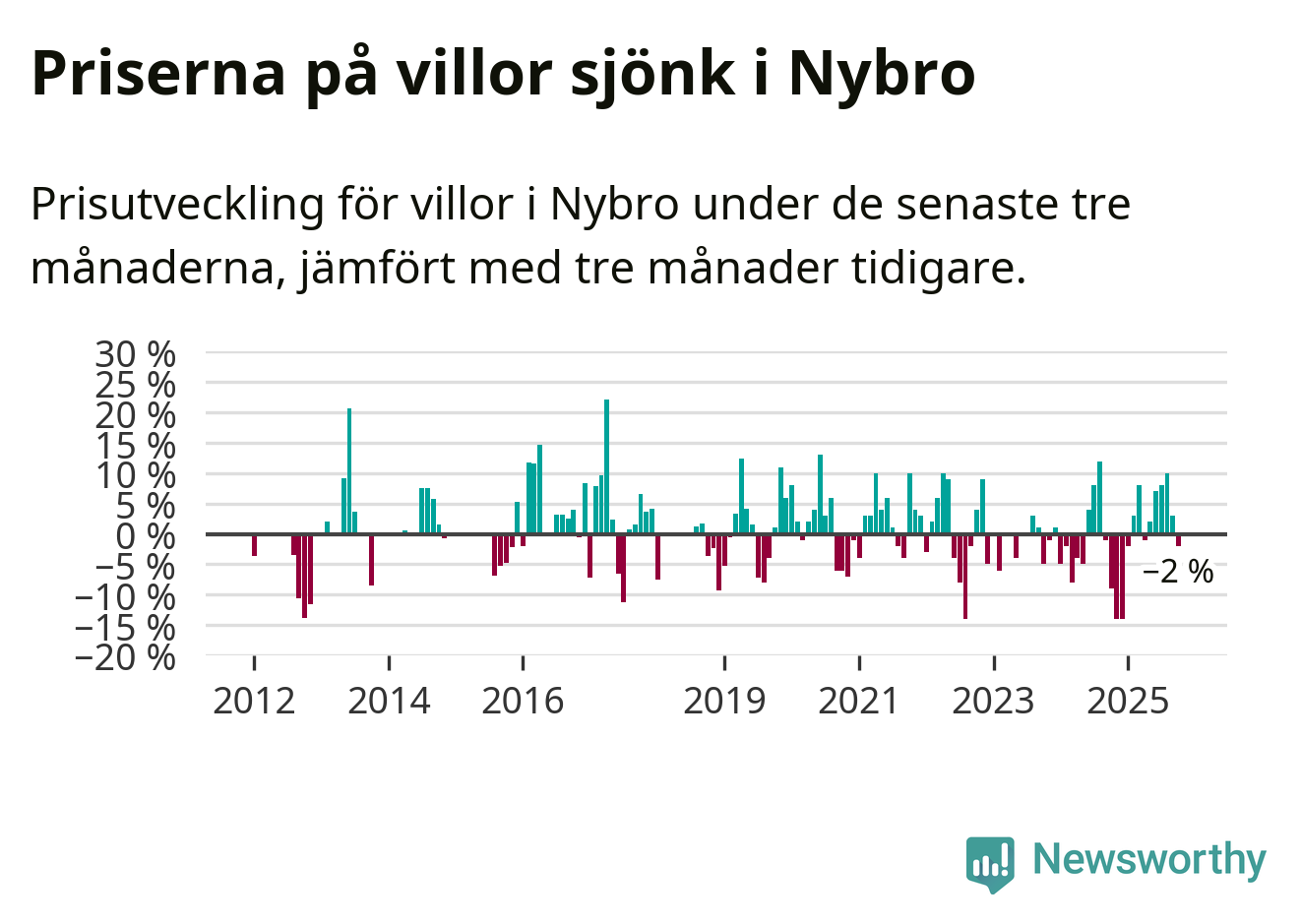 Villapriserna har gått ner i Nybro kommun. Medelpriset på försäljningarna under de senaste tre månaderna visar på en nedgång med 2 procent.