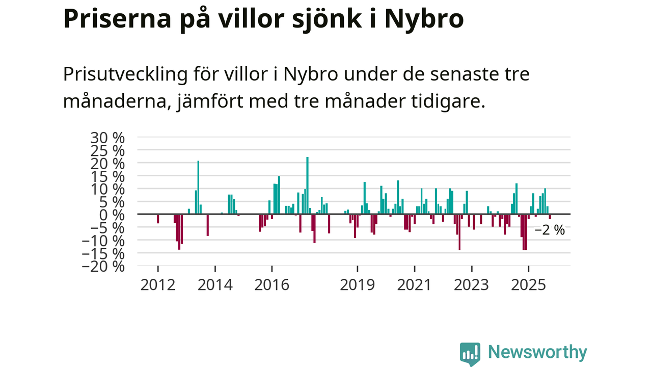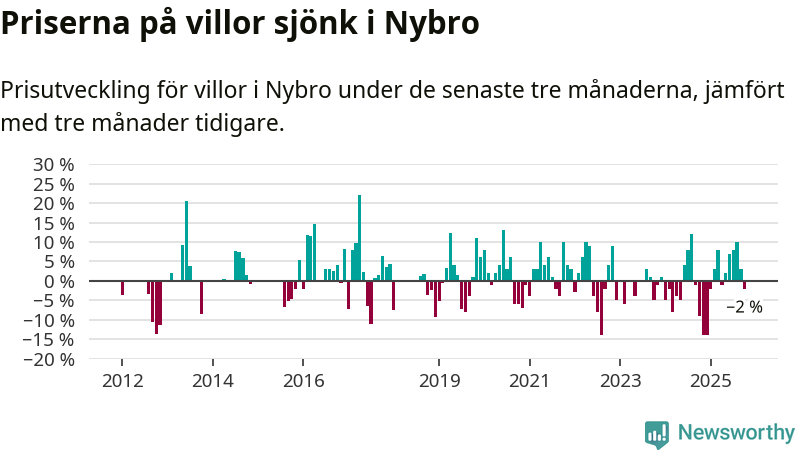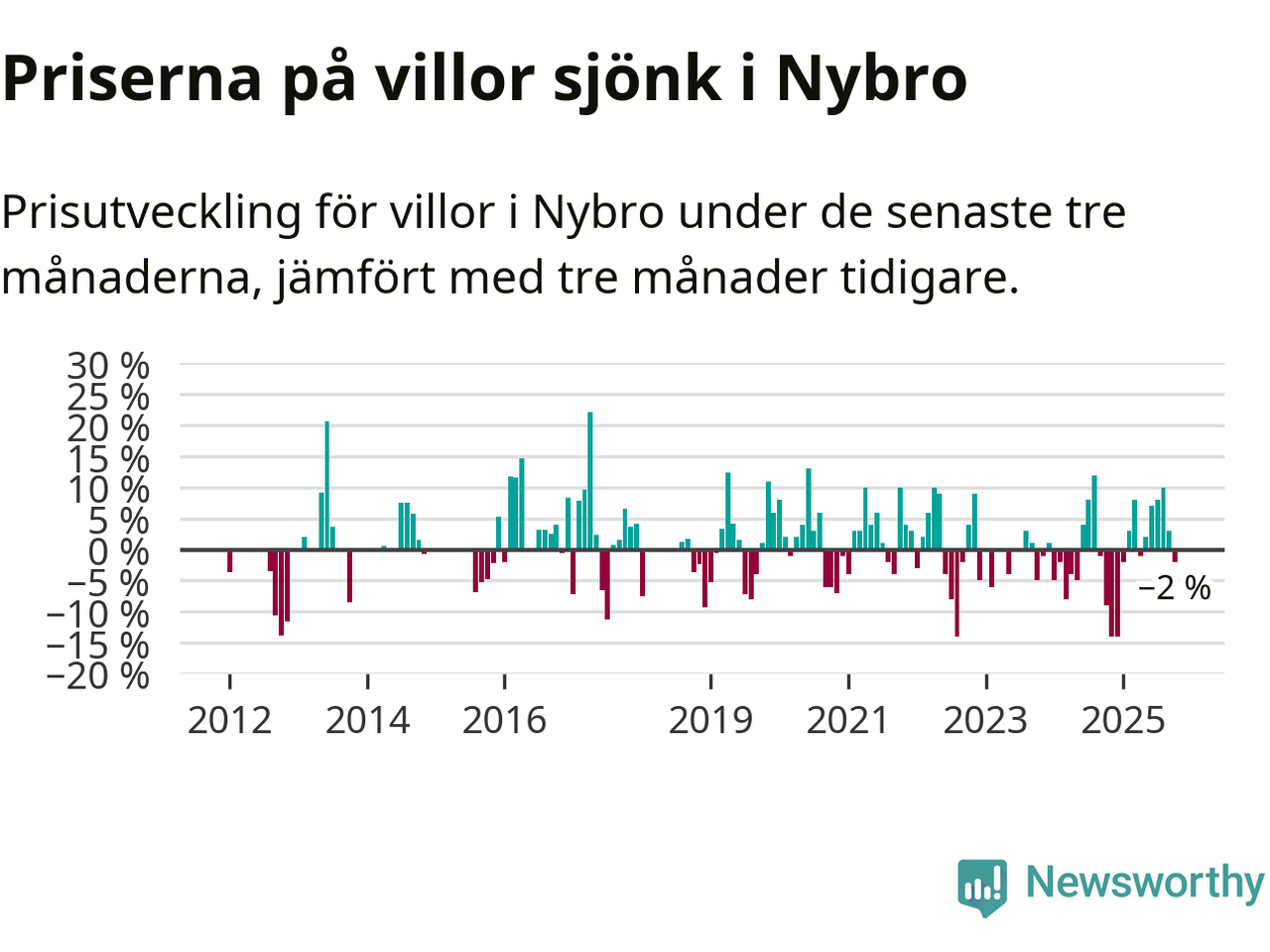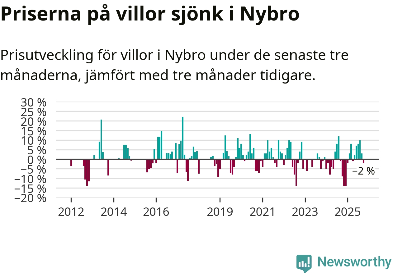 Villapriserna har gått ner i Nybro kommun. Medelpriset på försäljningarna under de senaste tre månaderna visar på en nedgång med 2 procent.