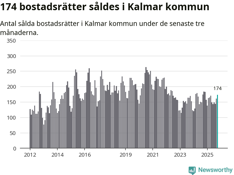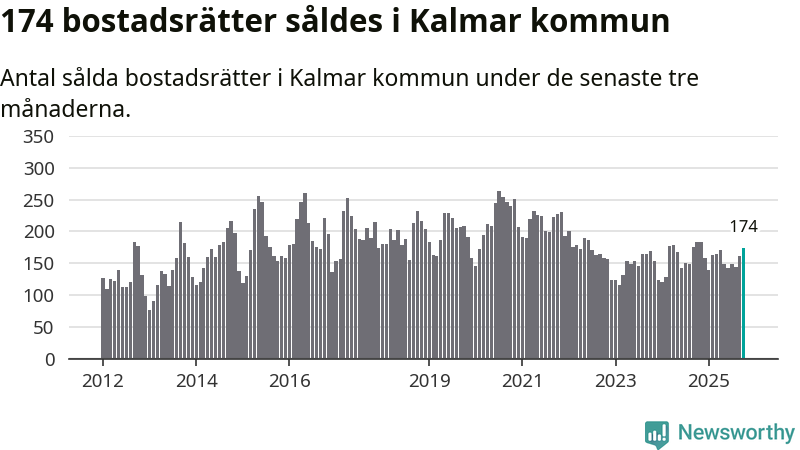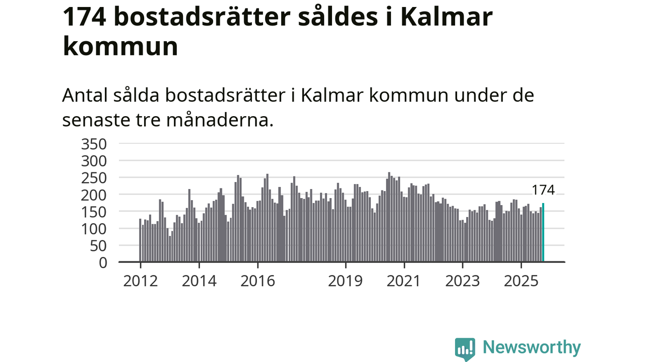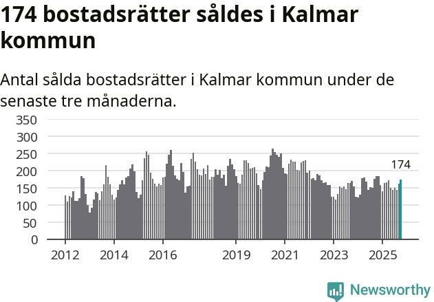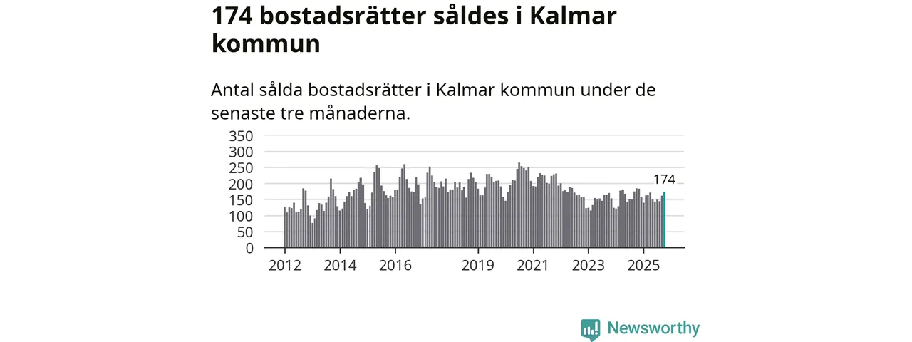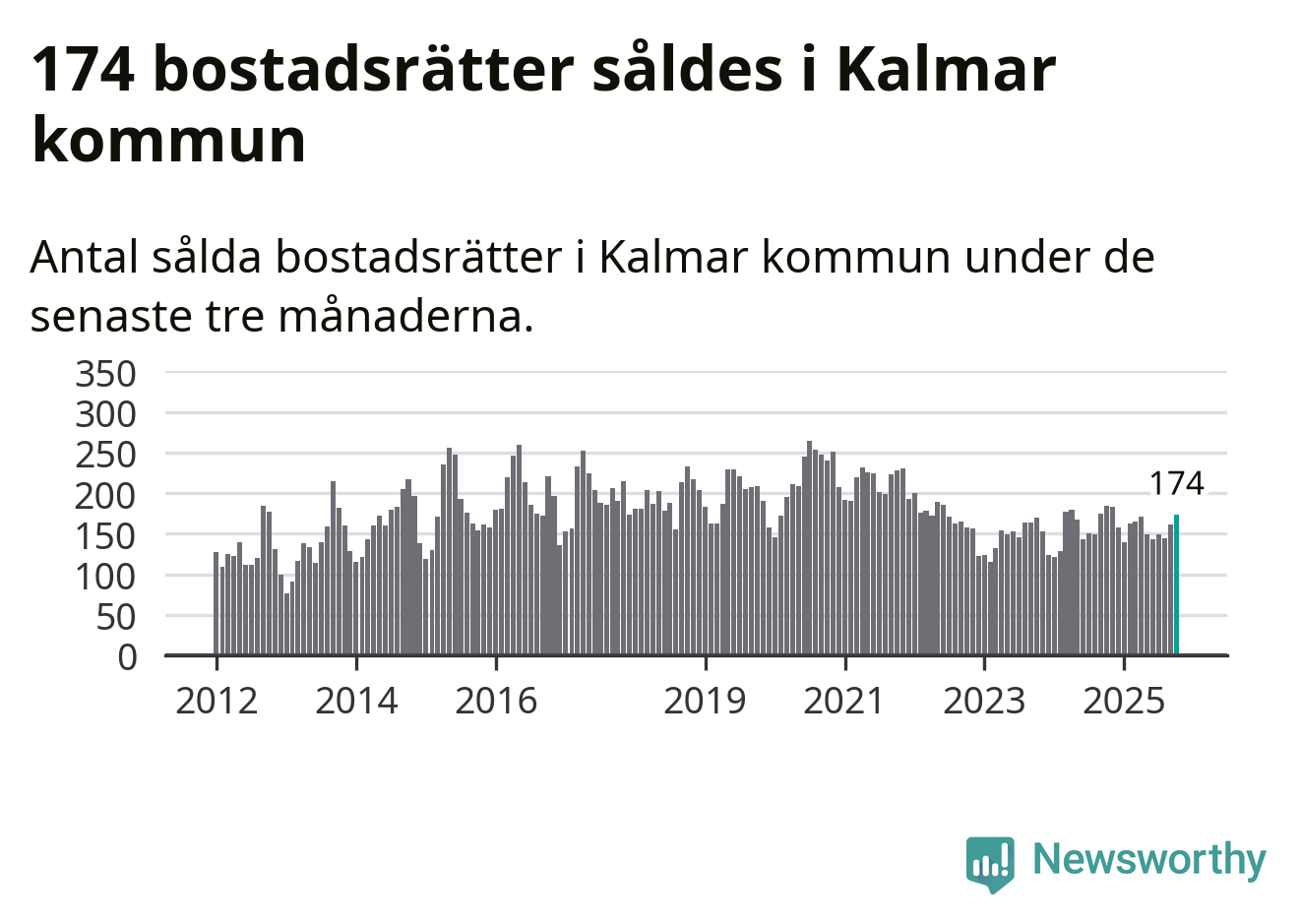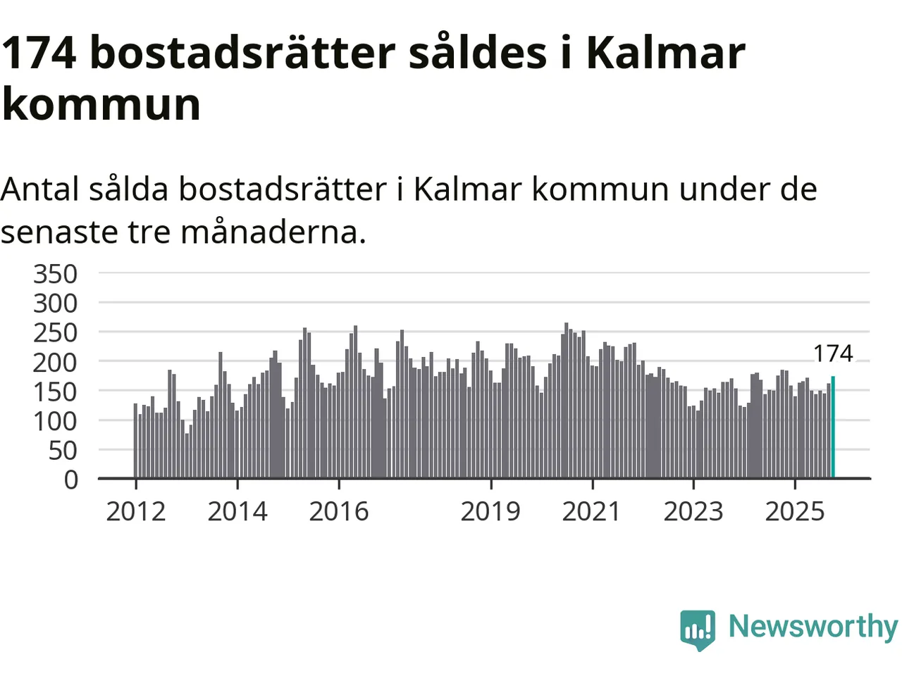 Sammanlagt såldes 174 bostadsrätter i Kalmar kommun mellan augusti och oktober till ett genomsnittligt pris på 1,6 miljoner kronor. I fjol gjordes 184 affärer vid den här tiden på året.