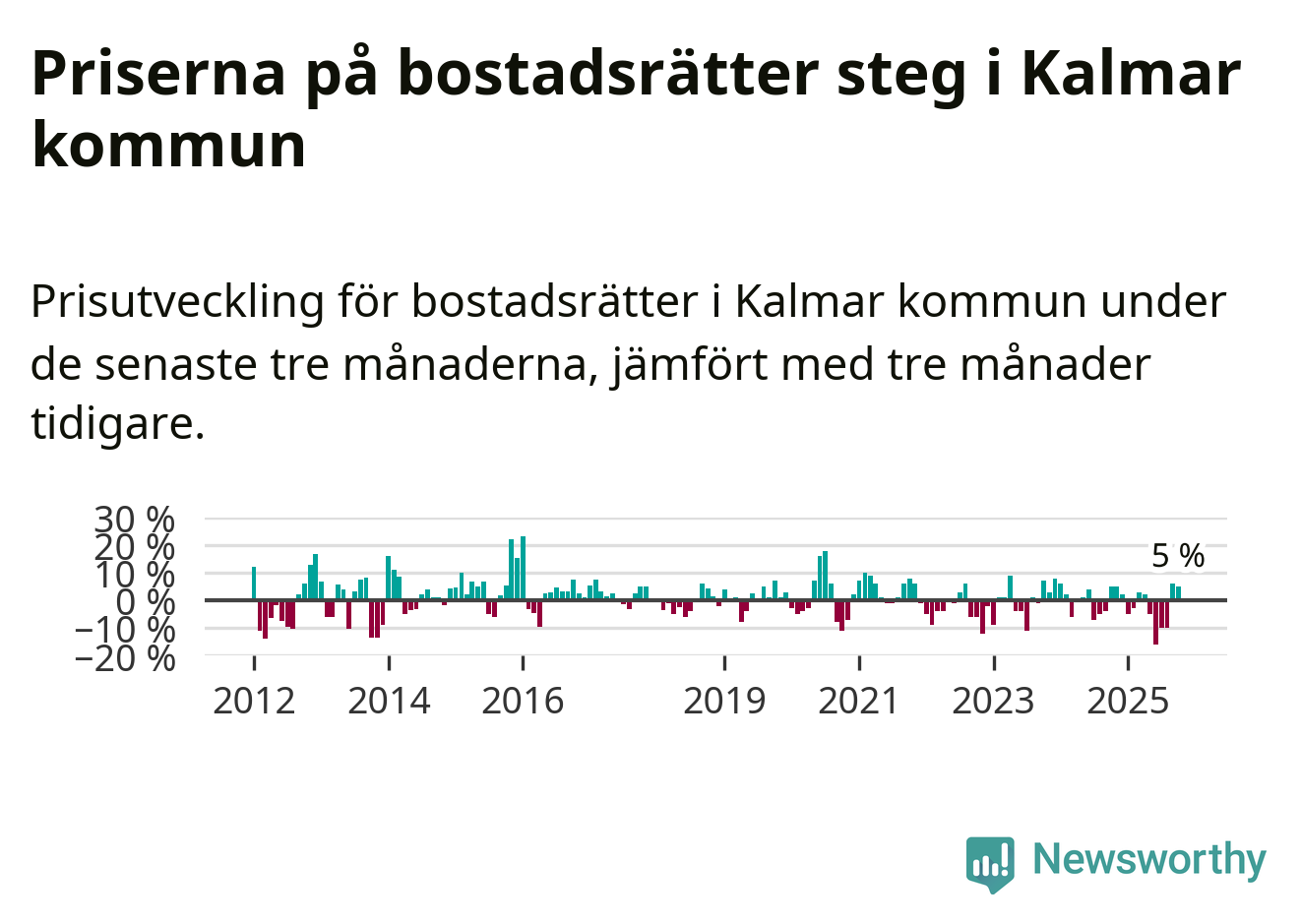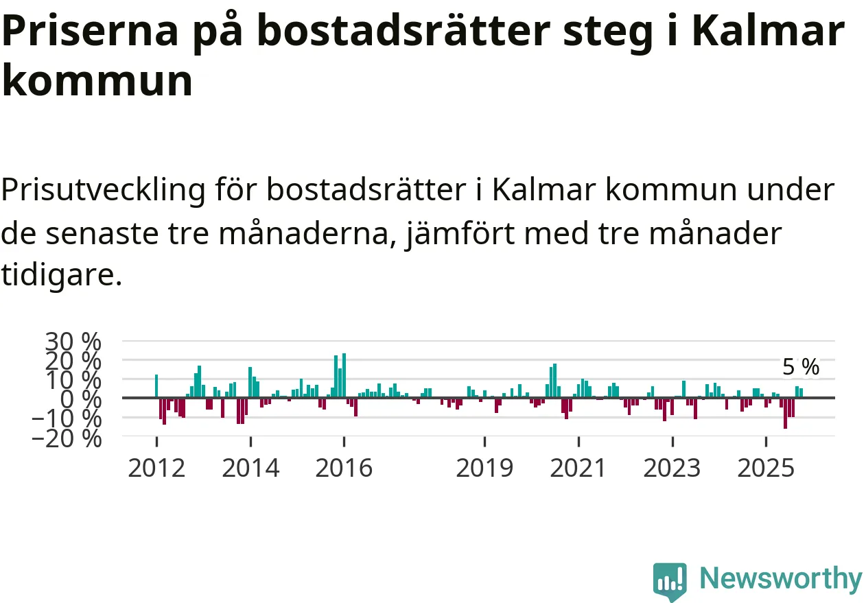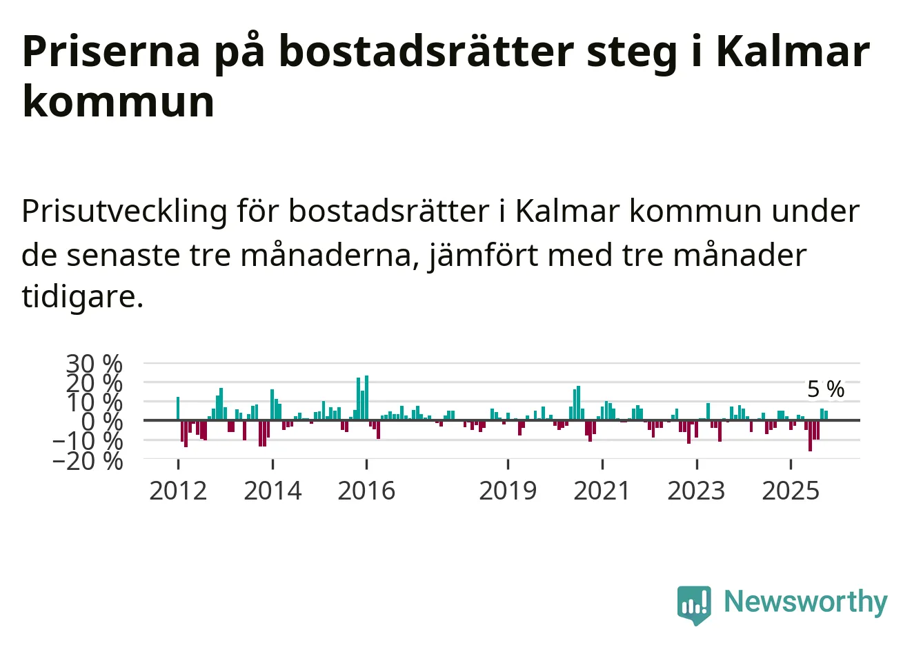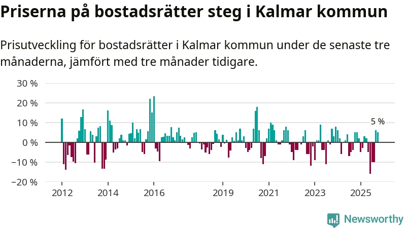 Priserna på bostadsrätter har gått upp i Kalmar kommun. Medelpriset på försäljningarna under de senaste tre månaderna visar på en uppgång med 5 procent.