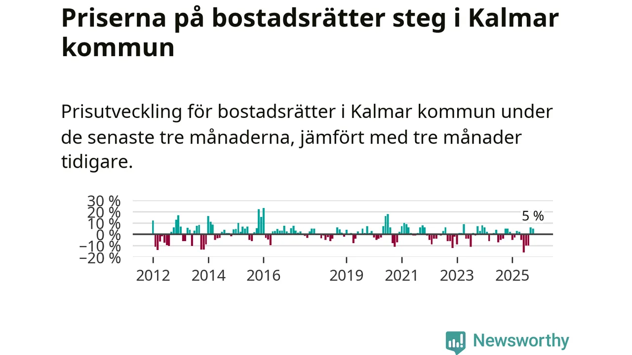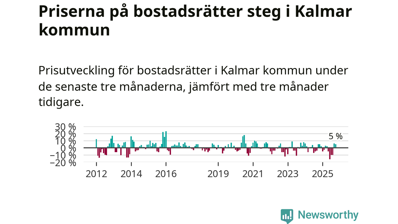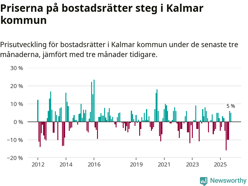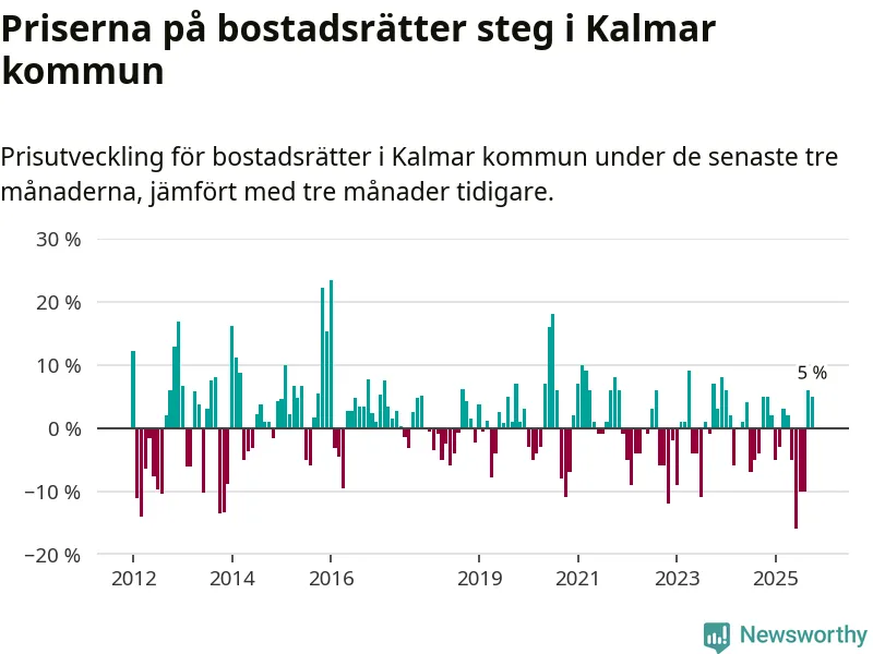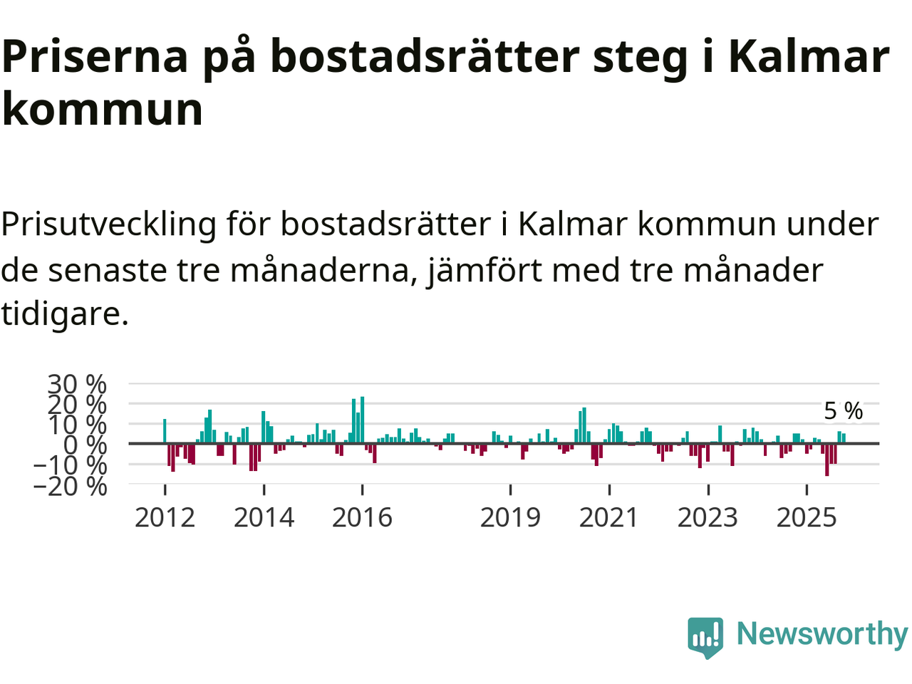 Priserna på bostadsrätter har gått upp i Kalmar kommun. Medelpriset på försäljningarna under de senaste tre månaderna visar på en uppgång med 5 procent.