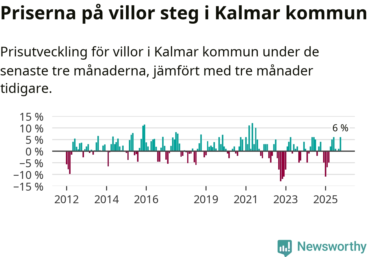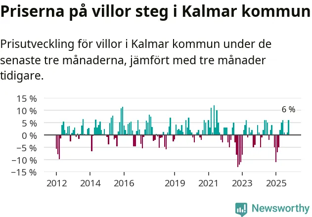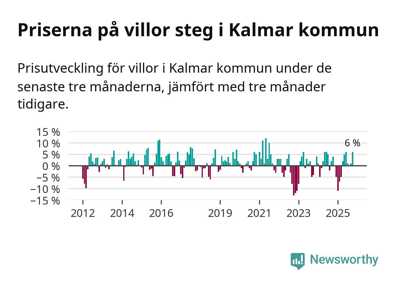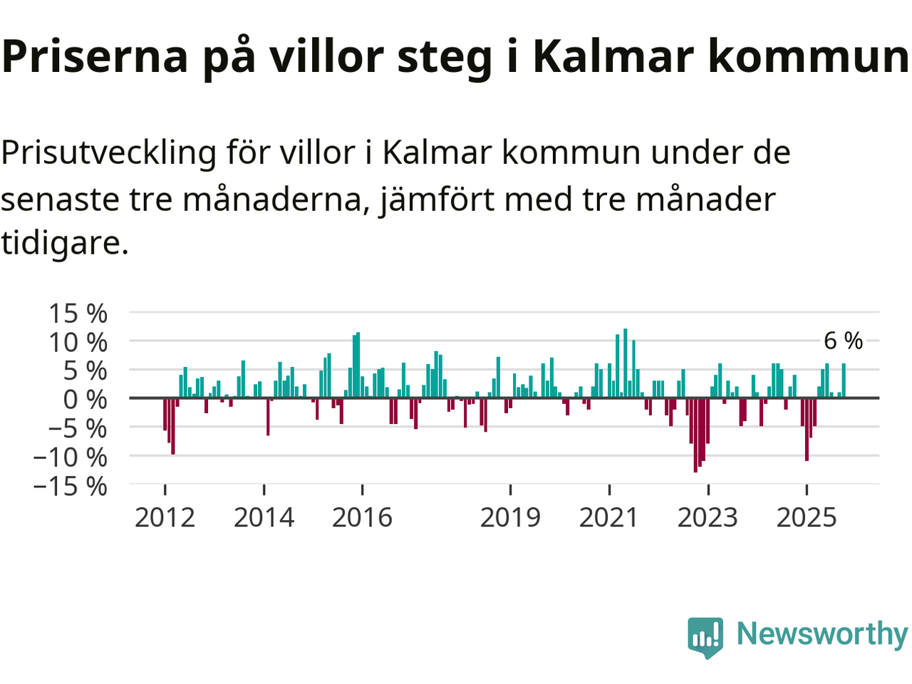Villapriserna steg mellan augusti och oktober med 6 procent i Kalmar kommun. Det är en betydande uppgång jämfört med det gångna året då priserna i snitt sjunkit med 1 procent.