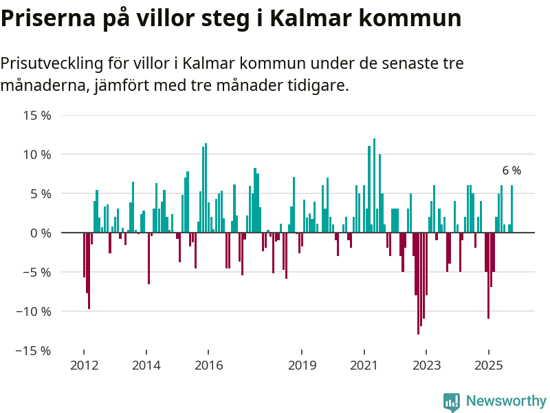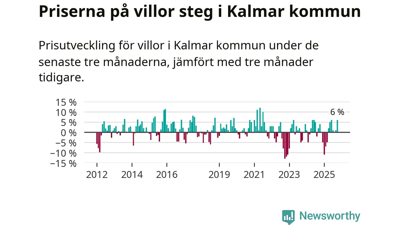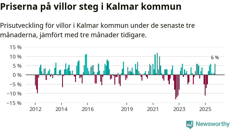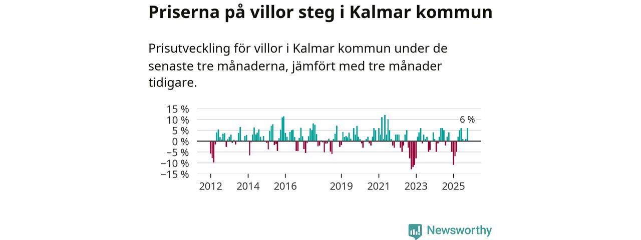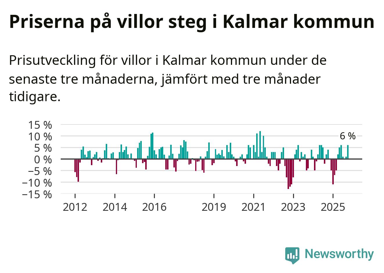Villapriserna steg mellan augusti och oktober med 6 procent i Kalmar kommun. Det är en betydande uppgång jämfört med det gångna året då priserna i snitt sjunkit med 1 procent.