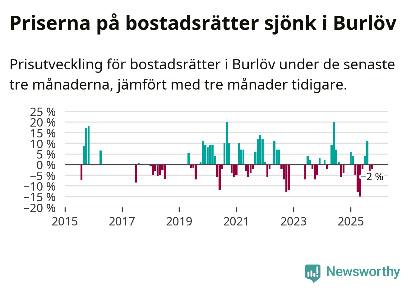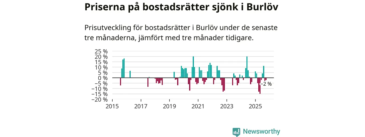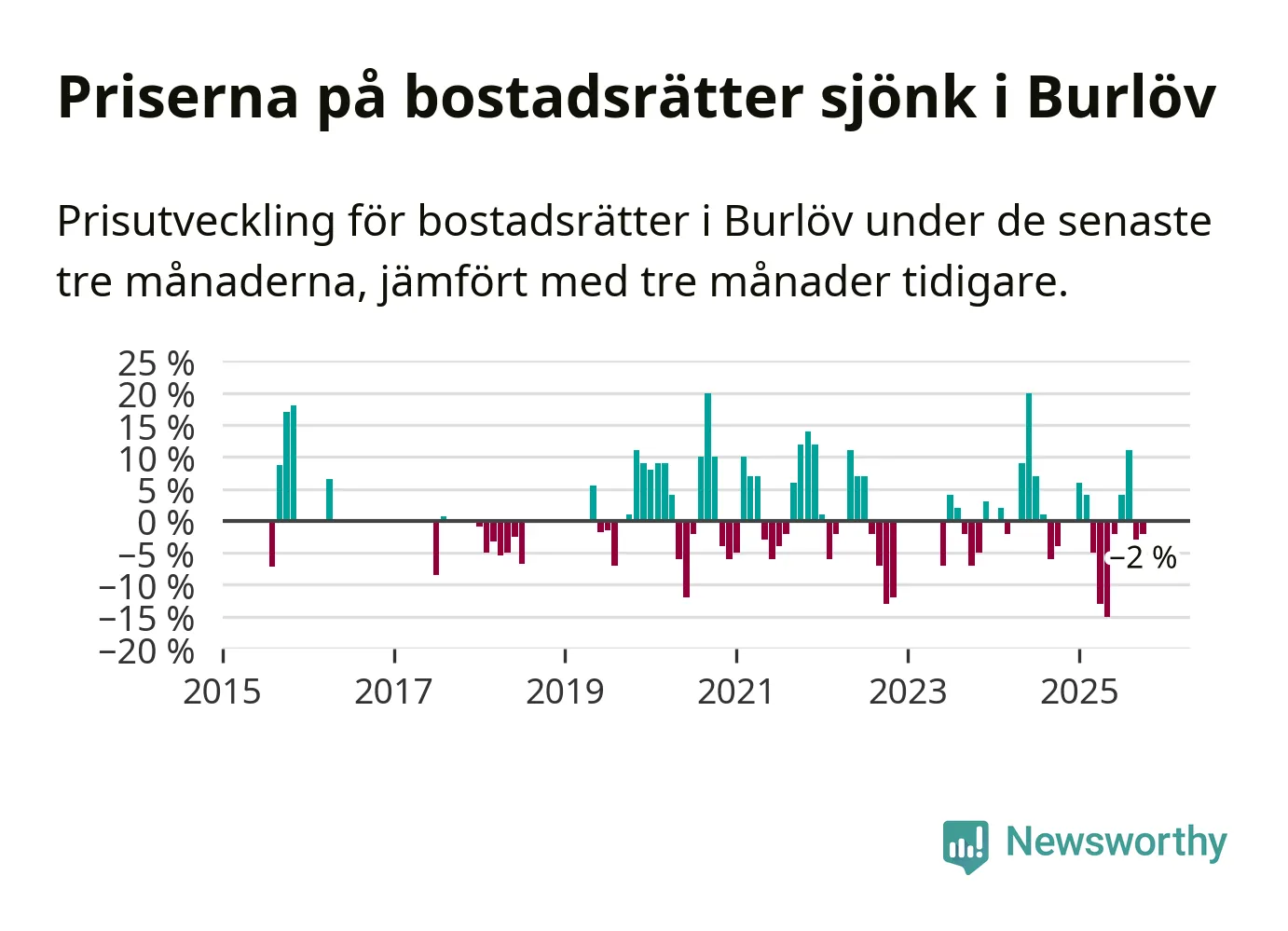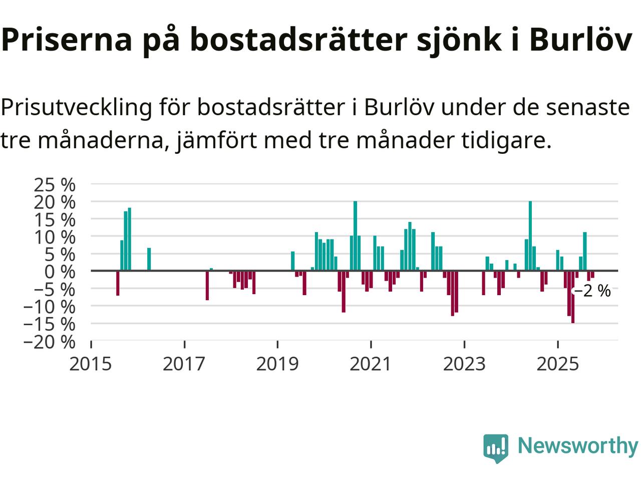 Priserna på bostadsrätter har gått ner i Burlövs kommun. Medelpriset på försäljningarna under de senaste tre månaderna visar på en nedgång med 2 procent.