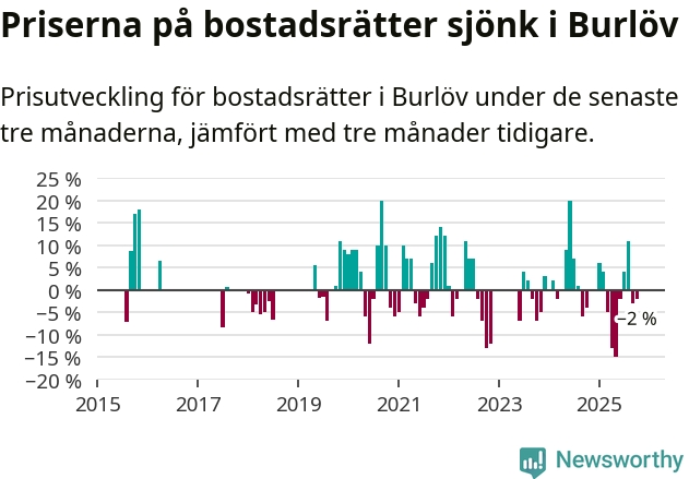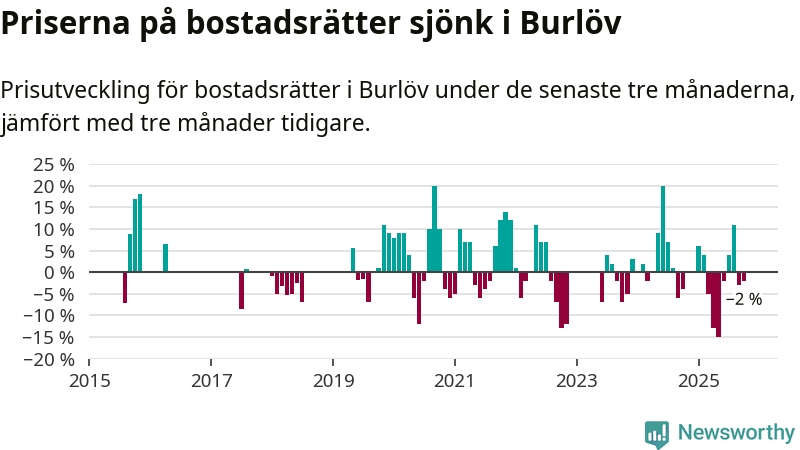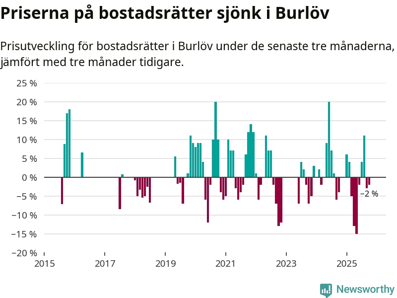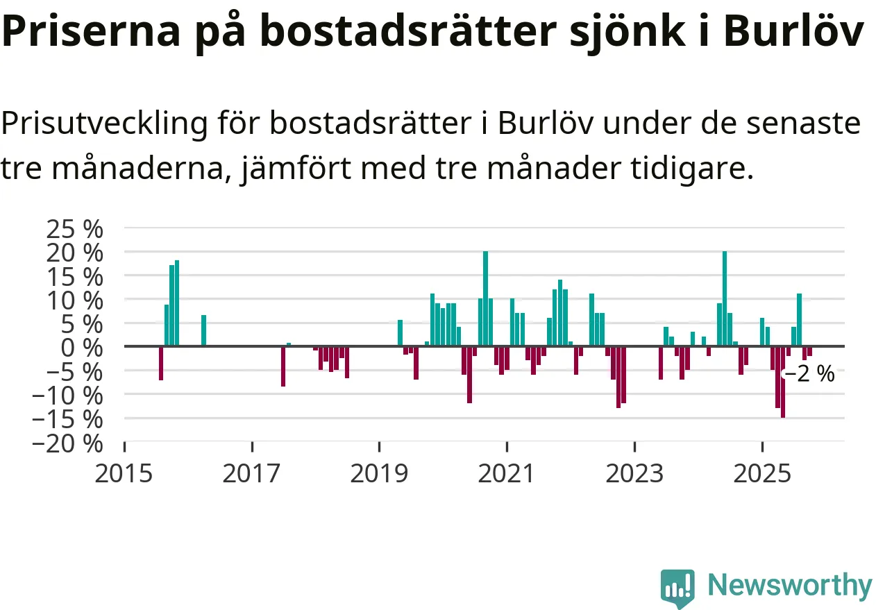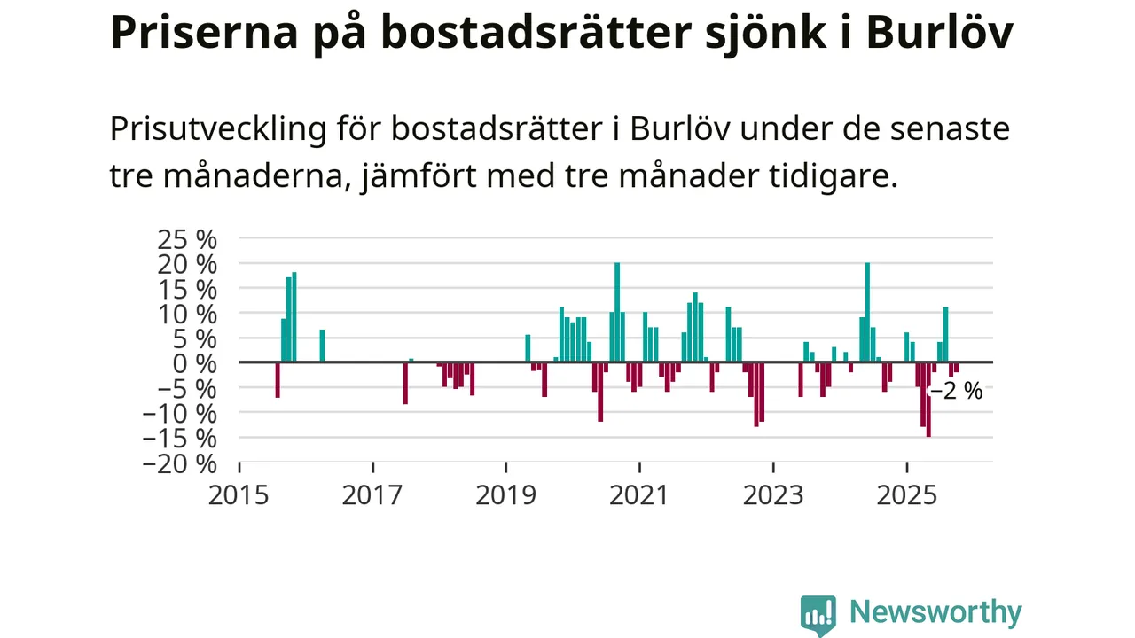 Priserna på bostadsrätter har gått ner i Burlövs kommun. Medelpriset på försäljningarna under de senaste tre månaderna visar på en nedgång med 2 procent.
