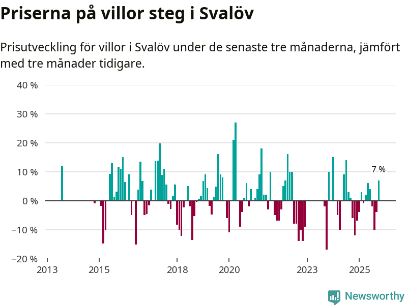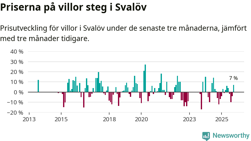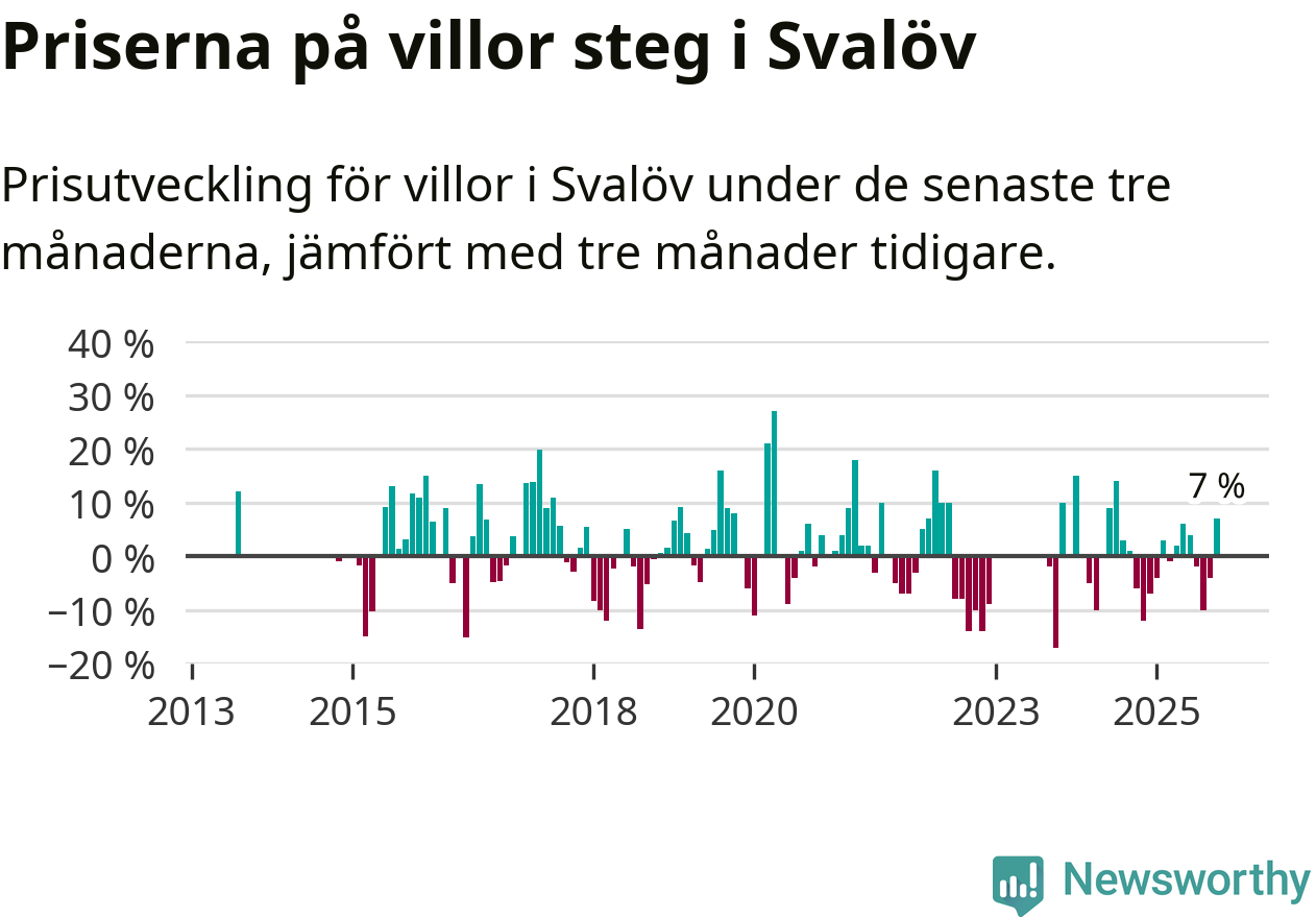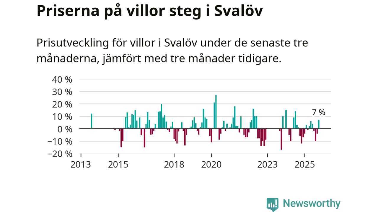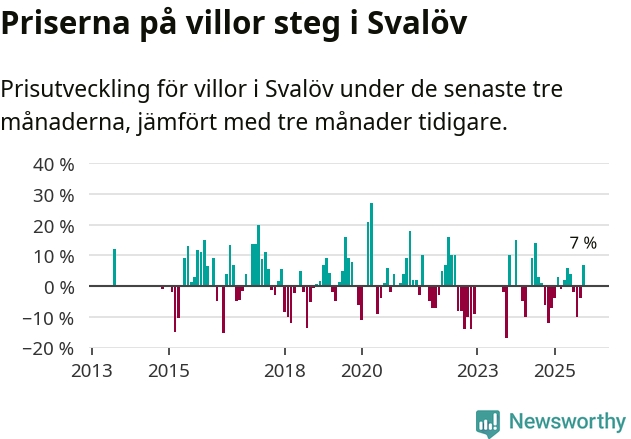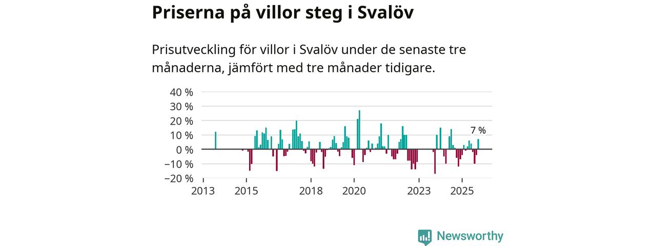 Villapriserna har gått upp i Svalövs kommun. Medelpriset på försäljningarna under de senaste tre månaderna visar på en uppgång med 7 procent.