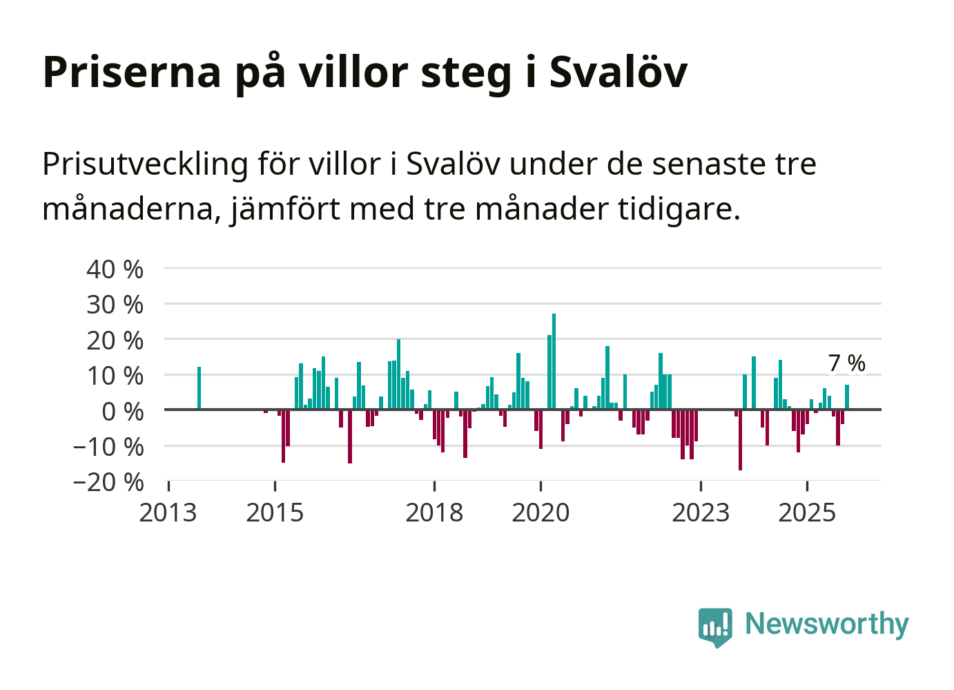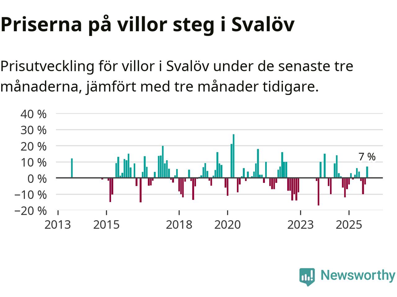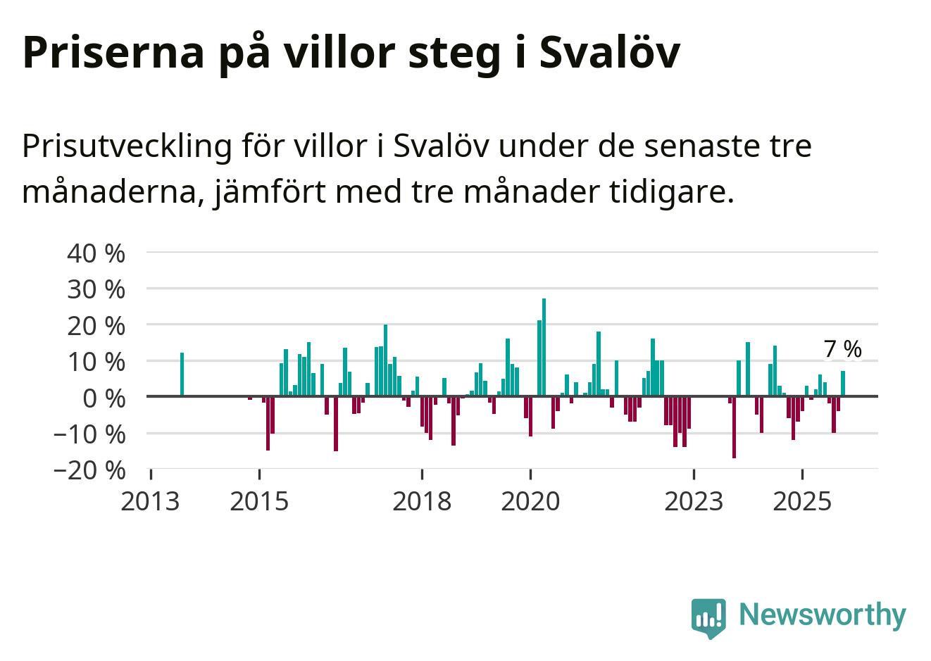 Villapriserna har gått upp i Svalövs kommun. Medelpriset på försäljningarna under de senaste tre månaderna visar på en uppgång med 7 procent.