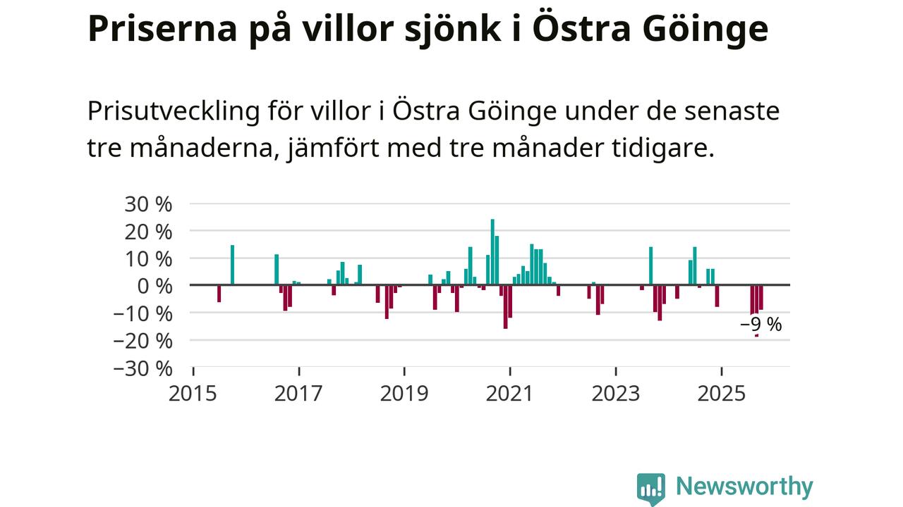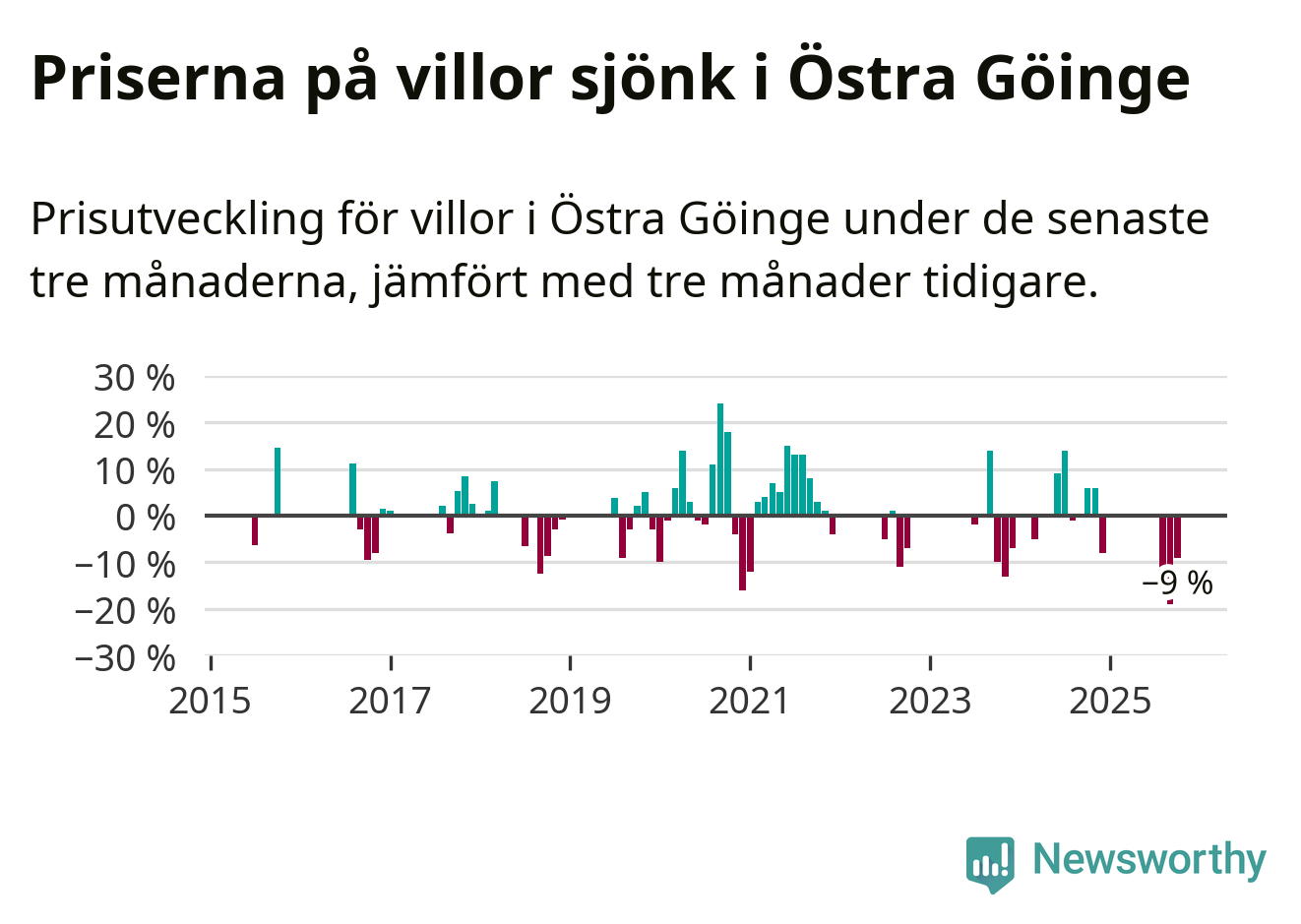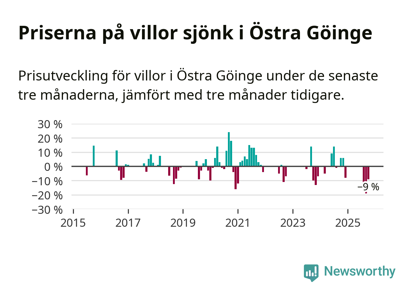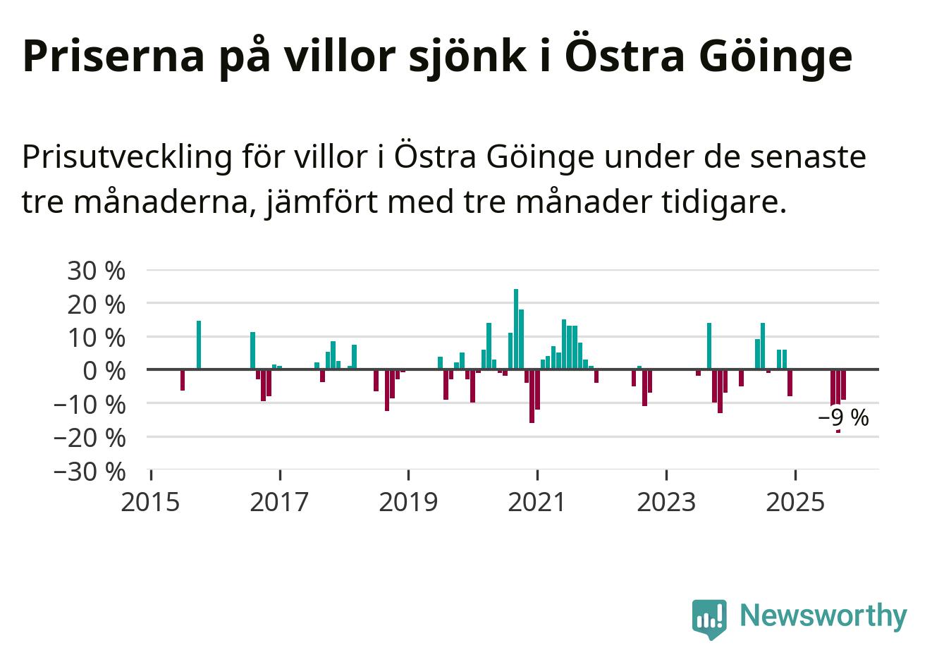 Statistiken visar även på en stor prisnedgång i Östra Göinge kommun. Medelpriset på försäljningarna av villor i kommunen var 9 procent lägre än för tre månader sedan. I hela Skåne däremot ligger villapriserna stilla.