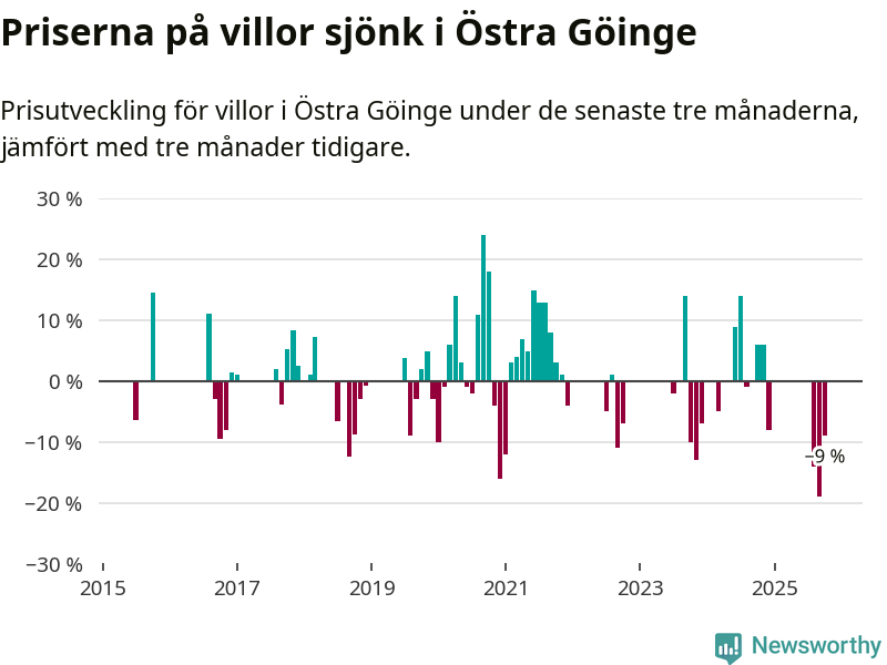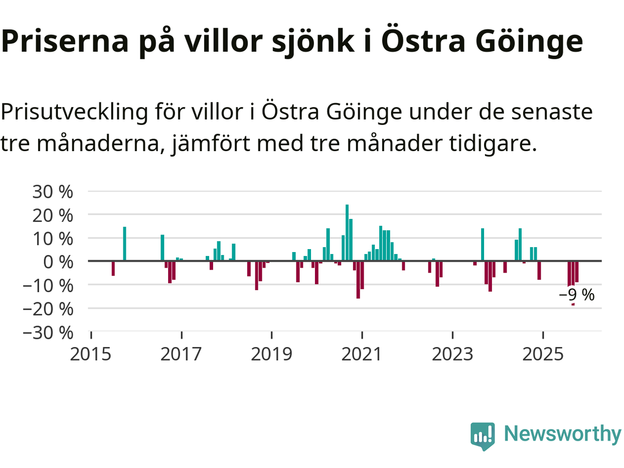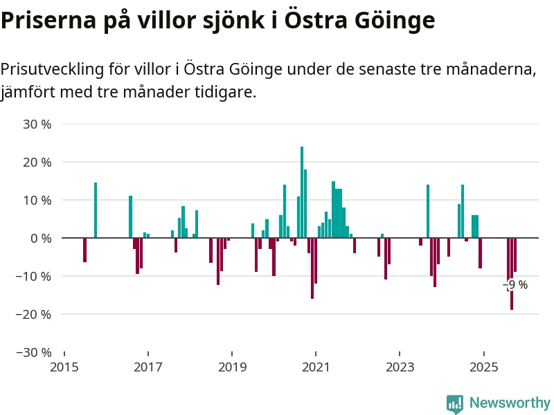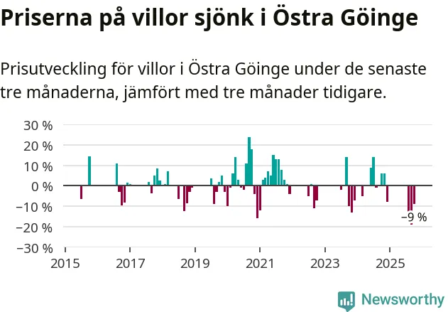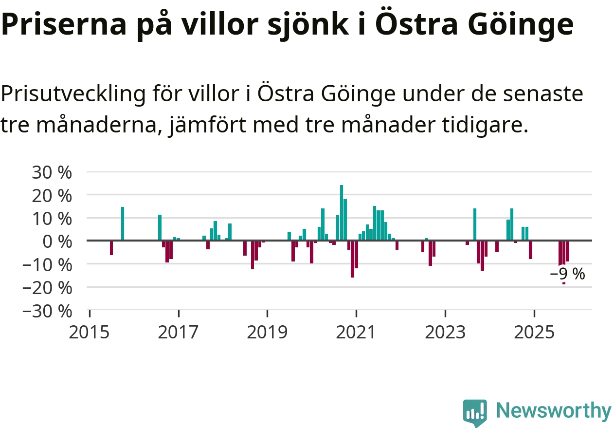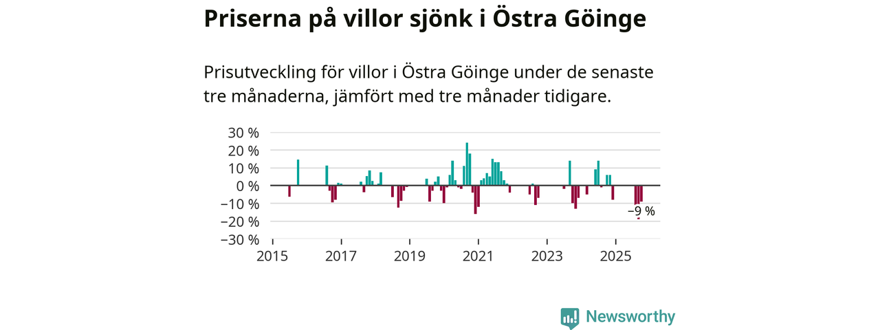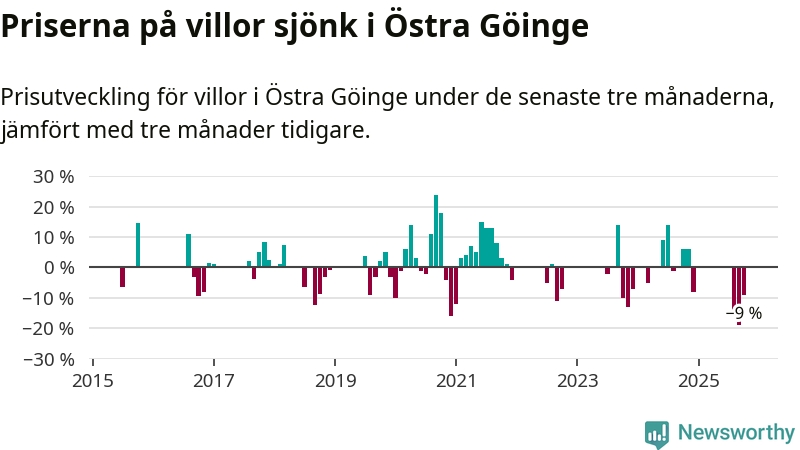 Statistiken visar även på en stor prisnedgång i Östra Göinge kommun. Medelpriset på försäljningarna av villor i kommunen var 9 procent lägre än för tre månader sedan. I hela Skåne däremot ligger villapriserna stilla.