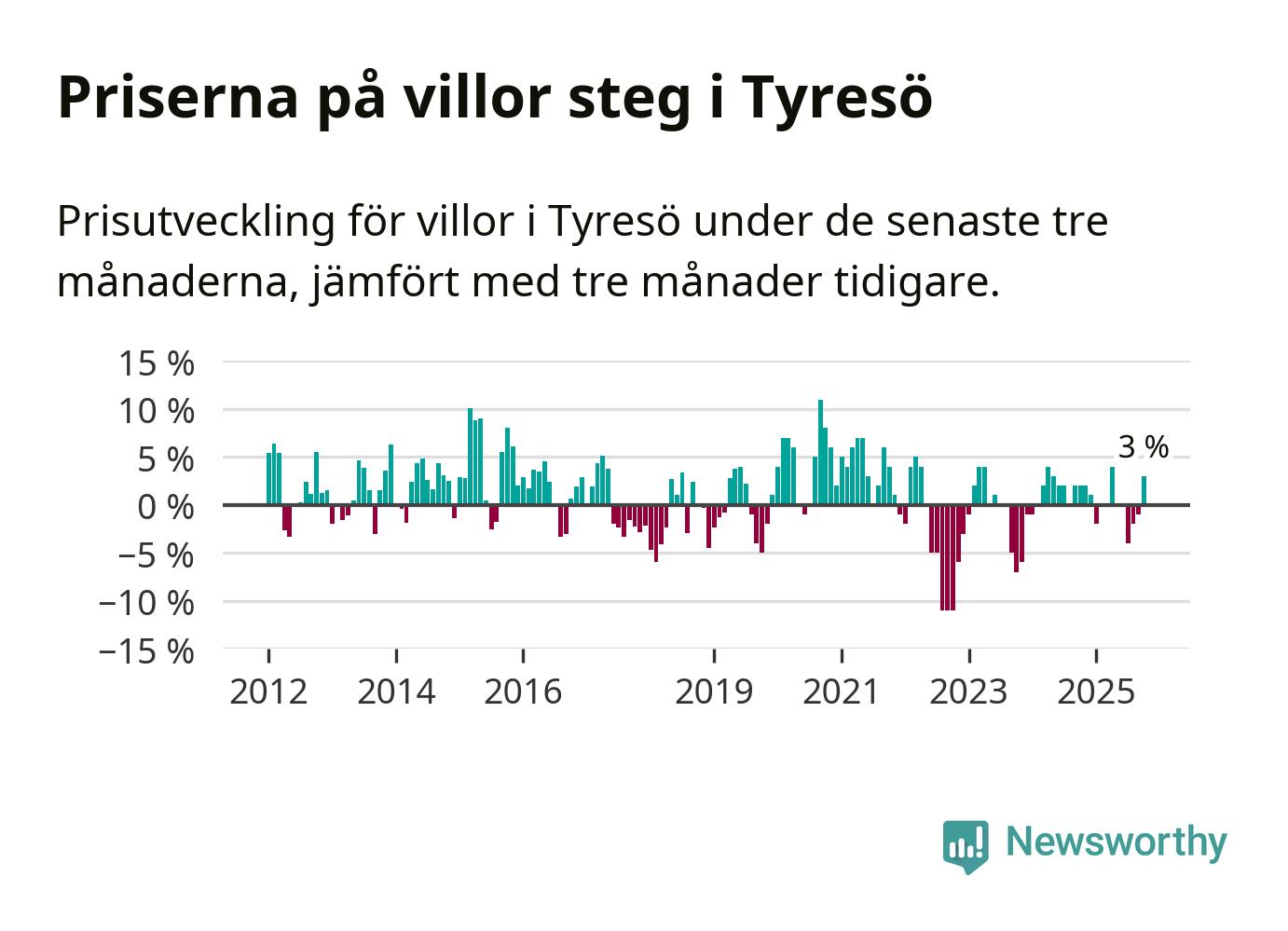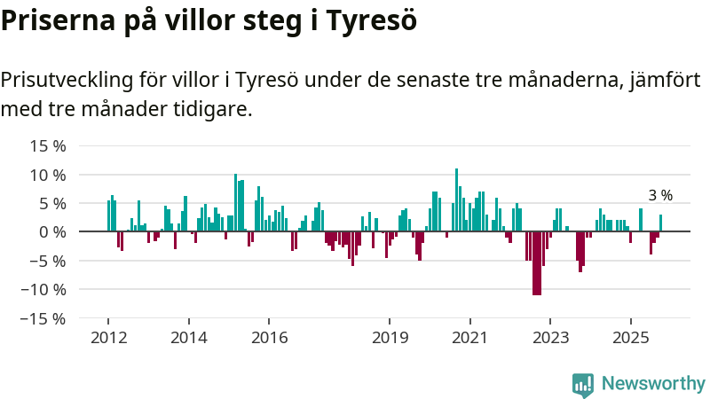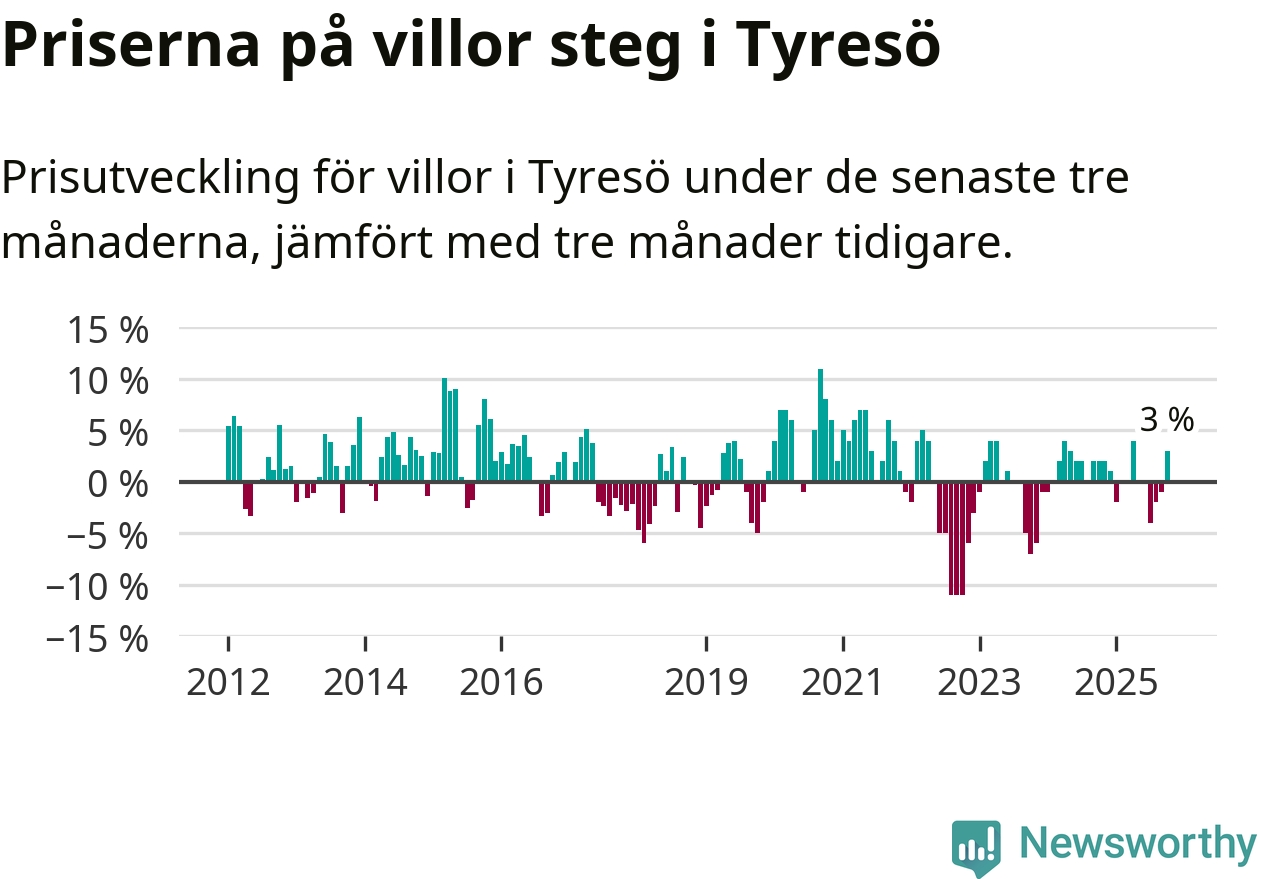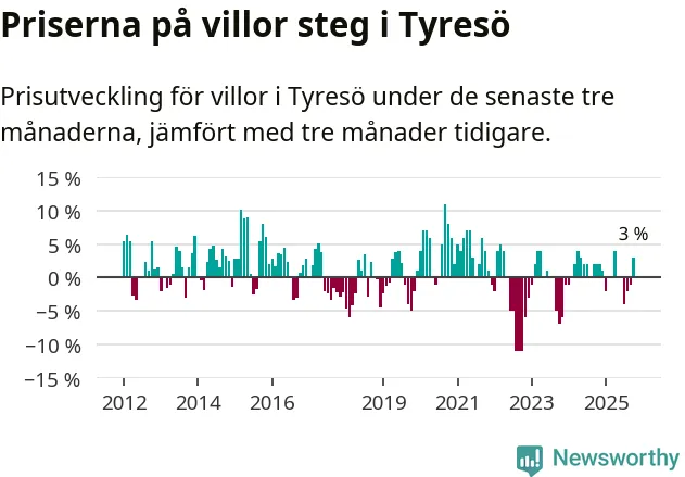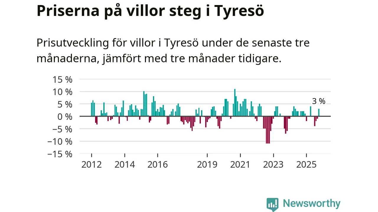 Villapriserna har gått upp i Tyresö kommun. Medelpriset på försäljningarna under de senaste tre månaderna visar på en uppgång med 3 procent.