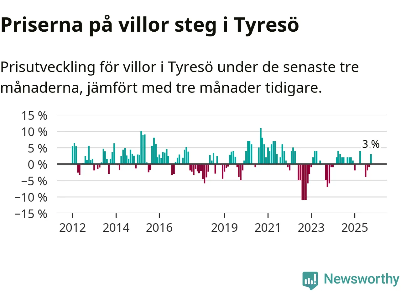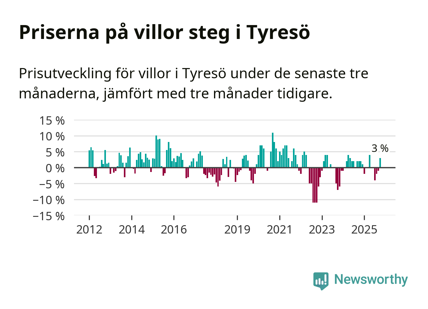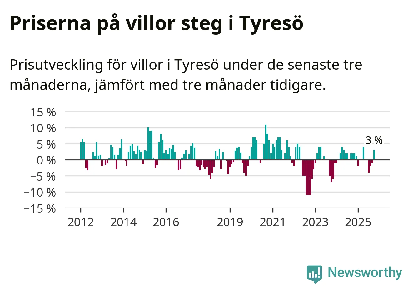 Villapriserna har gått upp i Tyresö kommun. Medelpriset på försäljningarna under de senaste tre månaderna visar på en uppgång med 3 procent.