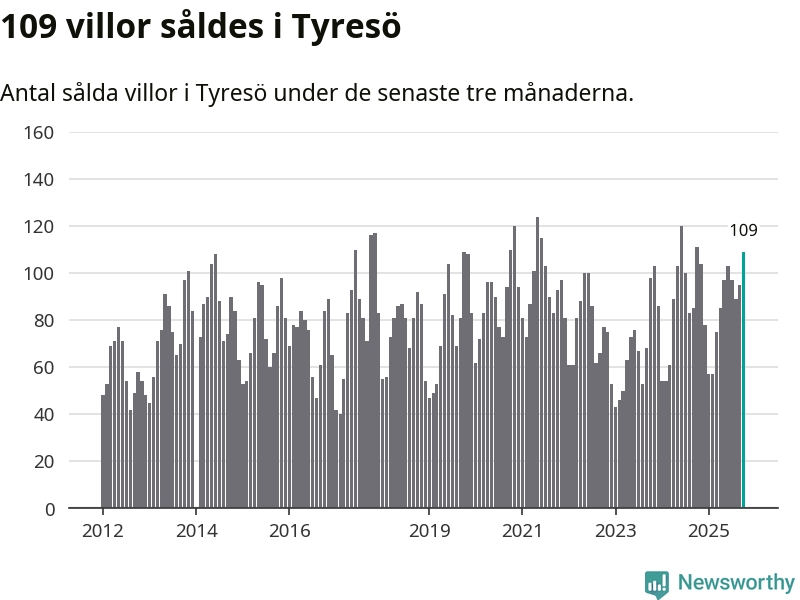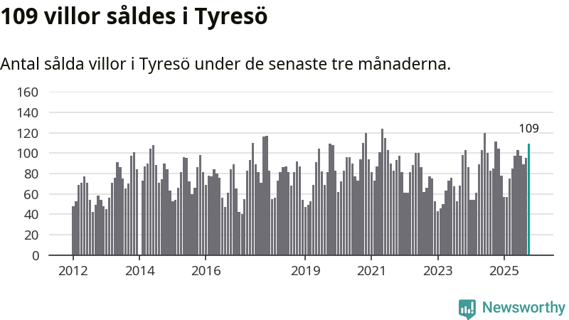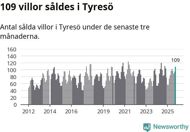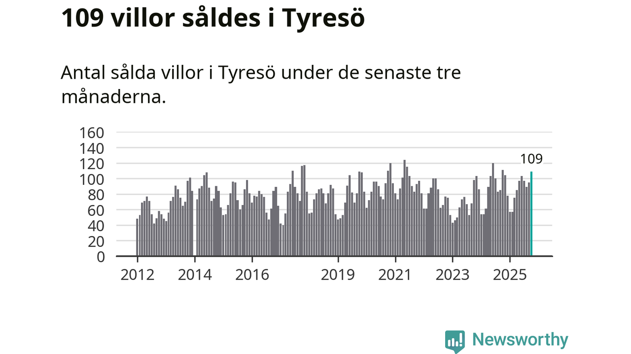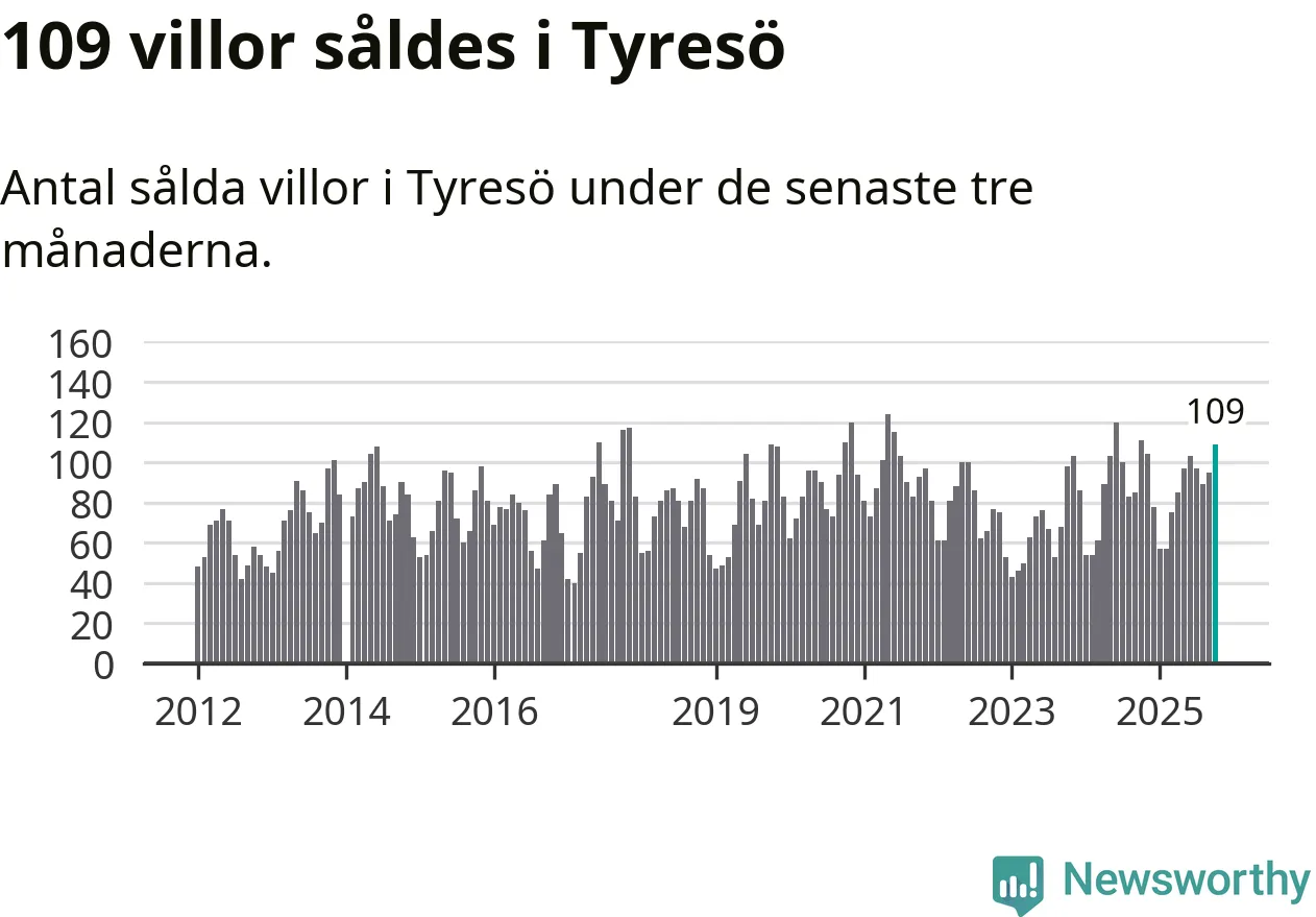 Sammanlagt såldes 109 villor i Tyresö kommun mellan augusti och oktober till ett genomsnittligt pris på 6,9 miljoner kronor. I fjol gjordes 111 affärer vid den här tiden på året.