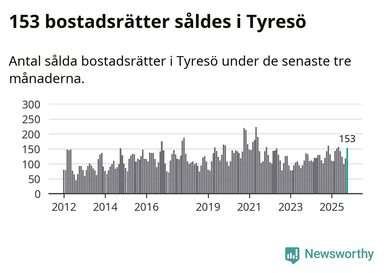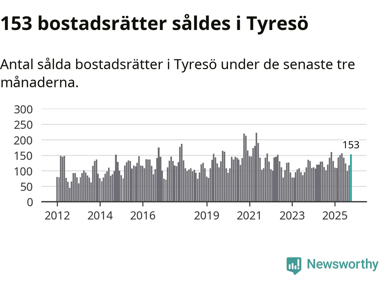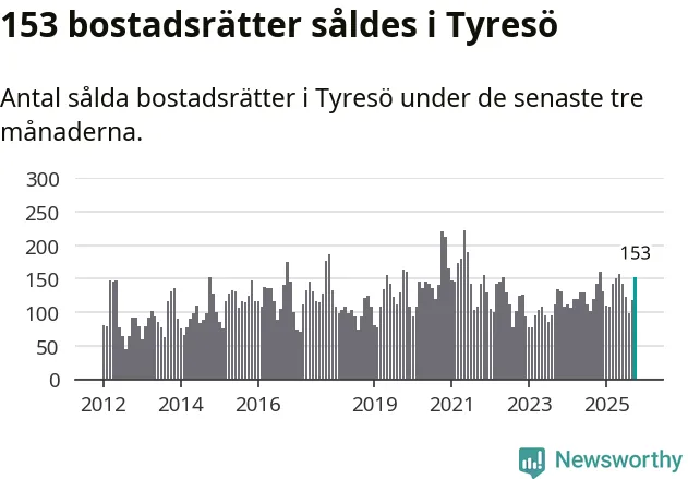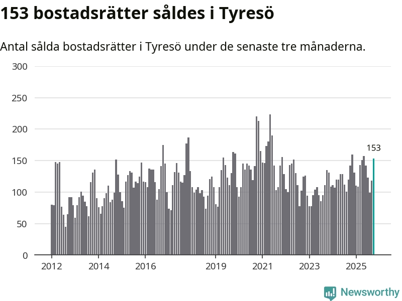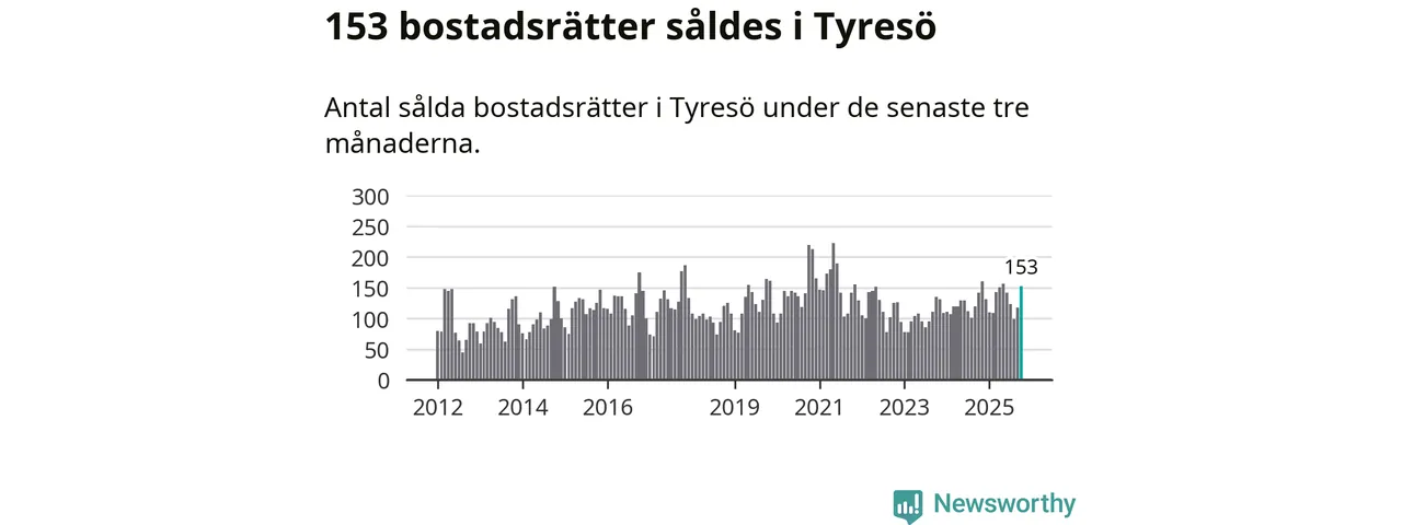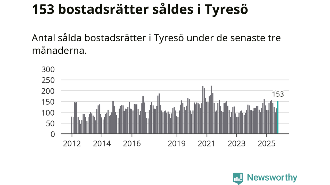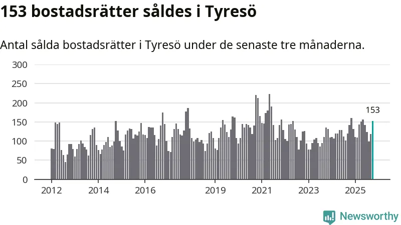 Sammanlagt såldes 153 bostadsrätter i Tyresö kommun mellan augusti och oktober till ett genomsnittligt pris på 2,8 miljoner kronor. I fjol gjordes 142 affärer vid den här tiden på året.