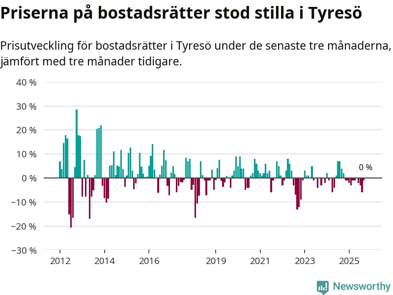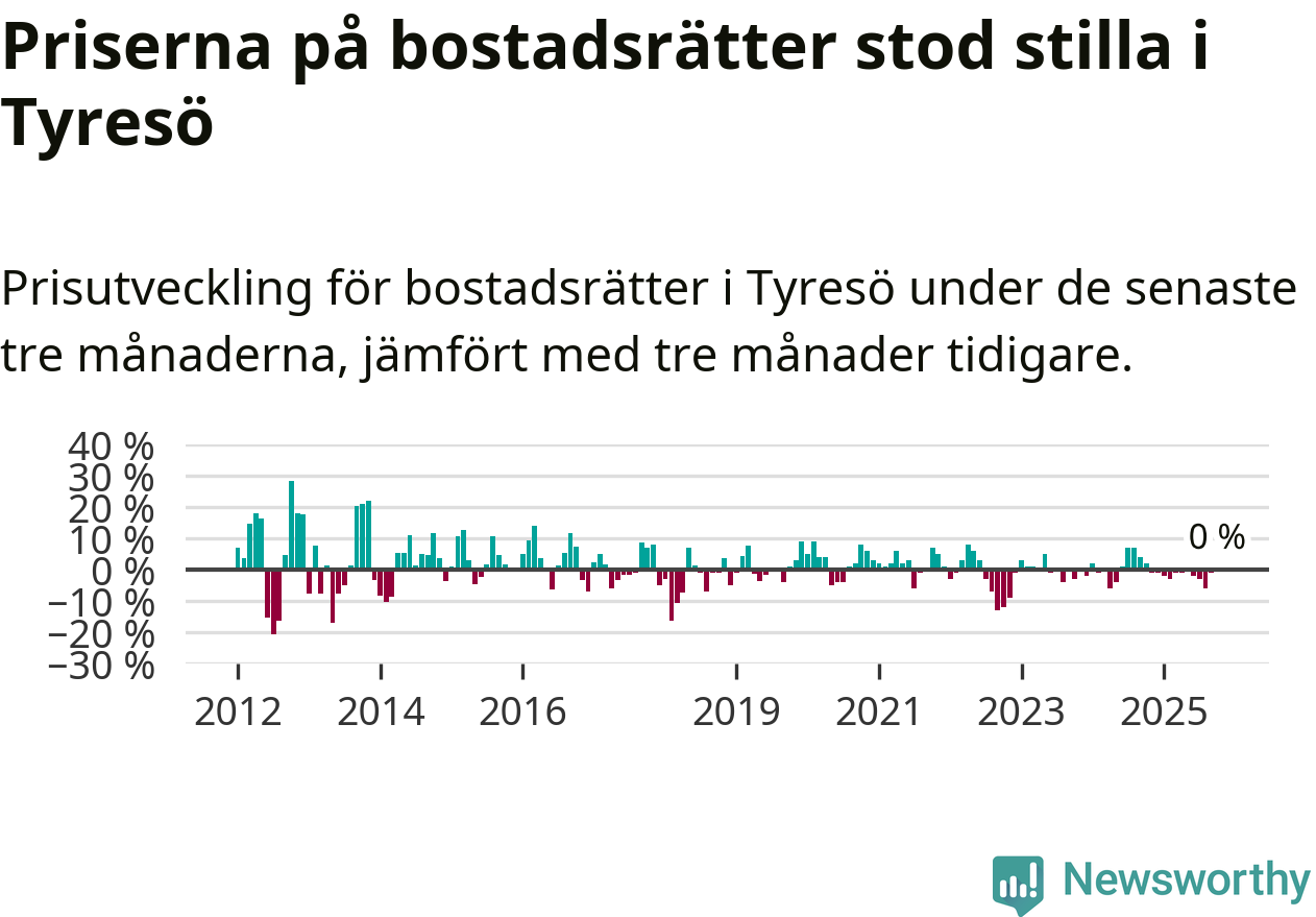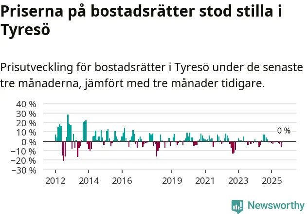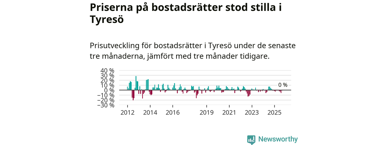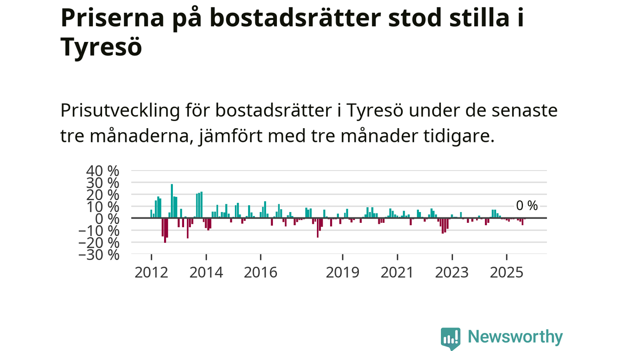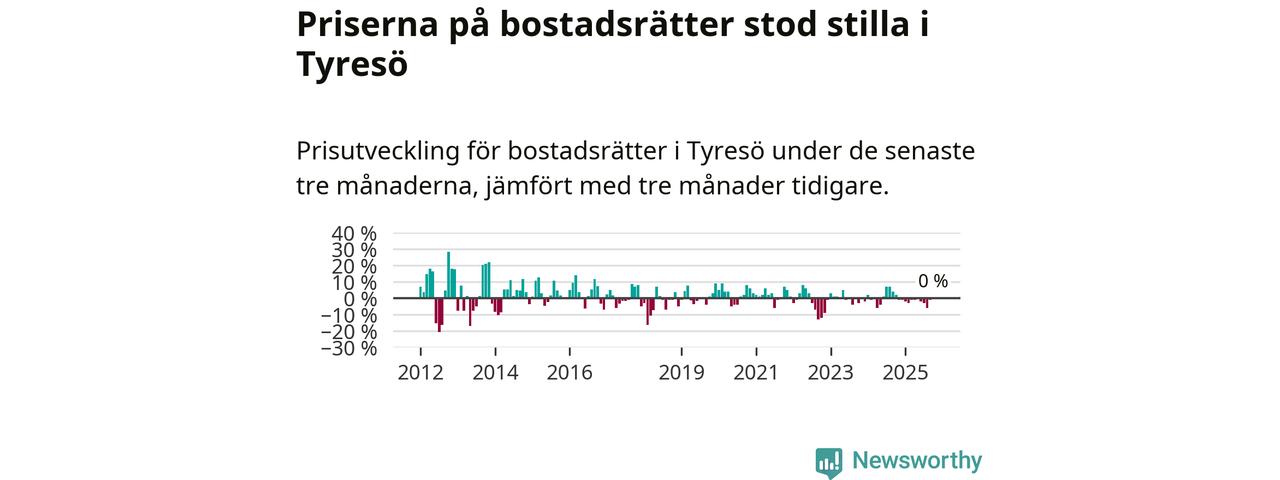 Priserna på bostadsrätter står i stort sett stilla i Tyresö kommun. Medelpriset på de på försäljningarna under de senaste tre månaderna låg på samma nivå som för tre månader sedan.