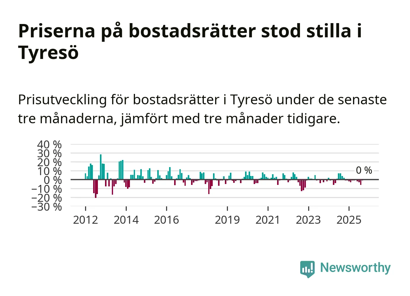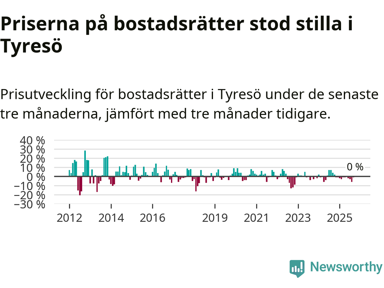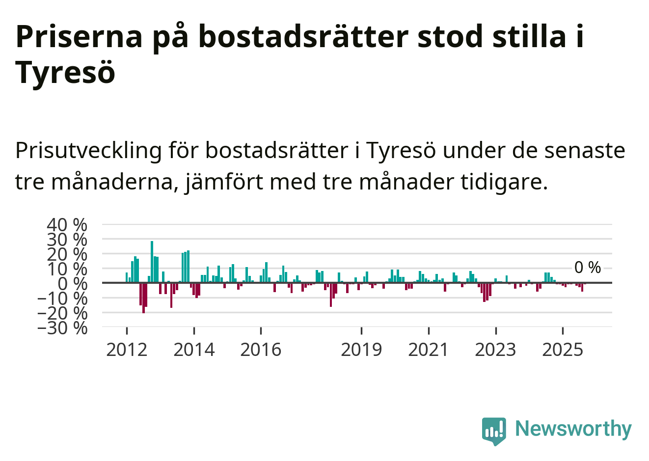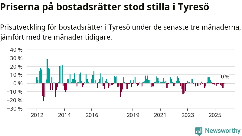 Priserna på bostadsrätter står i stort sett stilla i Tyresö kommun. Medelpriset på de på försäljningarna under de senaste tre månaderna låg på samma nivå som för tre månader sedan.
