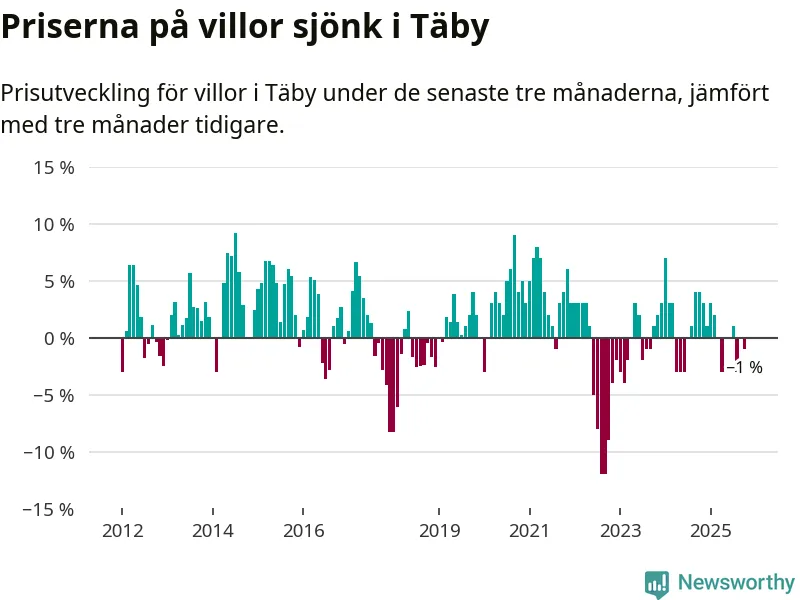 Statistiken visar även på en prisnedgång i Täby kommun. Medelpriset på försäljningarna av villor i kommunen var 1 procent lägre än för tre månader sedan. Även i hela Stockholms län sjunker villapriserna. I hela länet noterades en prisnedgång på 1 procent.