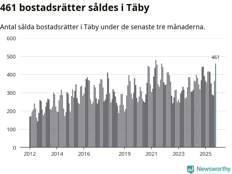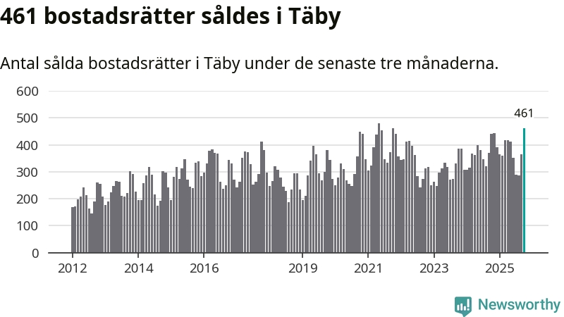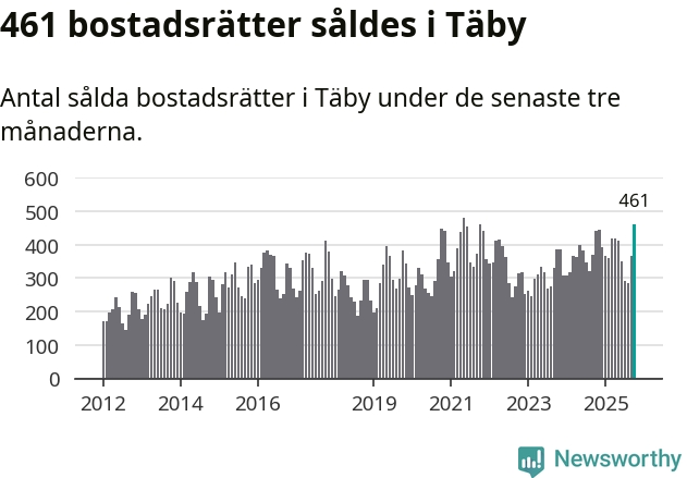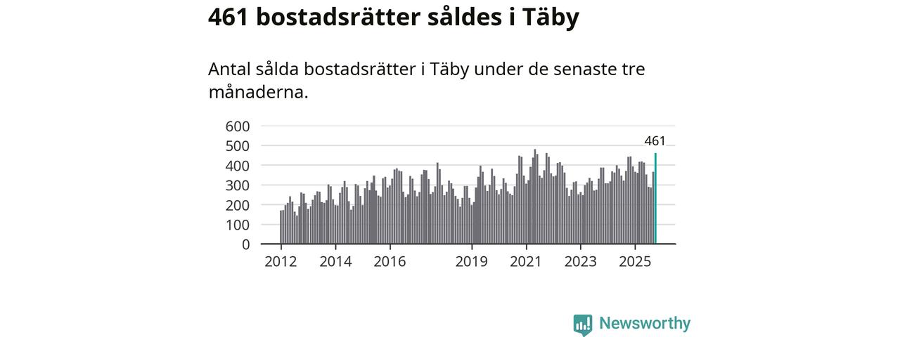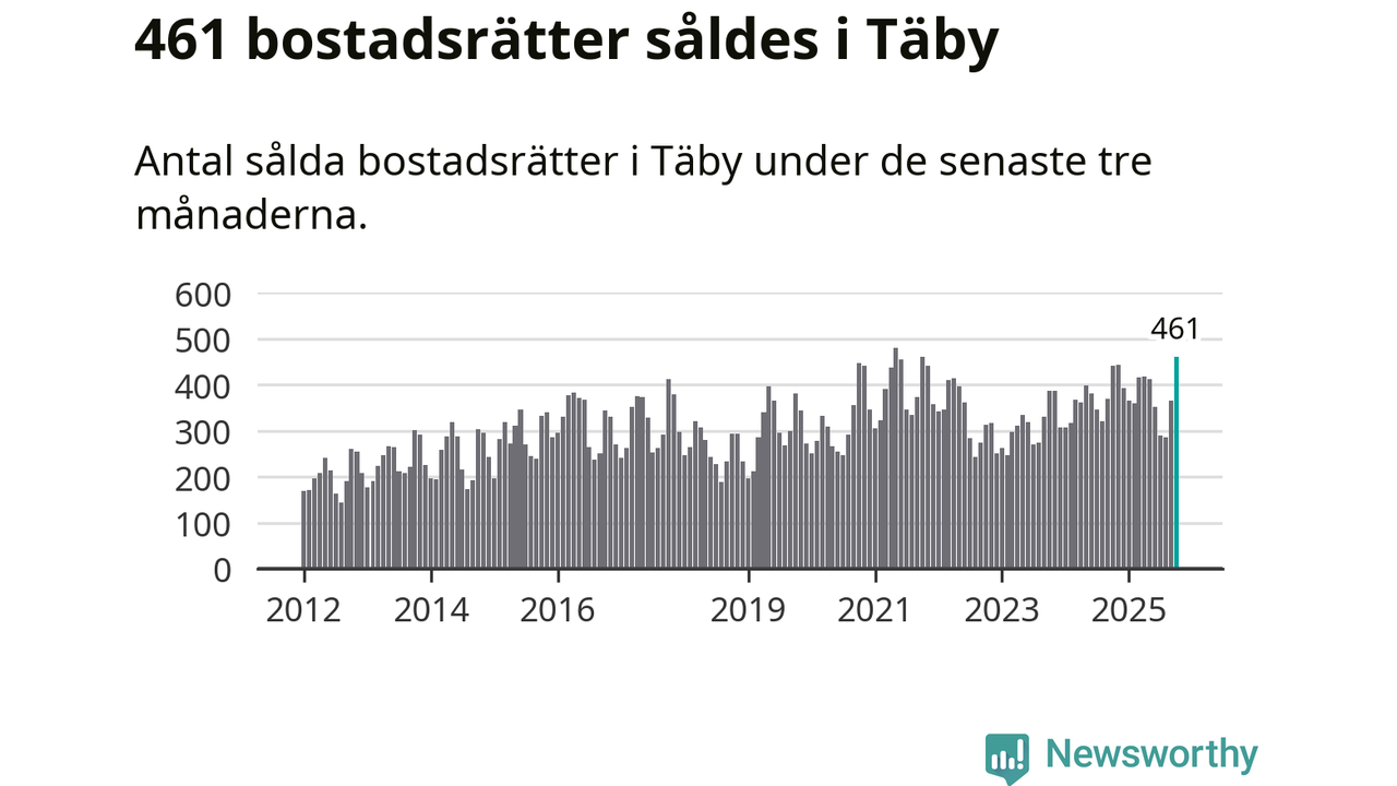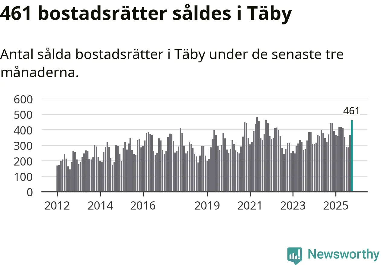 Mellan augusti och oktober såldes 461 bostadsrätter i Täby kommun. Det är fler än någon tremånadersperiod sedan 2021.
