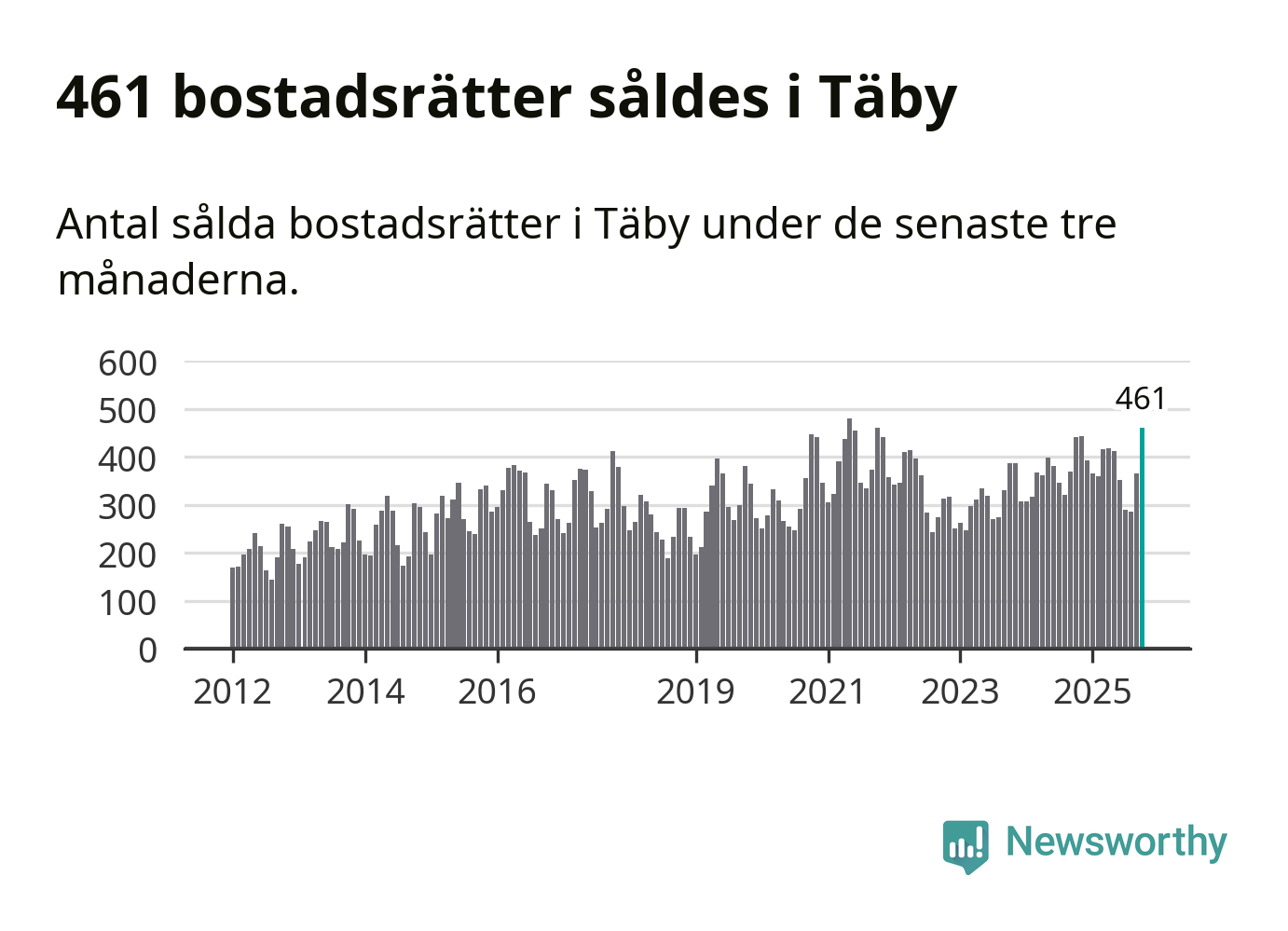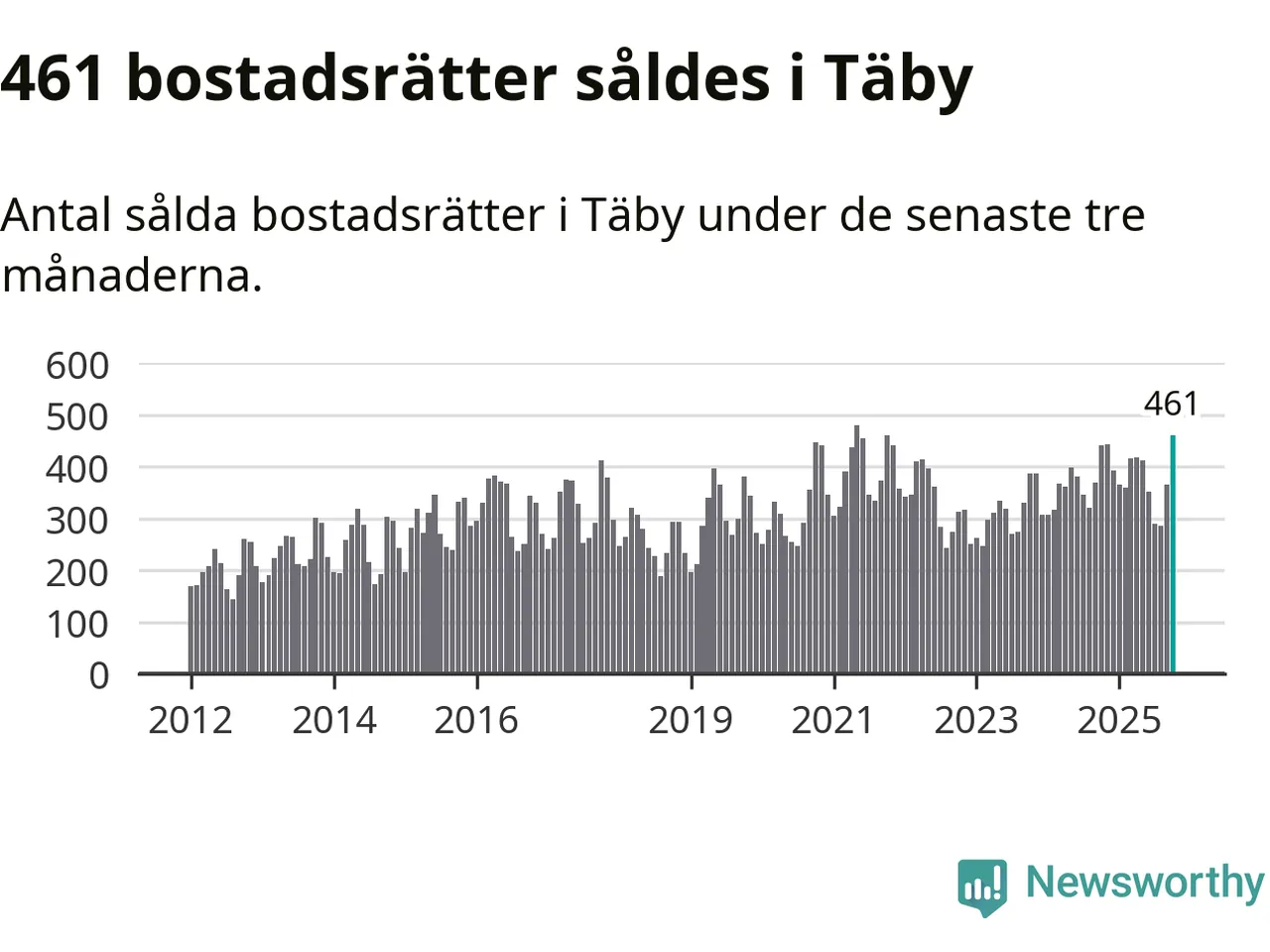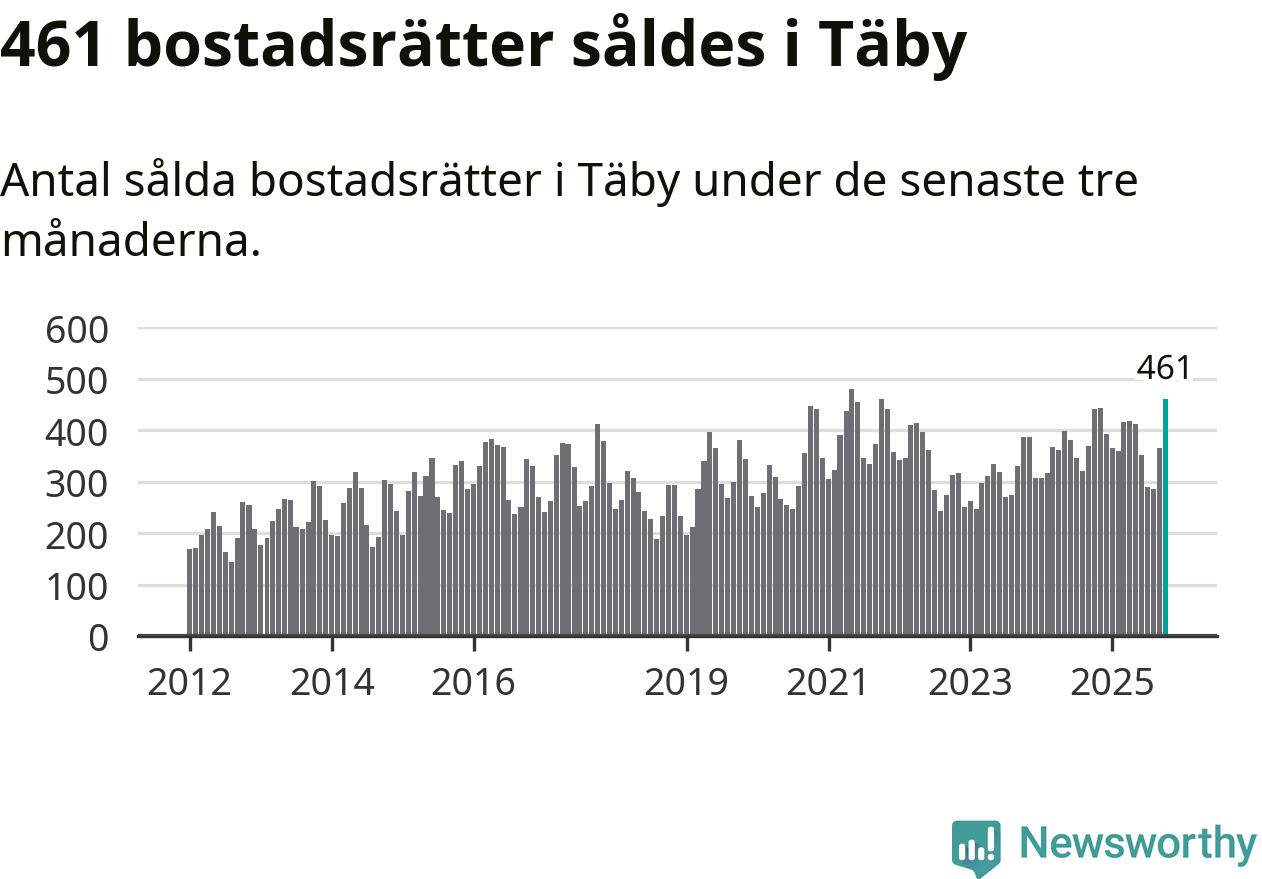 Mellan augusti och oktober såldes 461 bostadsrätter i Täby kommun. Det är fler än någon tremånadersperiod sedan 2021.