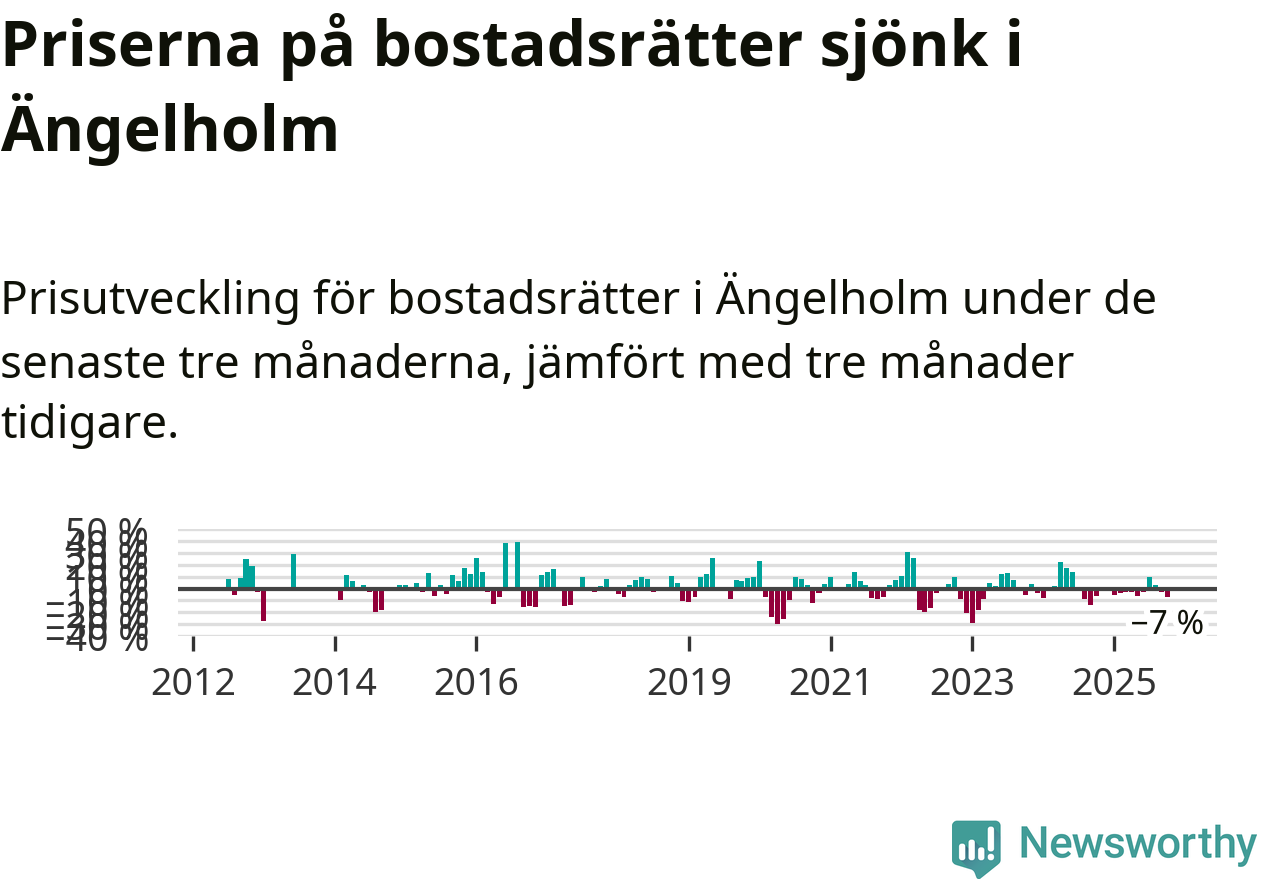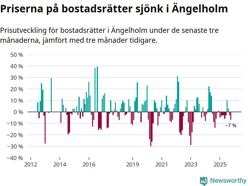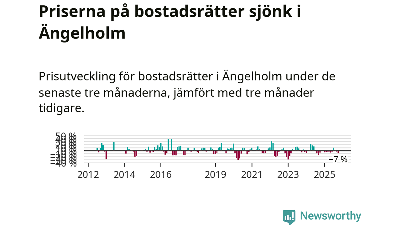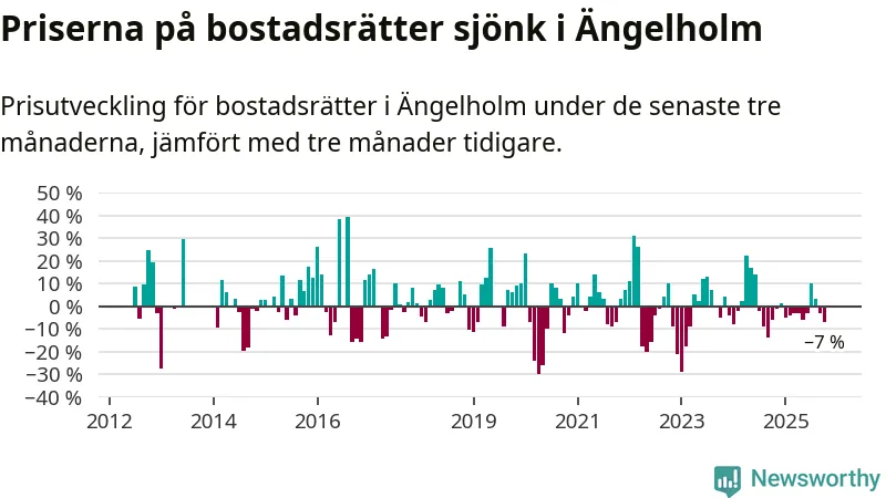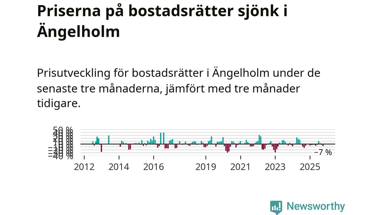 Statistiken visar även på en kännbar prisnedgång i Ängelholms kommun. Medelpriset på försäljningarna av bostadsrätter i kommunen var 7 procent lägre än för tre månader sedan. Även i hela Skåne sjunker priserna på bostadsrätter. I hela länet noterades en prisnedgång på 1 procent.
