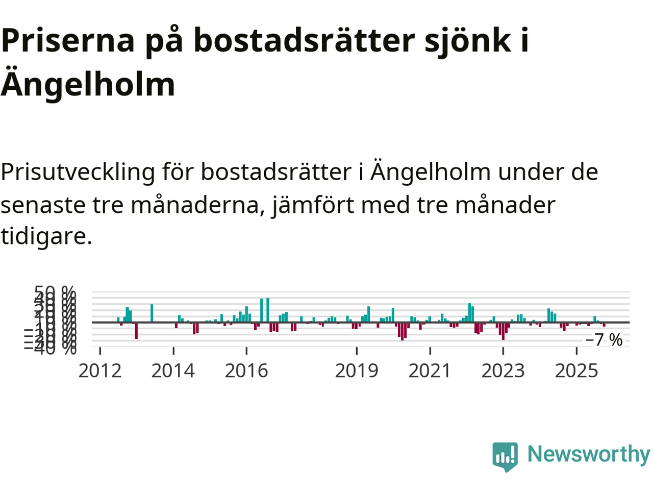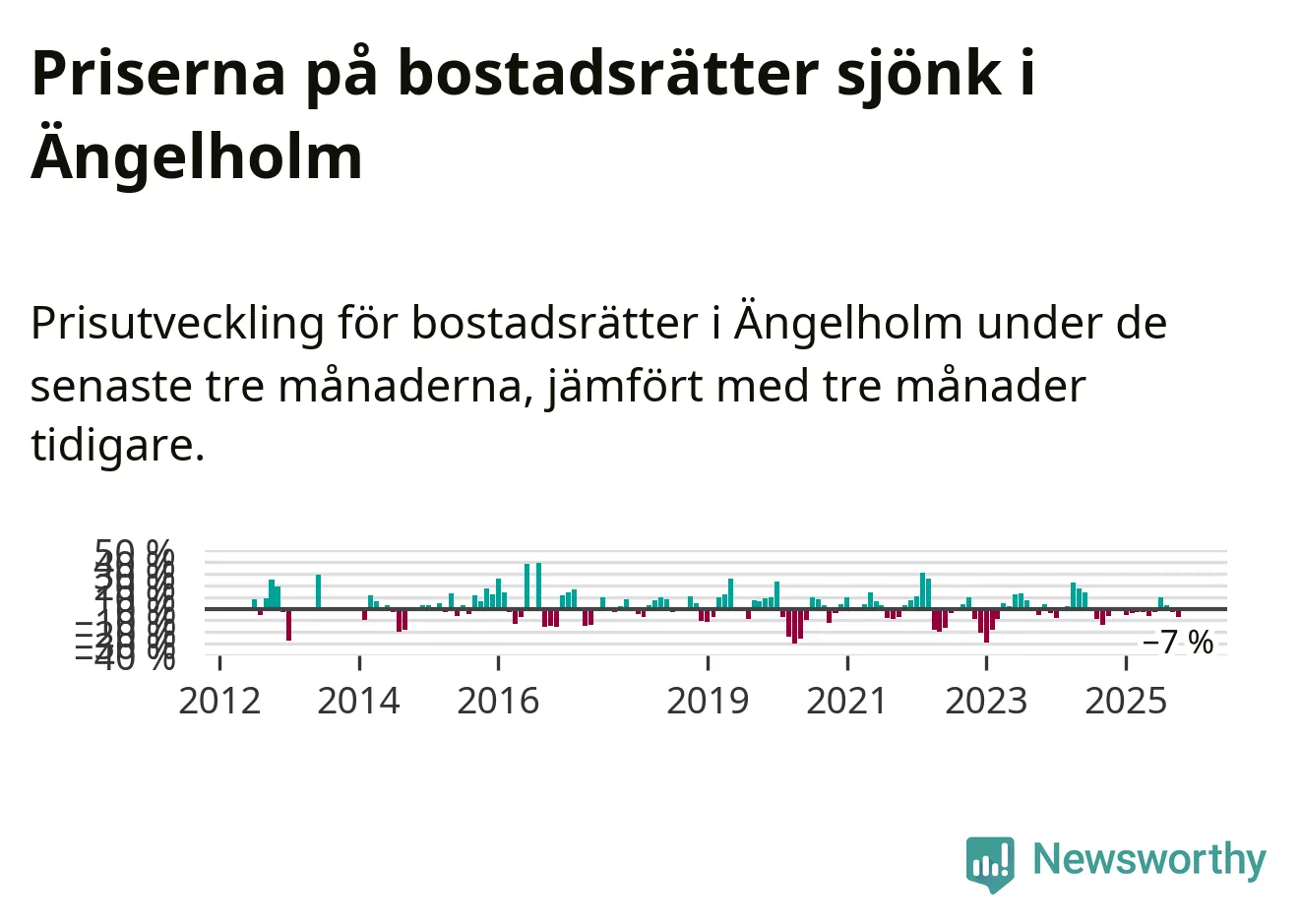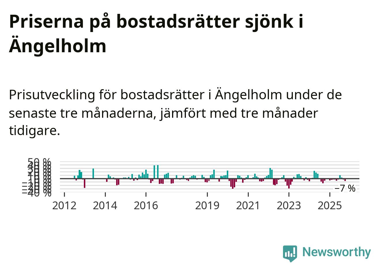 Statistiken visar även på en kännbar prisnedgång i Ängelholms kommun. Medelpriset på försäljningarna av bostadsrätter i kommunen var 7 procent lägre än för tre månader sedan. Även i hela Skåne sjunker priserna på bostadsrätter. I hela länet noterades en prisnedgång på 1 procent.