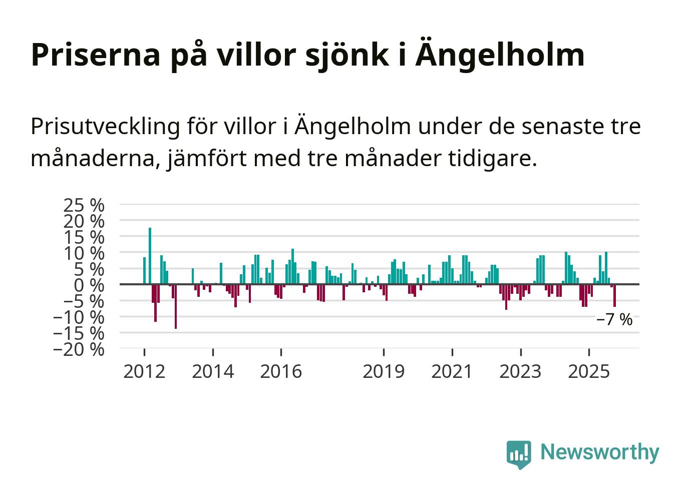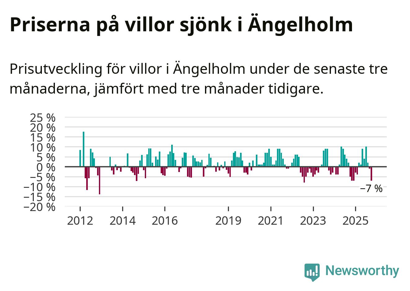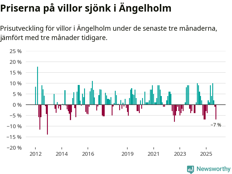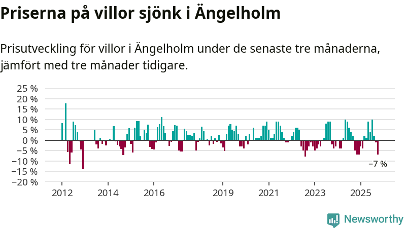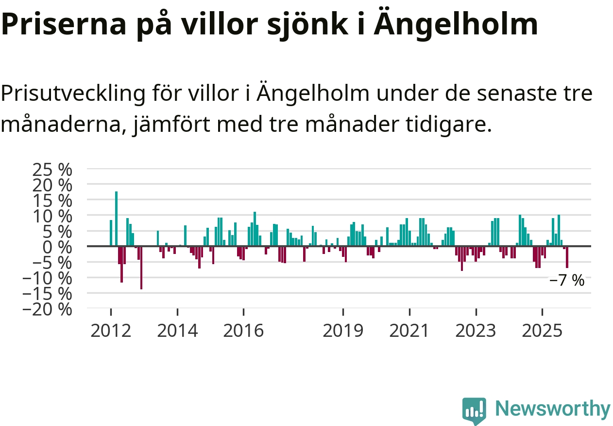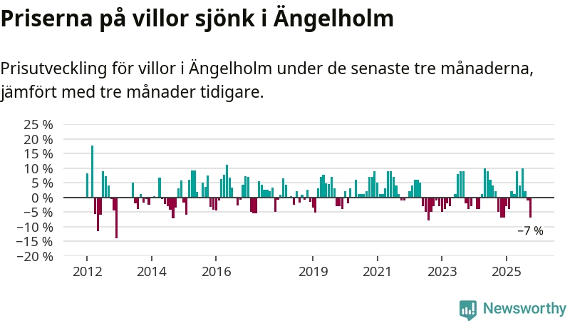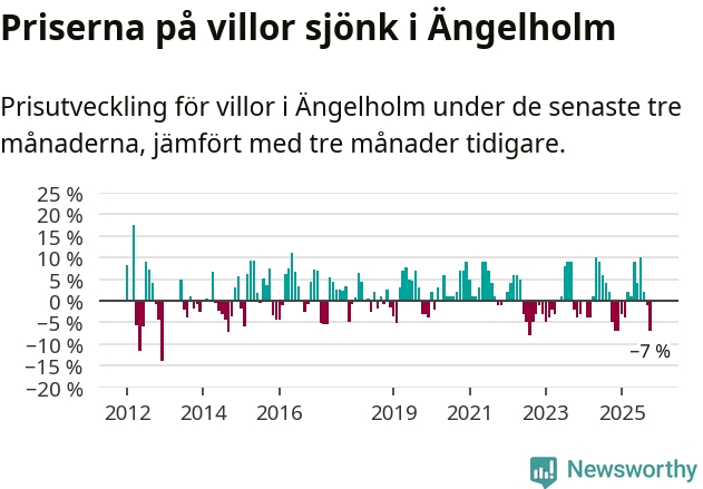 Villapriserna har gått ner i Ängelholms kommun. Medelpriset på försäljningarna under de senaste tre månaderna visar på en nedgång med 7 procent.