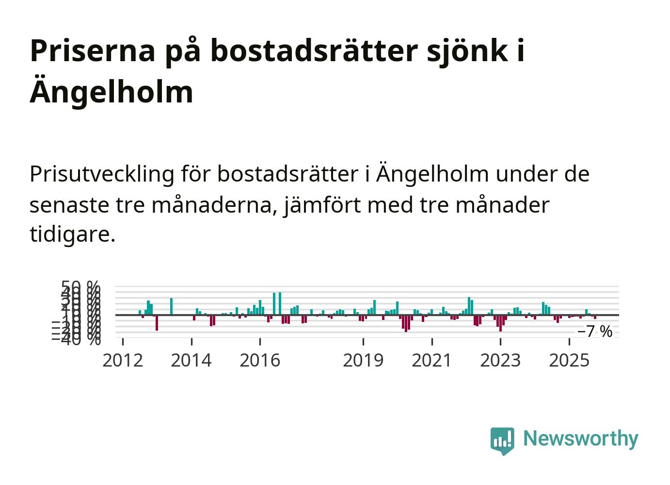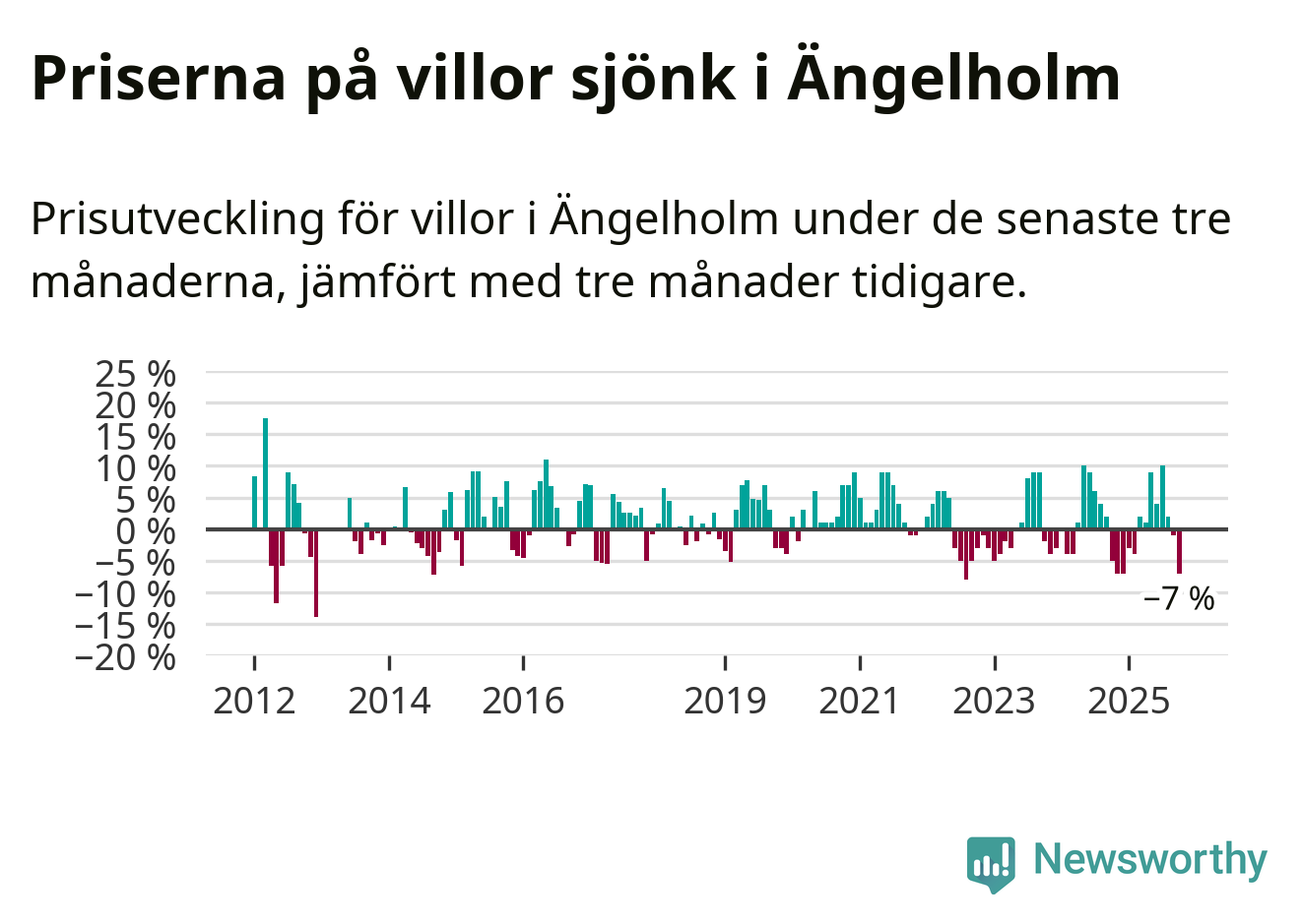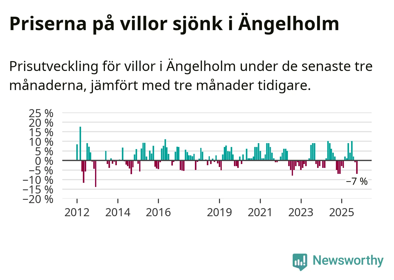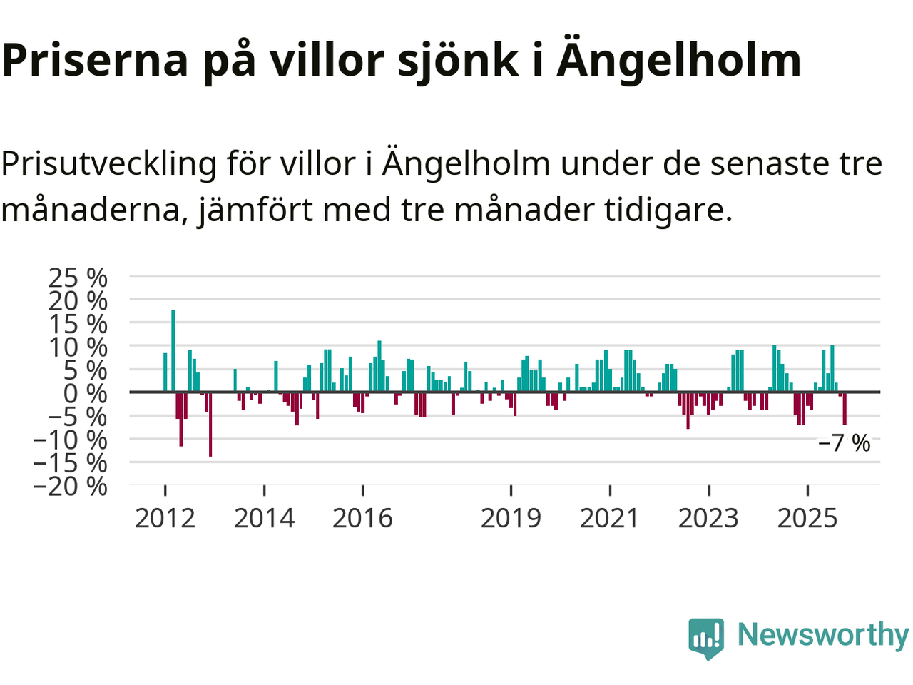 Villapriserna har gått ner i Ängelholms kommun. Medelpriset på försäljningarna under de senaste tre månaderna visar på en nedgång med 7 procent.
