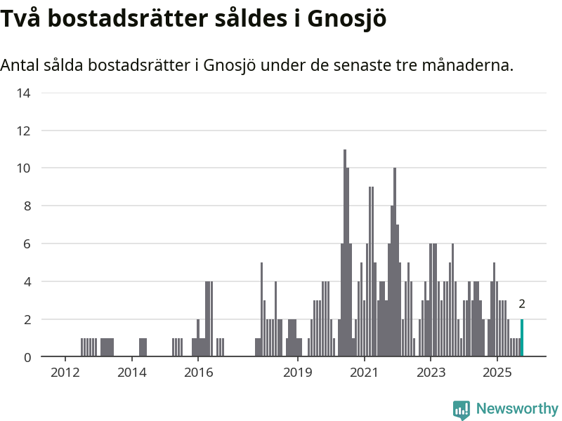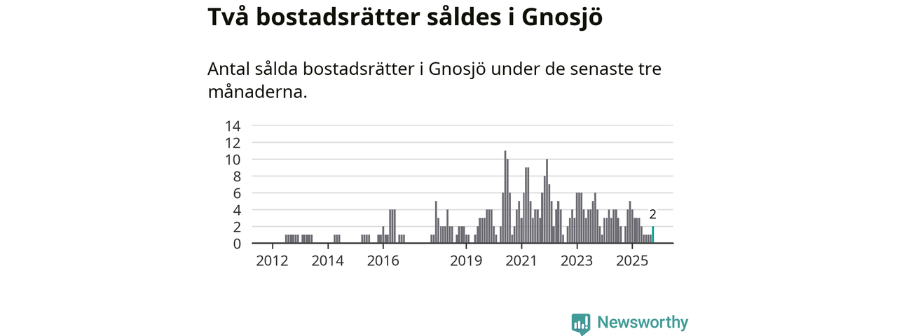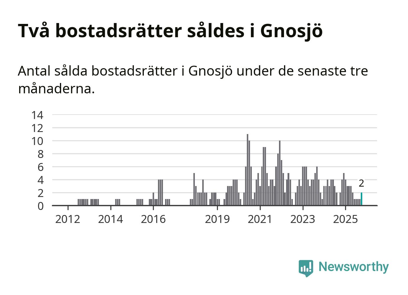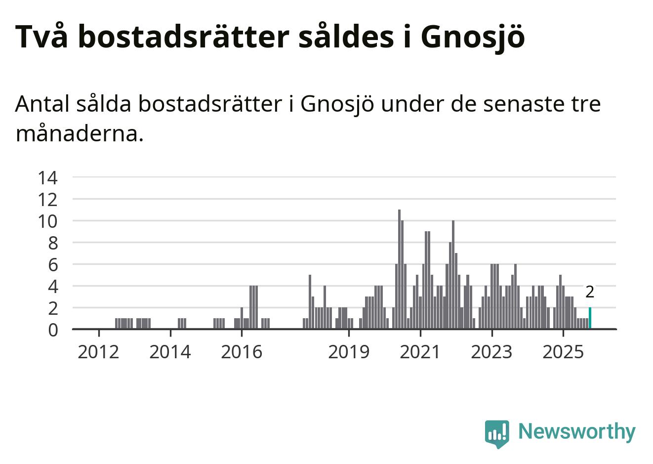 Mellan augusti och oktober gjordes sammanlagt två affärer med bostadsrätter i Gnosjö kommun. Det är lika många affärer som vid motsvarande tid i fjol.