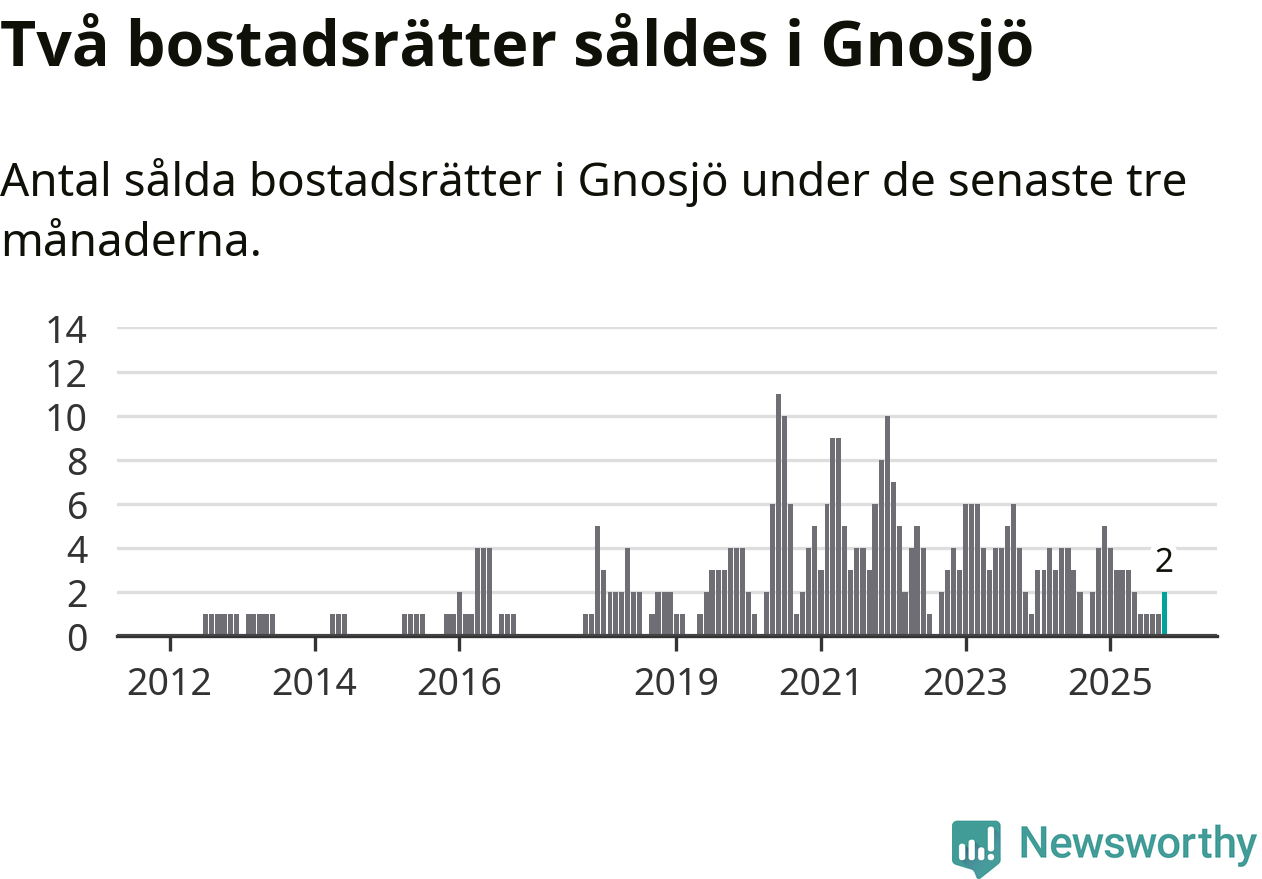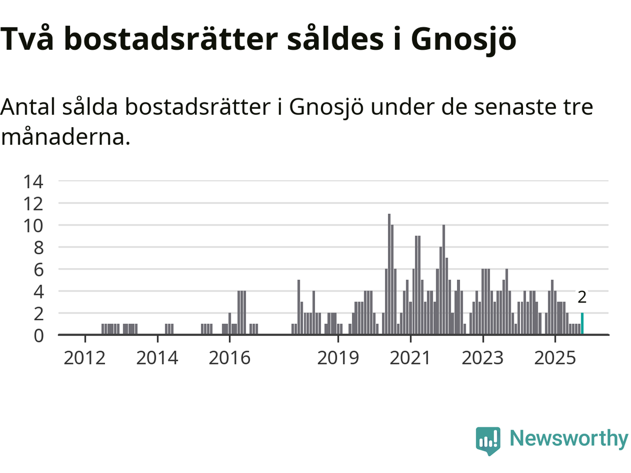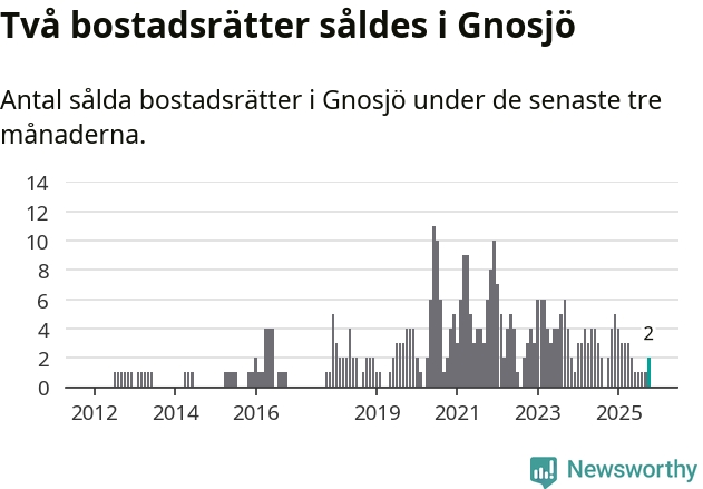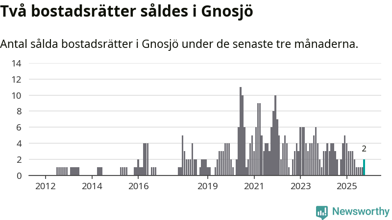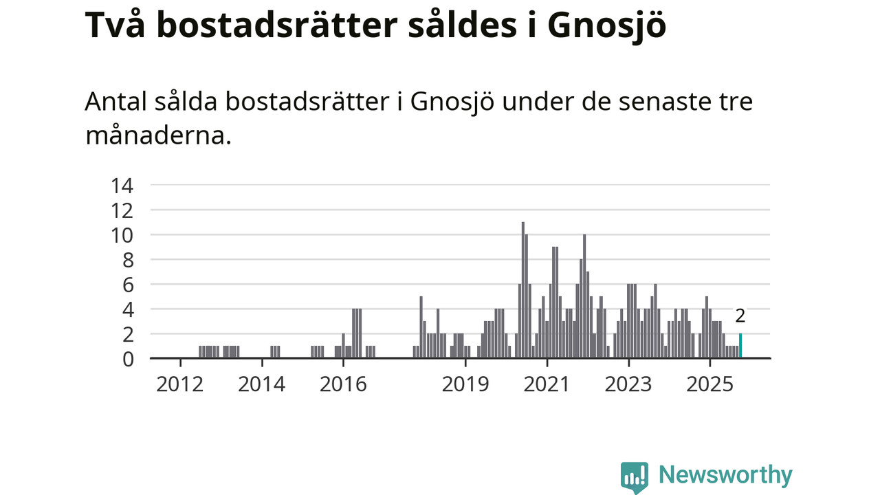 Mellan augusti och oktober gjordes sammanlagt två affärer med bostadsrätter i Gnosjö kommun. Det är lika många affärer som vid motsvarande tid i fjol.