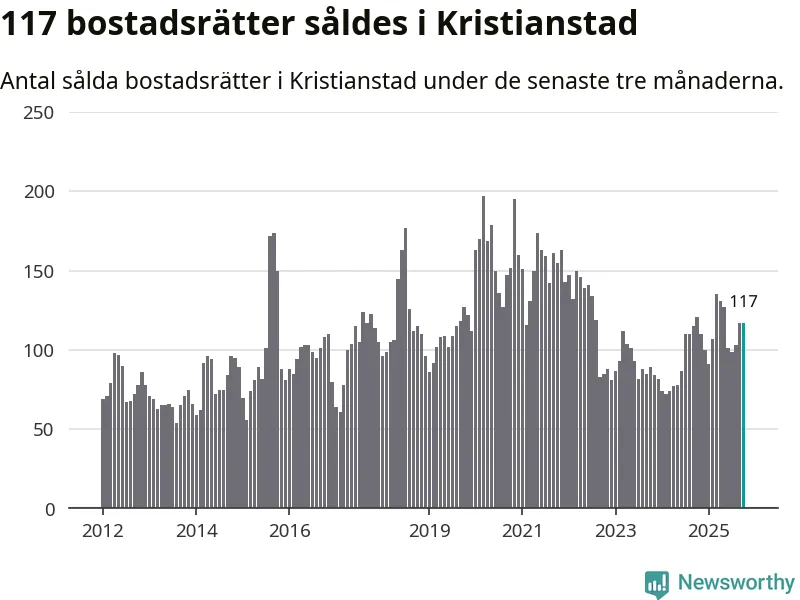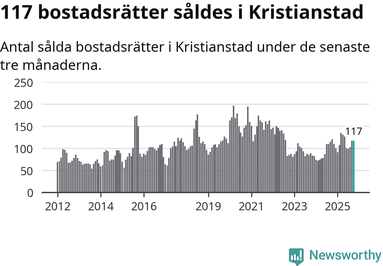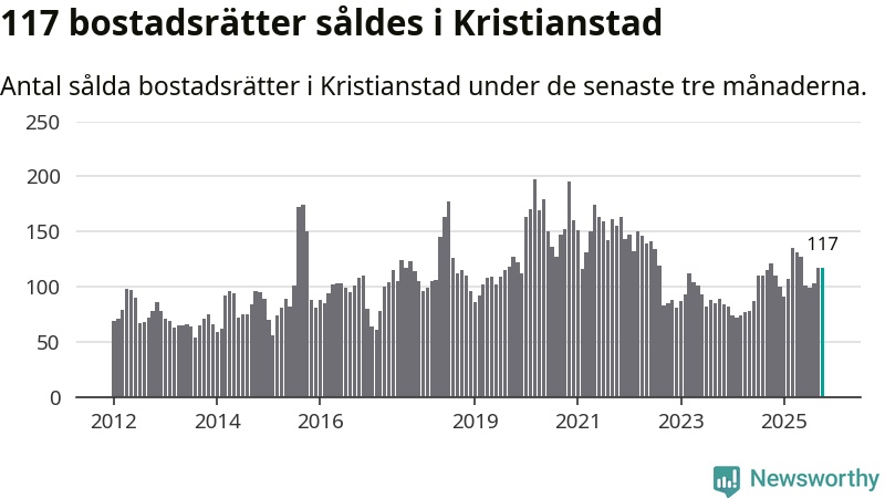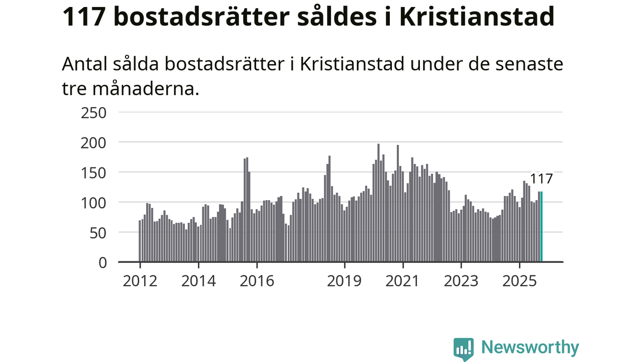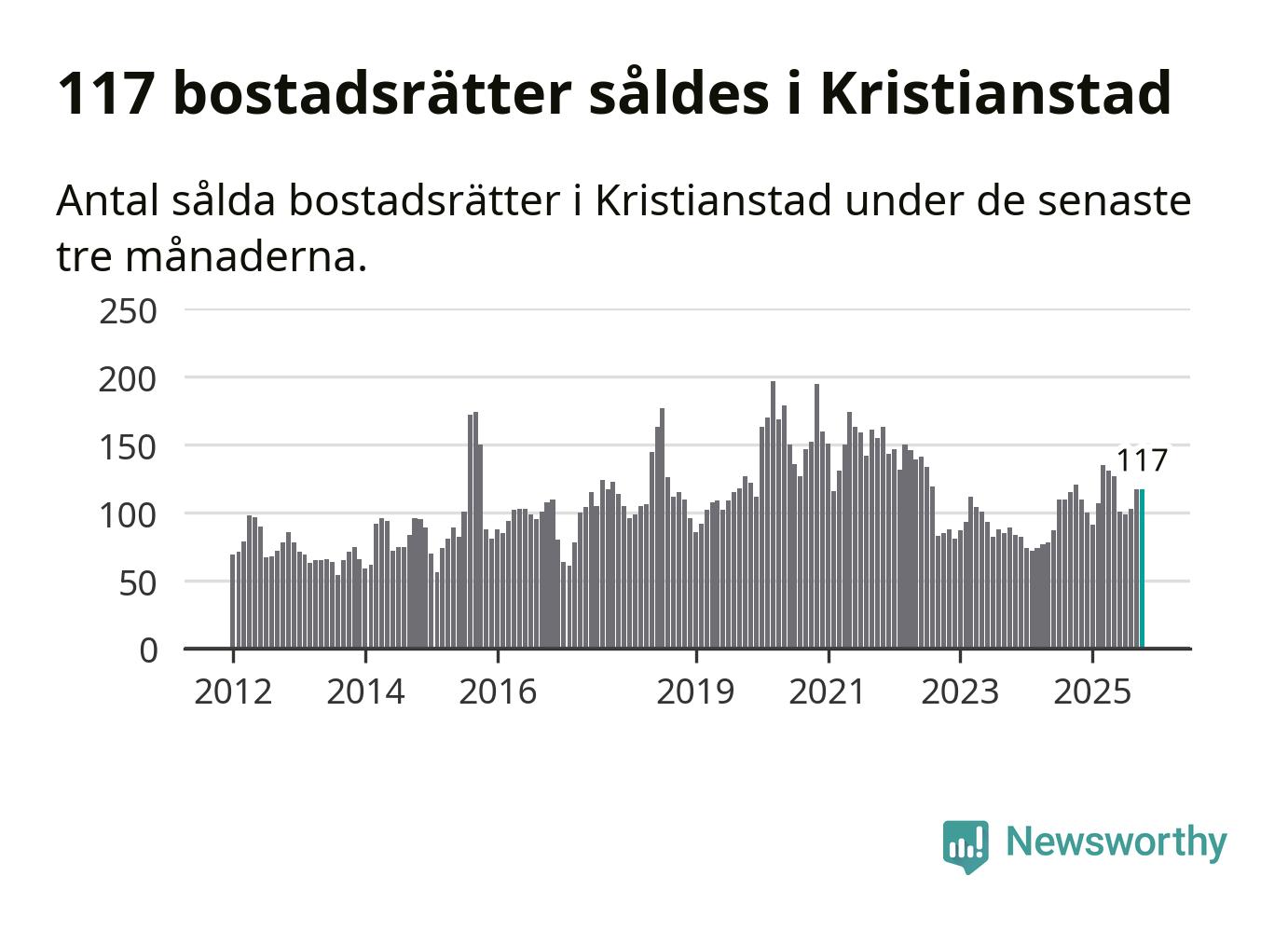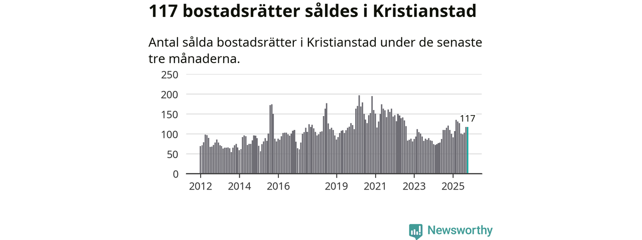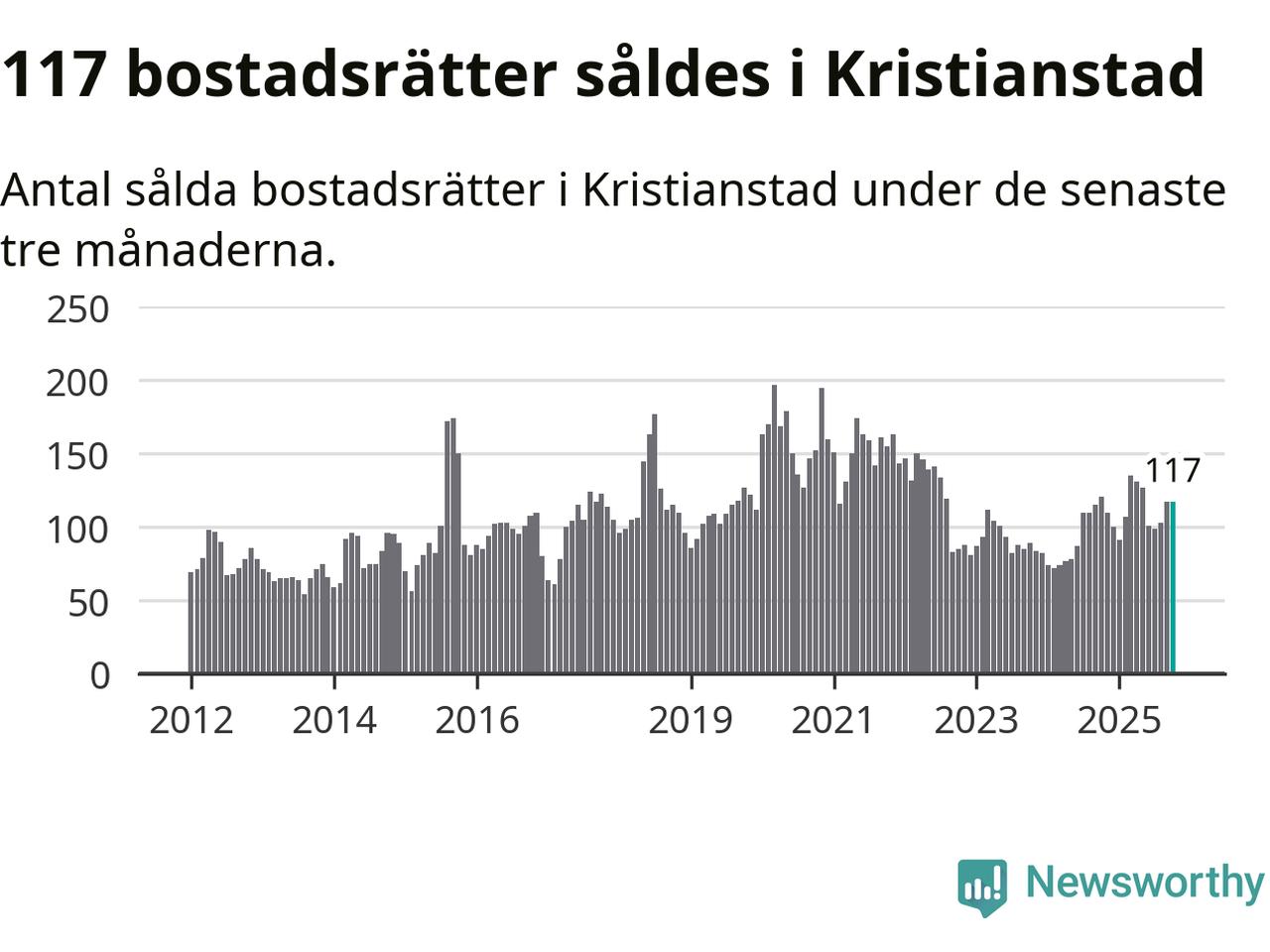 Sammanlagt såldes 117 bostadsrätter i Kristianstads kommun mellan augusti och oktober till ett genomsnittligt pris på 1,3 miljoner kronor. I fjol gjordes 121 affärer vid den här tiden på året.