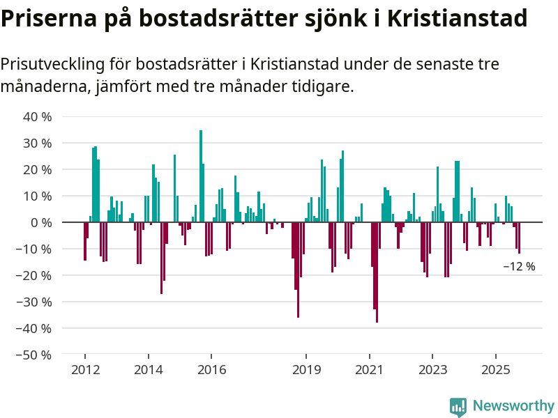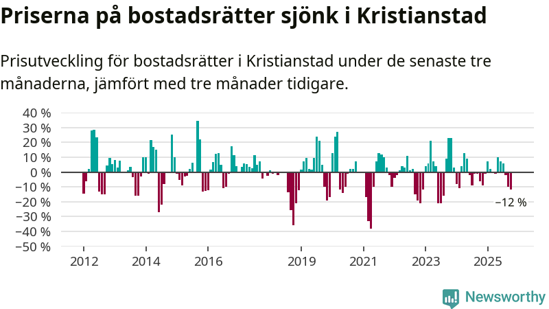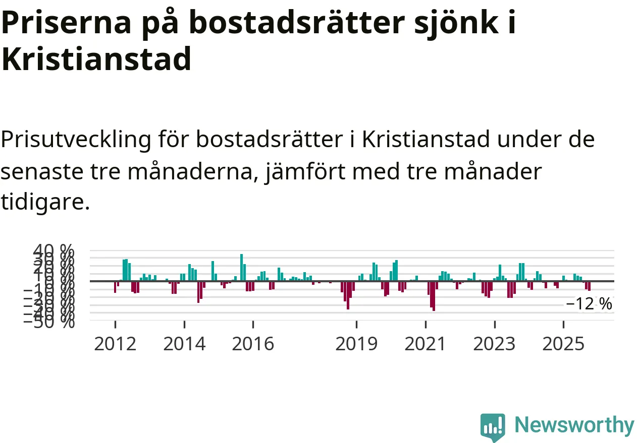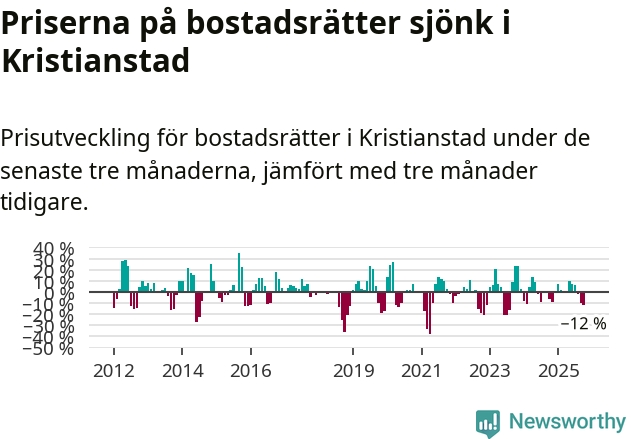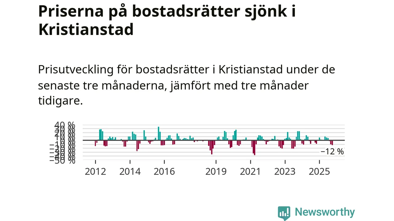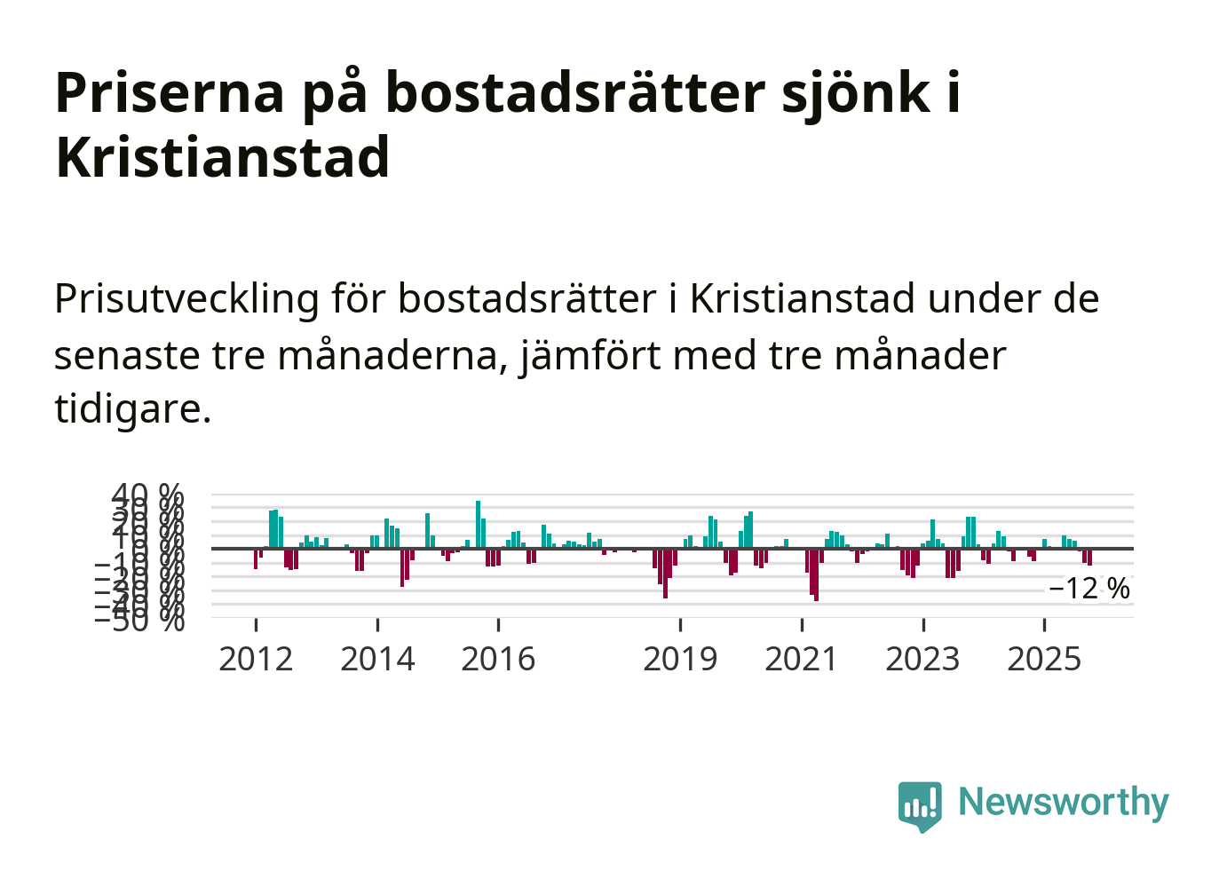 Priserna på bostadsrätter har gått ner i Kristianstads kommun. Medelpriset på försäljningarna under de senaste tre månaderna visar på en nedgång med 12 procent.