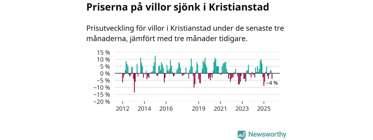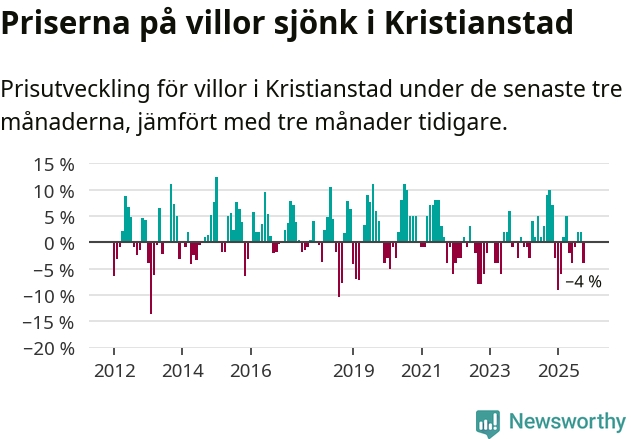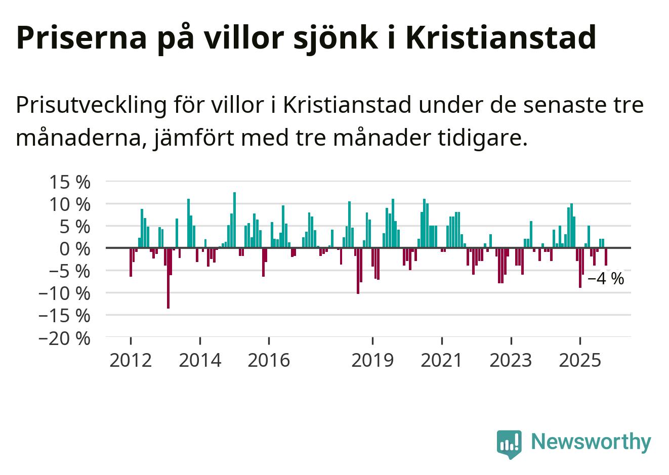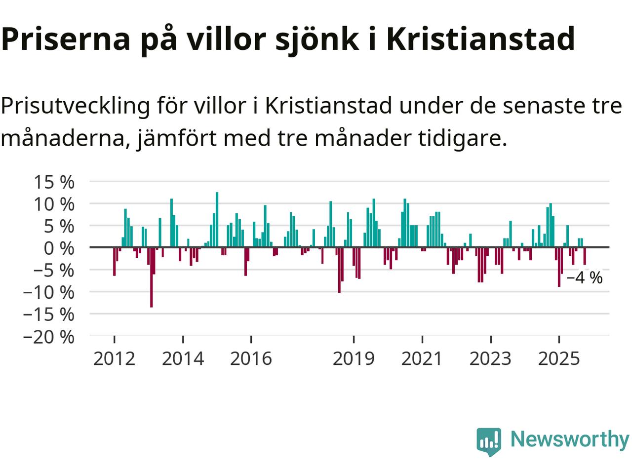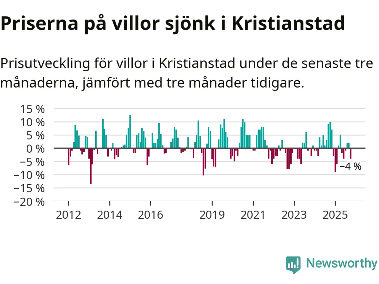 Villapriserna har gått ner i Kristianstads kommun. Medelpriset på försäljningarna under de senaste tre månaderna visar på en nedgång med 4 procent.