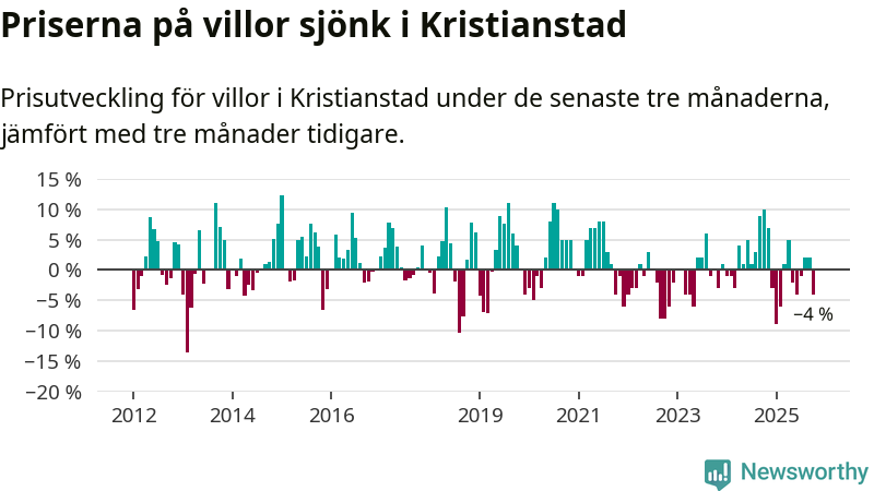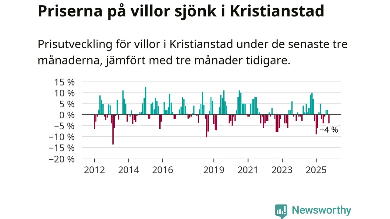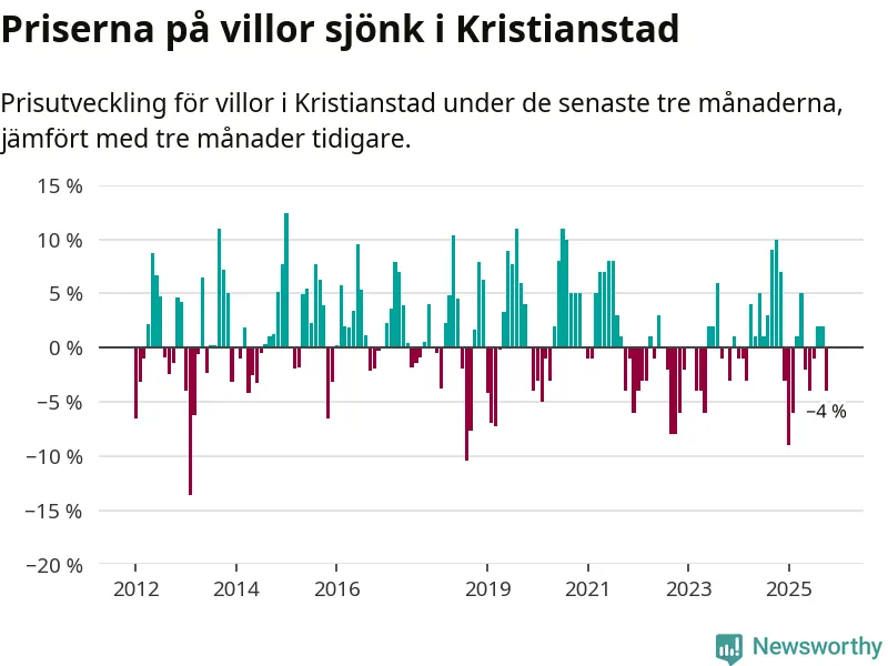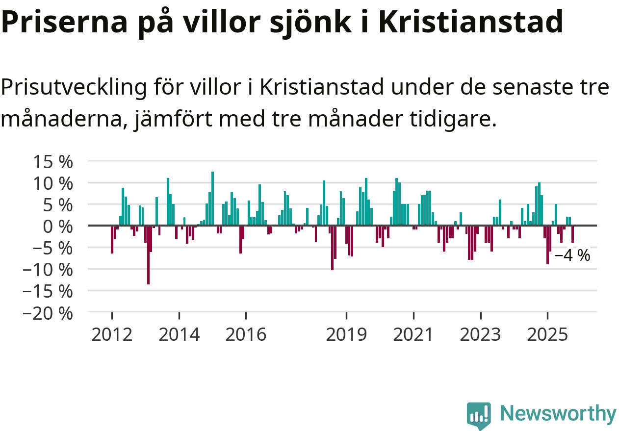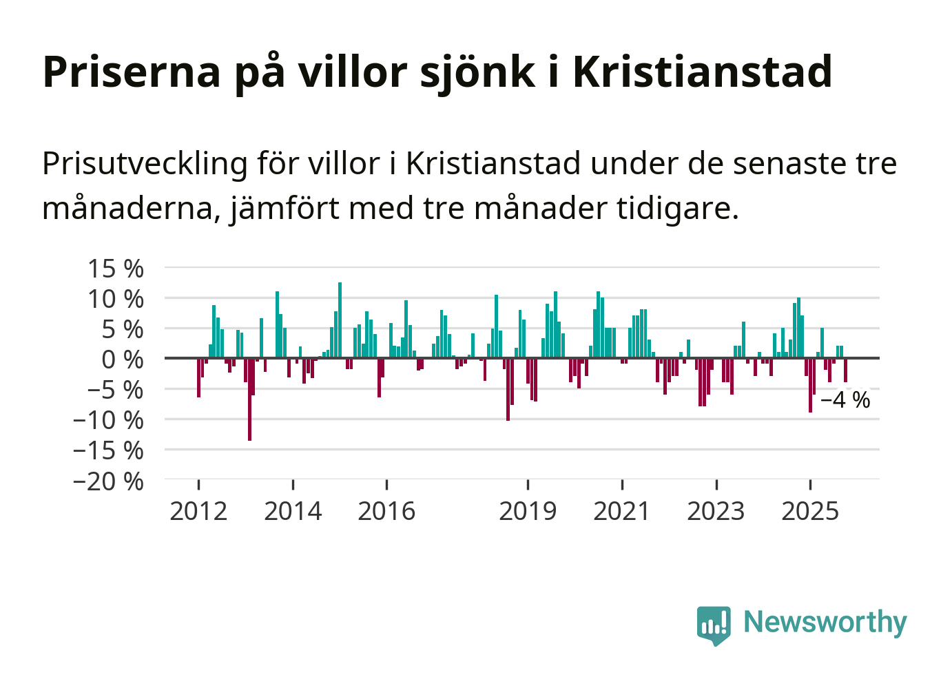 Villapriserna har gått ner i Kristianstads kommun. Medelpriset på försäljningarna under de senaste tre månaderna visar på en nedgång med 4 procent.