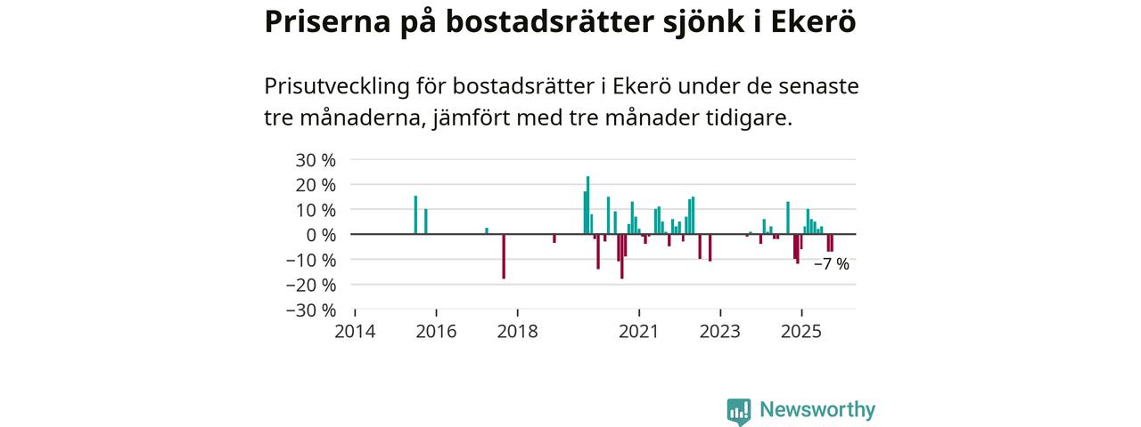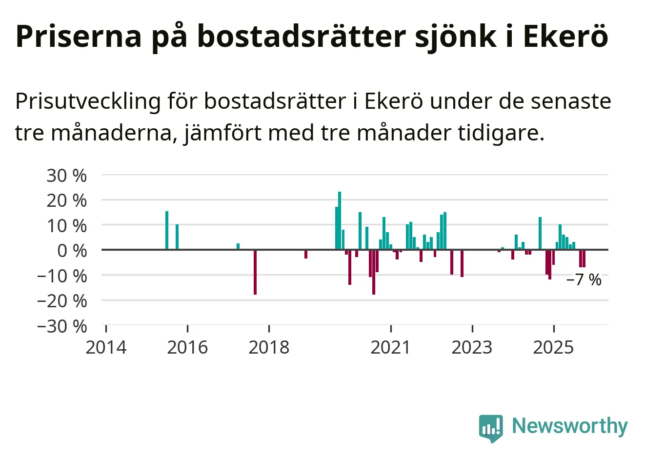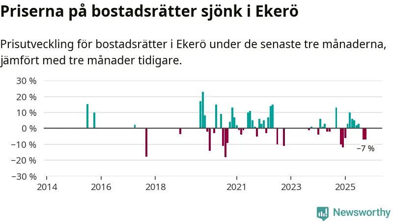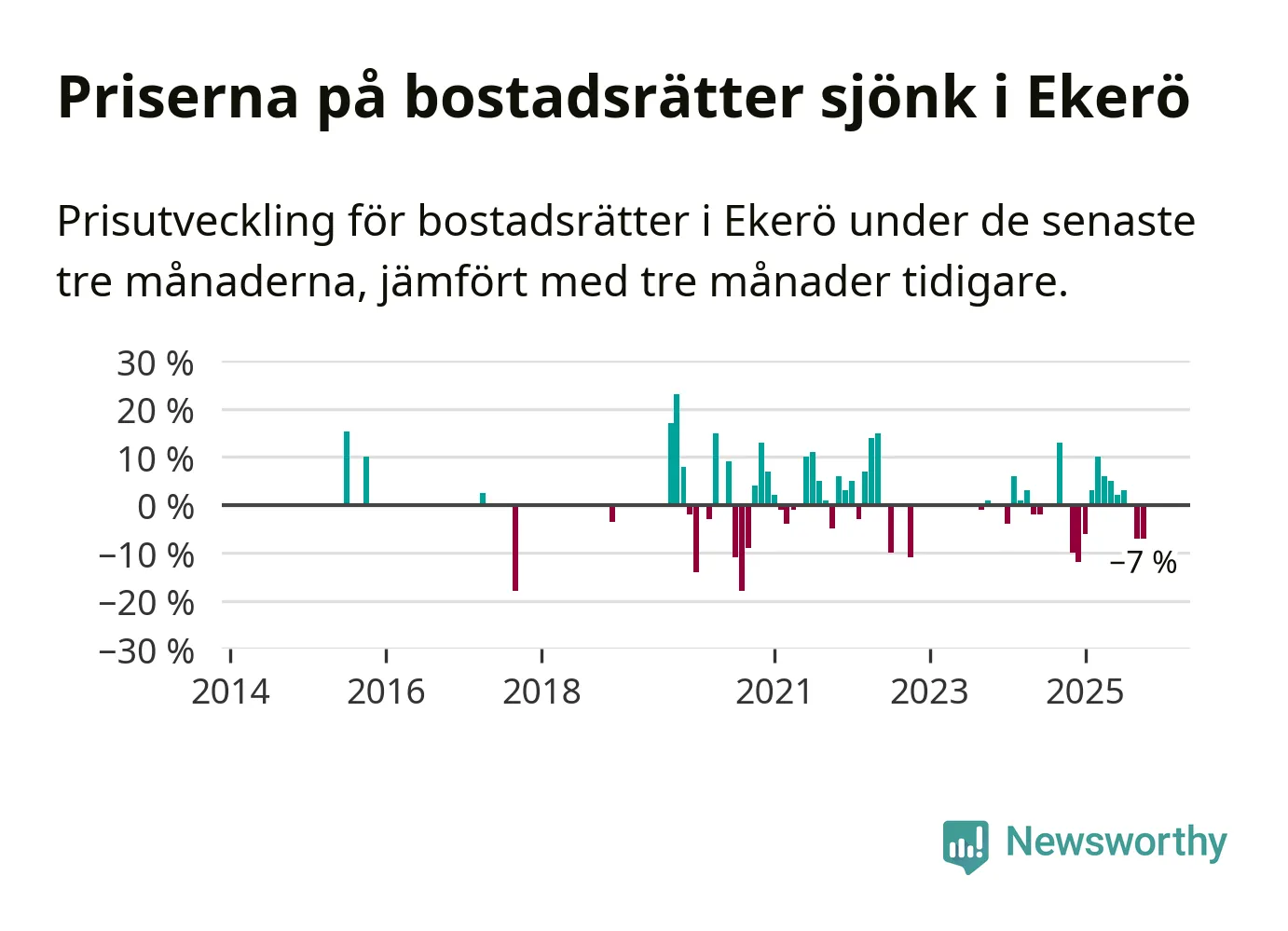 Statistiken visar även på en kännbar prisnedgång i Ekerö kommun. Medelpriset på försäljningarna av bostadsrätter i kommunen var 7 procent lägre än för tre månader sedan. I hela Stockholms län däremot ökar priserna på bostadsrätter. I hela länet noterades en prisuppgång på 4 procent.