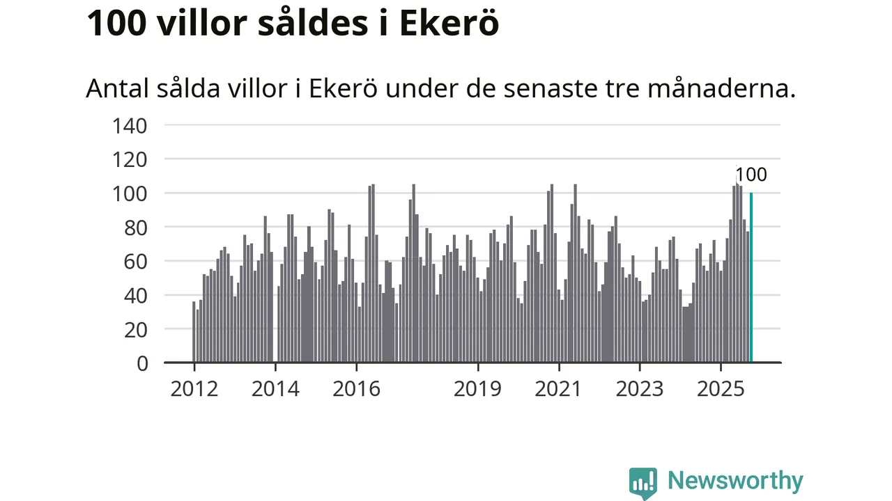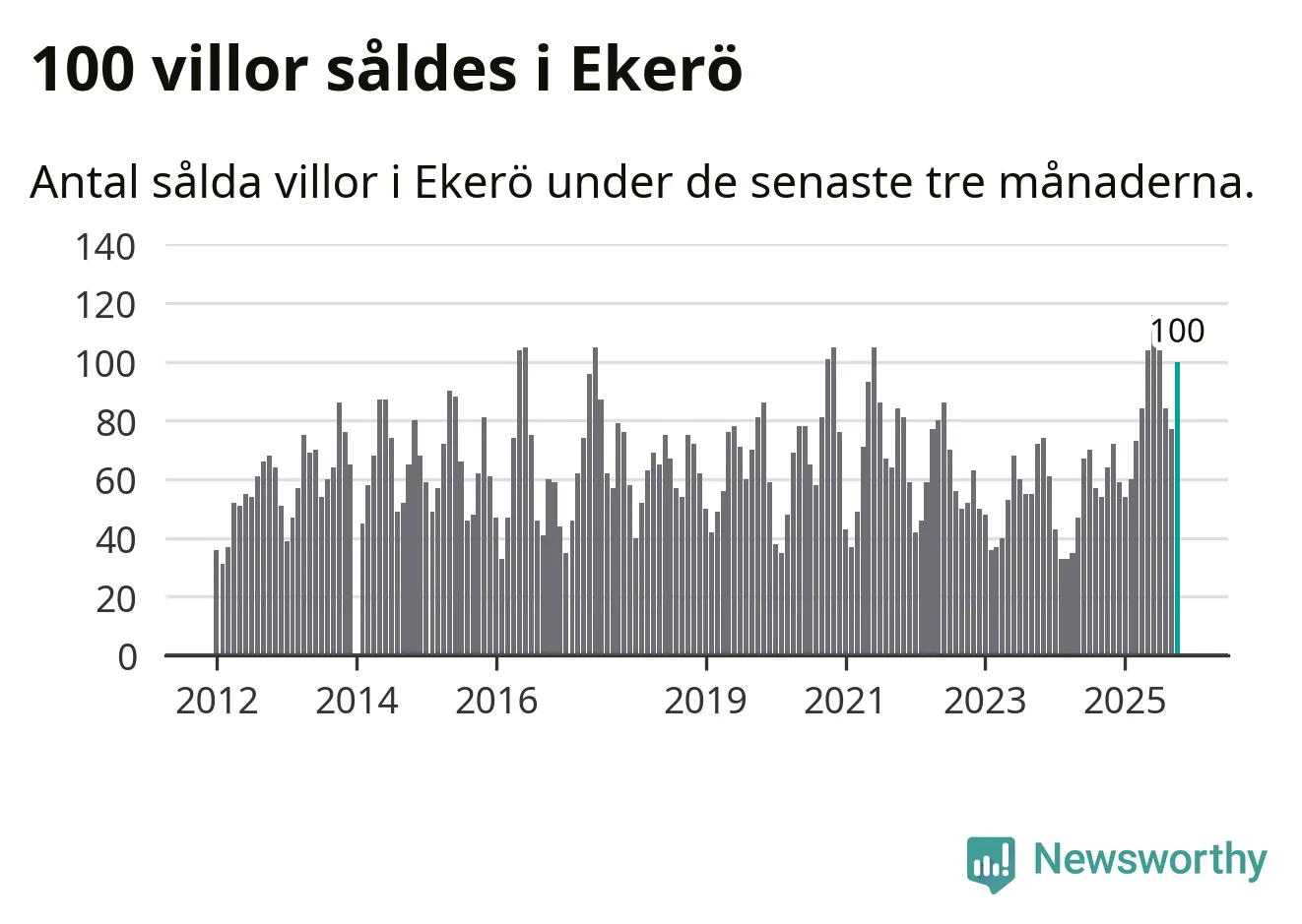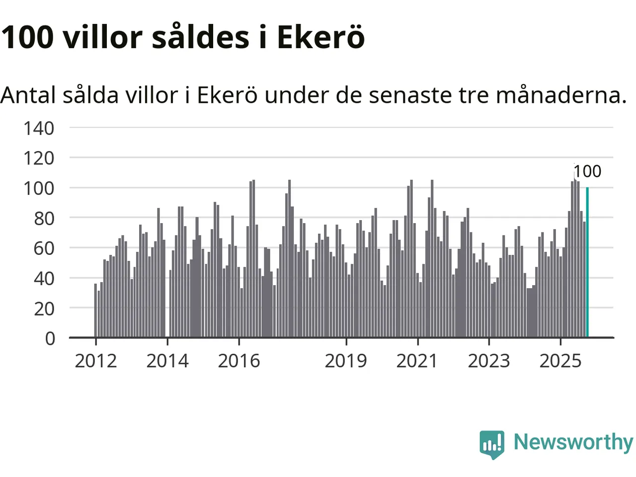 Sammanlagt såldes 100 villor i Ekerö kommun mellan augusti och oktober till ett genomsnittligt pris på 7,2 miljoner kronor. I fjol gjordes 64 affärer vid den här tiden på året.